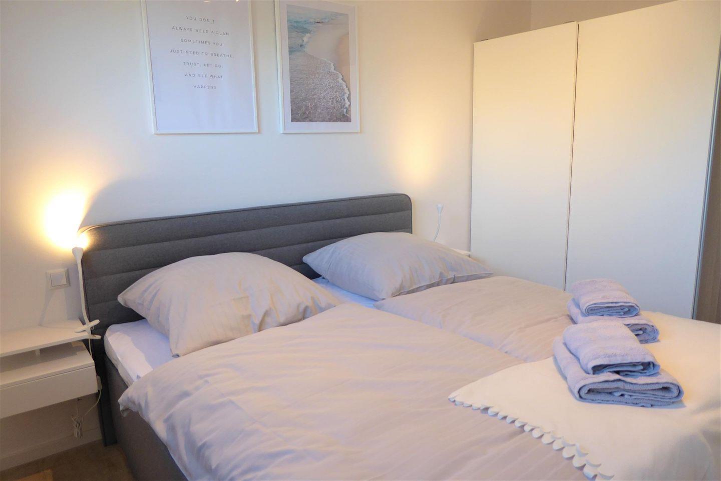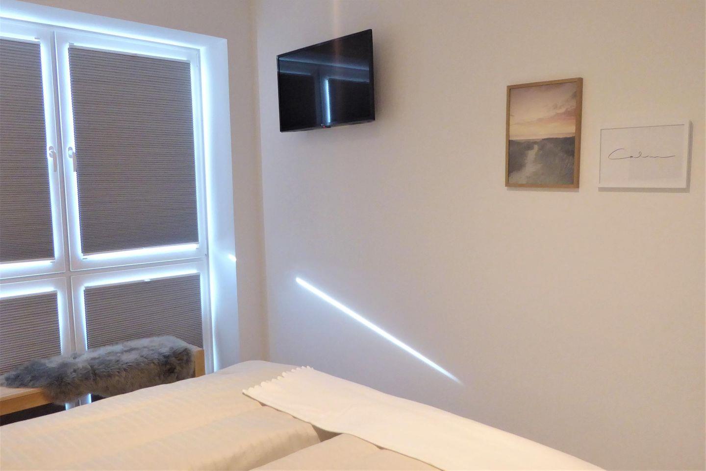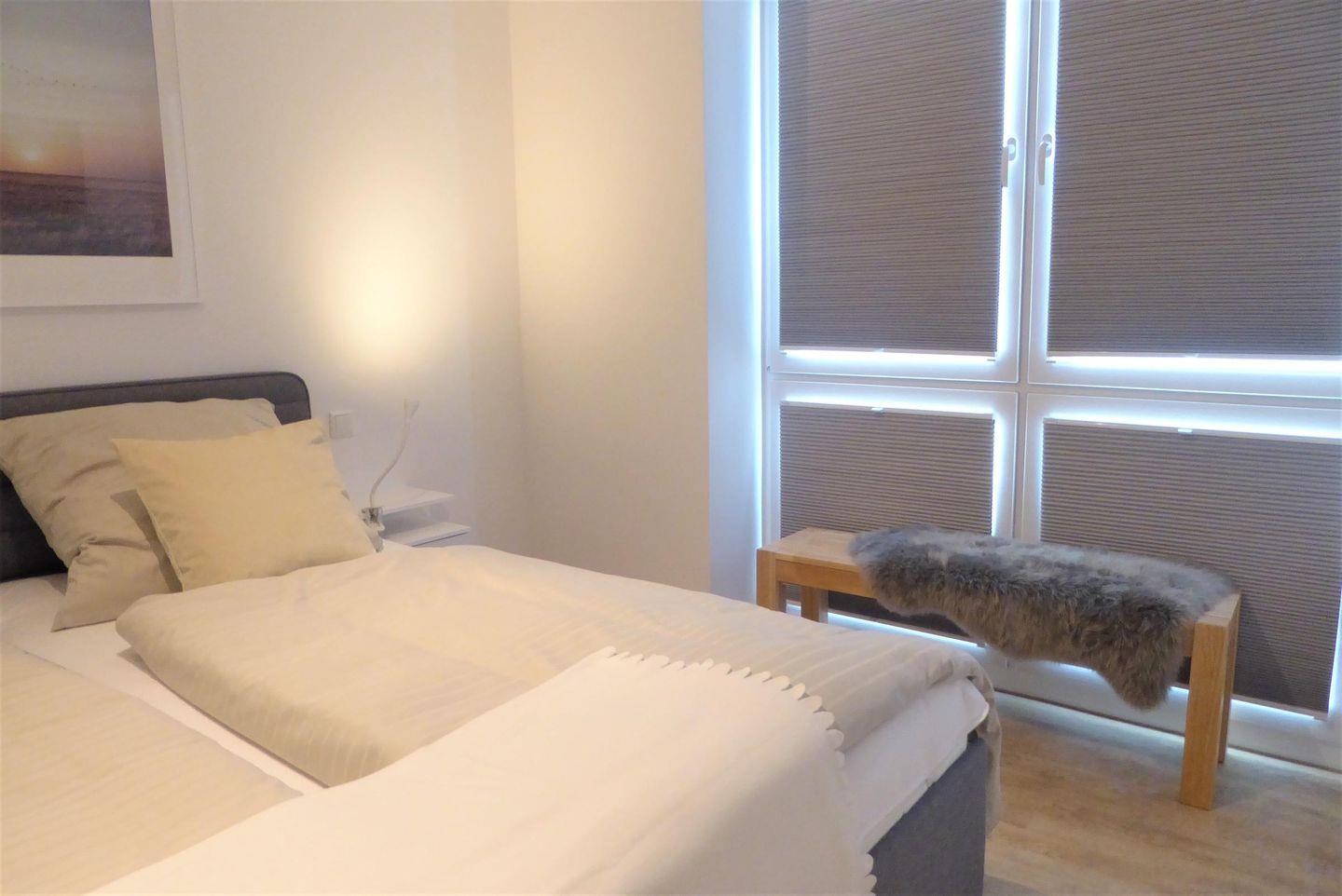 Schlafzimmer 2 (1. OG): Doppelbett (Maße: 180 x 200 cm), Nachttische, Leselampen, Kleiderschrank, Smart-TV, Sitzbank, Verdunklungsmöglichkeit