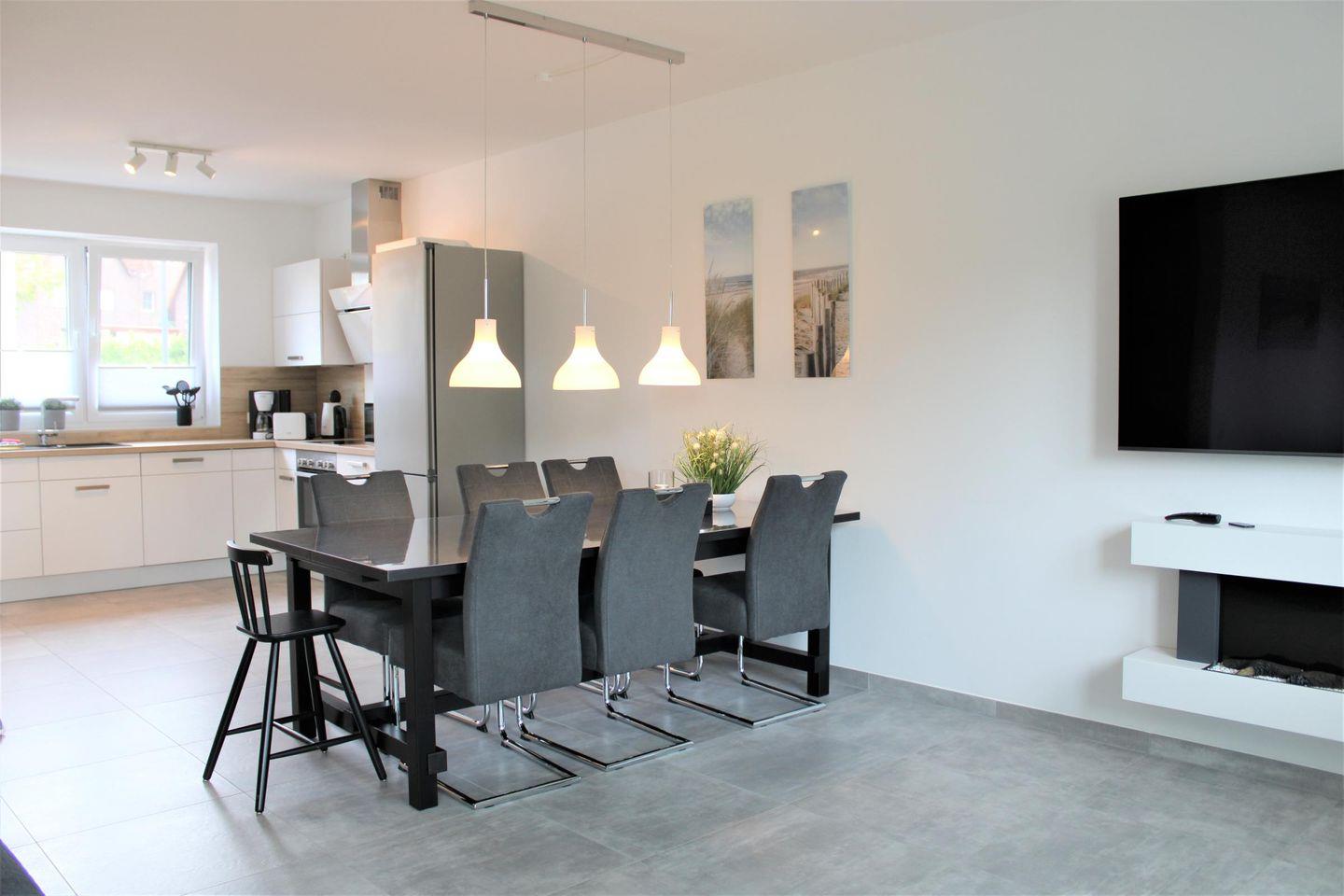 Für bis zu sechs Personen steht Ihnen eine komplett ausgestattete Küche sowie ein großzügiger Wohn-Essbereich mit großer Südterrasse im Erdgeschoss zur Verfügung. Ebenfalls befindet sich im Erdgeschoss ein modernes Duschbad, in dem Sie direkt Ihre "Schlickfüße" reinigen können. Auch auf Ihre Lieblingsserien müssen Sie im Urlaub nicht verzichten. Beim Feuer des Elektrokamins können Sie es sich auf der großzügigen Sofalandschaft gemütlich machen und über den Smart TV Ihr Wunschprogramm genießen.
