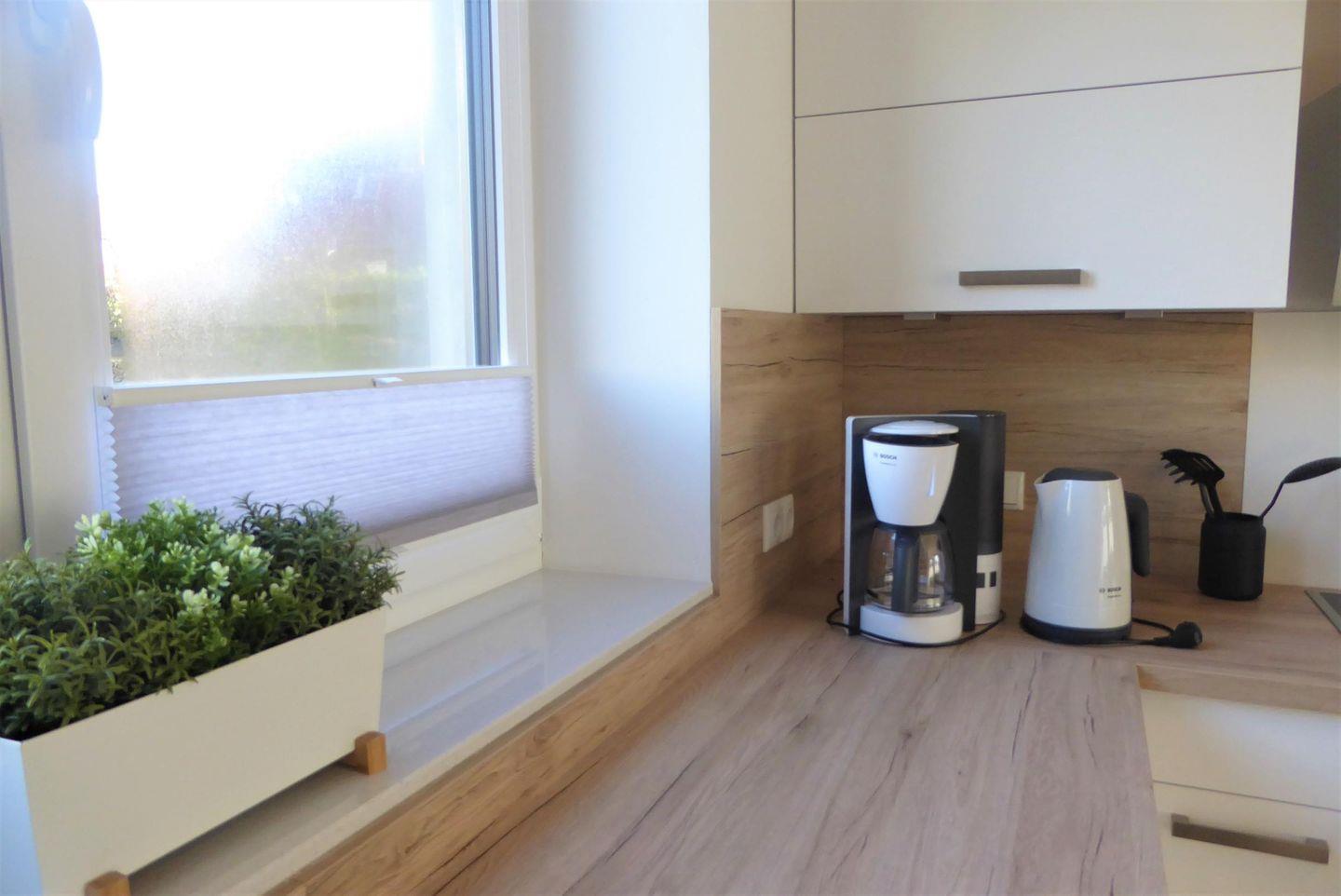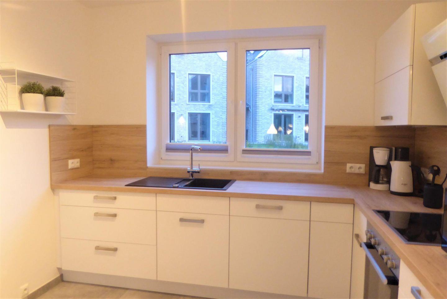 Küche und Haushalt: Einbauküche, Kühlschrank mit Gefrierfach, 4-Zonen Cerankochfeld, Backofen, Dunstabzugshaube, Mikrowelle, Geschirrspüler, Kaffeefiltermaschine, Toaster, Wasserkocher, Eierkocher, hochwertiges Geschirr und Besteck, diverse Küchenutensilien