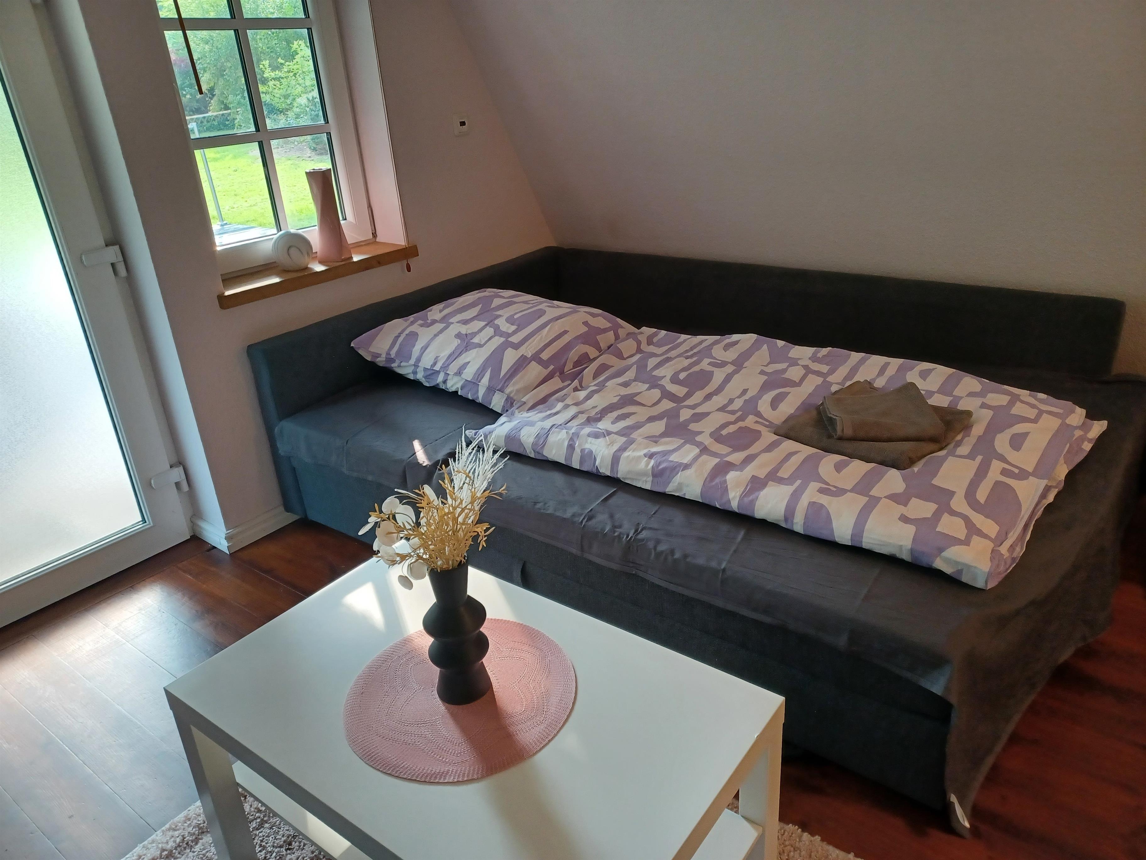 2 Etagen mit Treppe, 1 Schlafzimmer, 1 Wohnzimmer mit offener Küche, 1 Bad