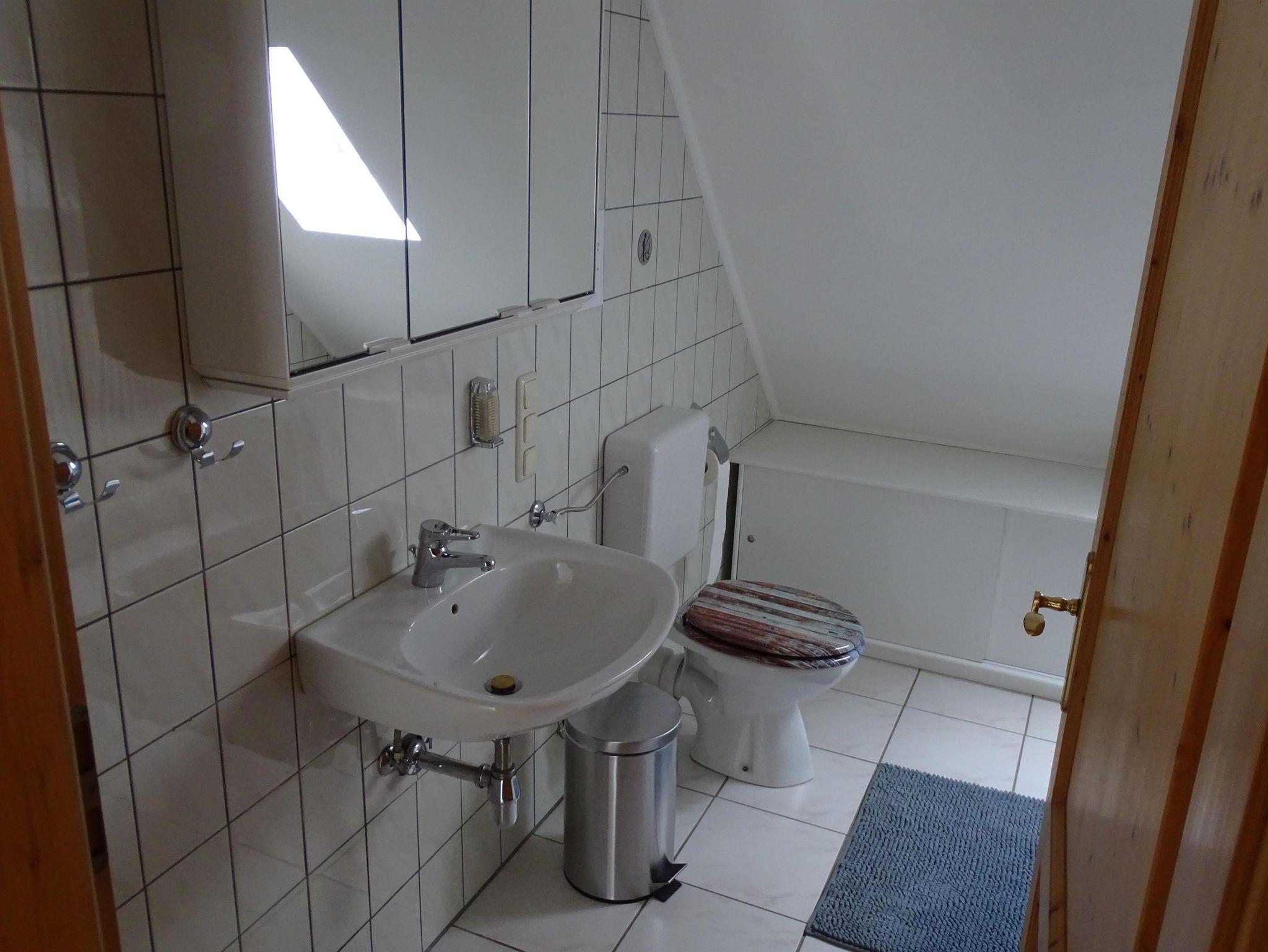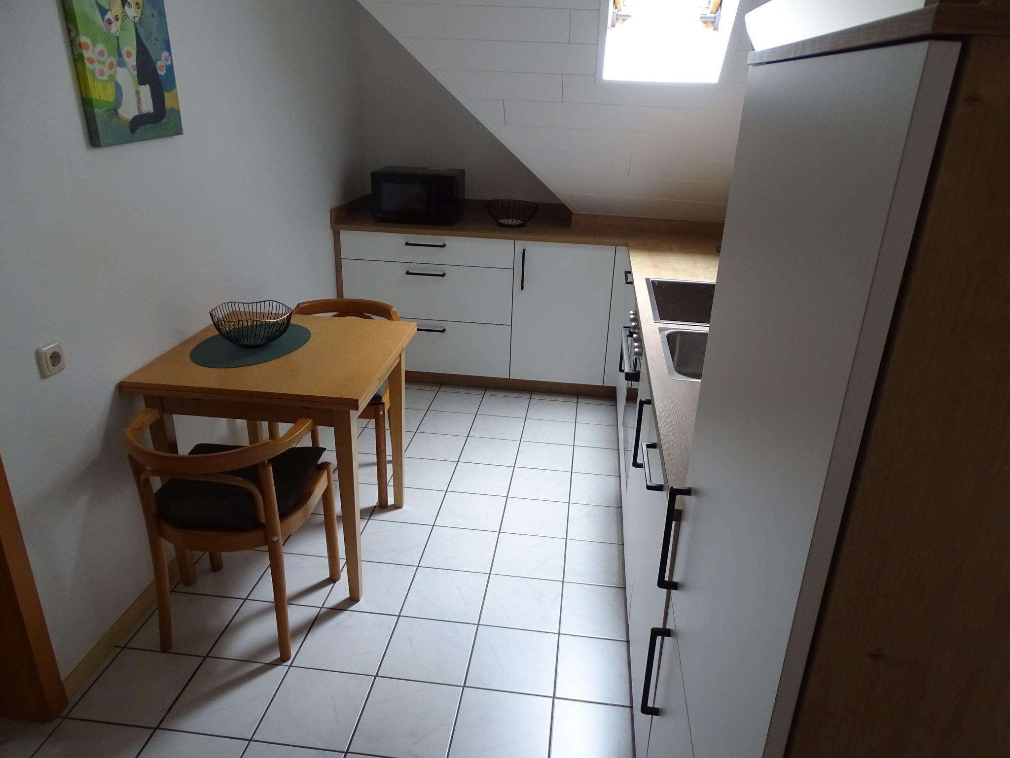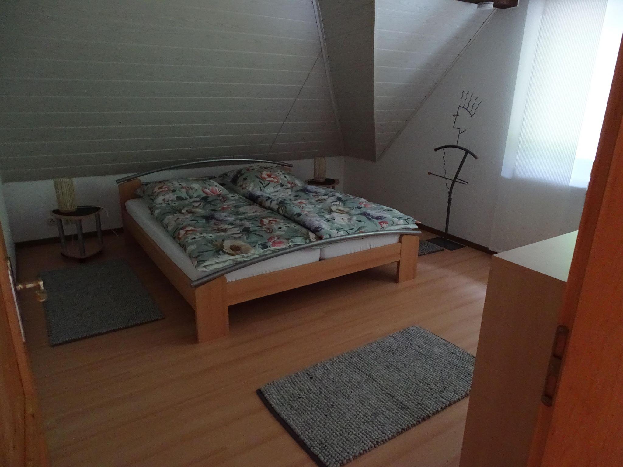 Ferienwohnung mit seperaten Eingang, Treppenhaus, zwei Schlafzimmer mit jeweils zwei Betten,eine Küche,ein Badezimmer und ein Wohn und Essbereich.
