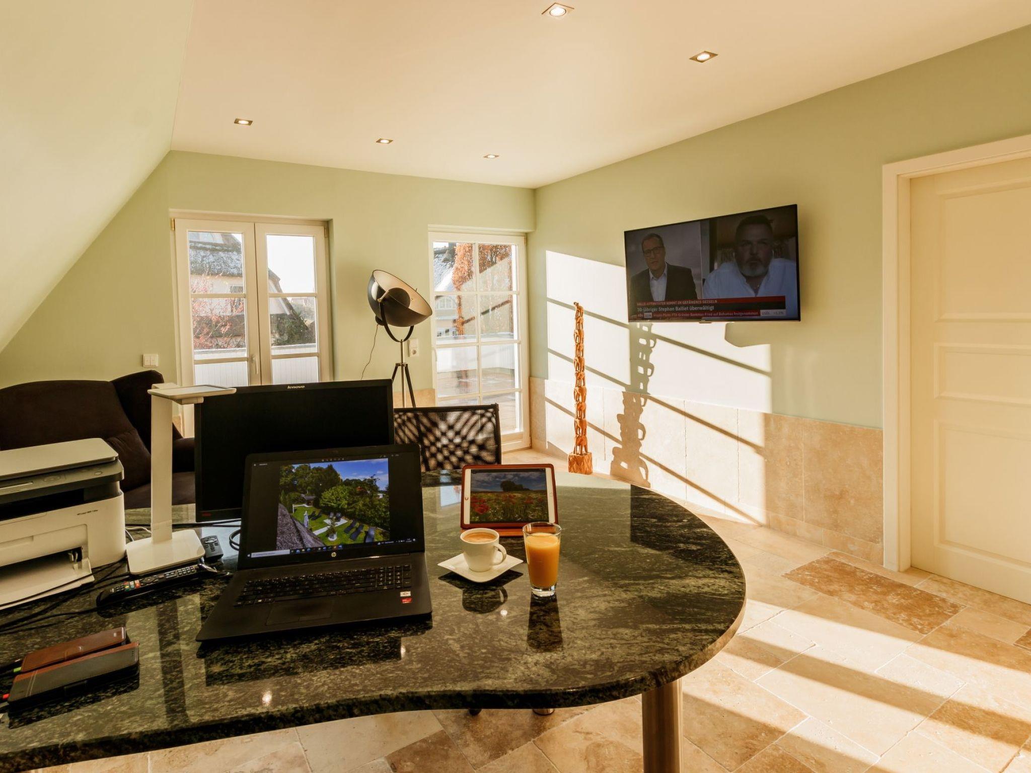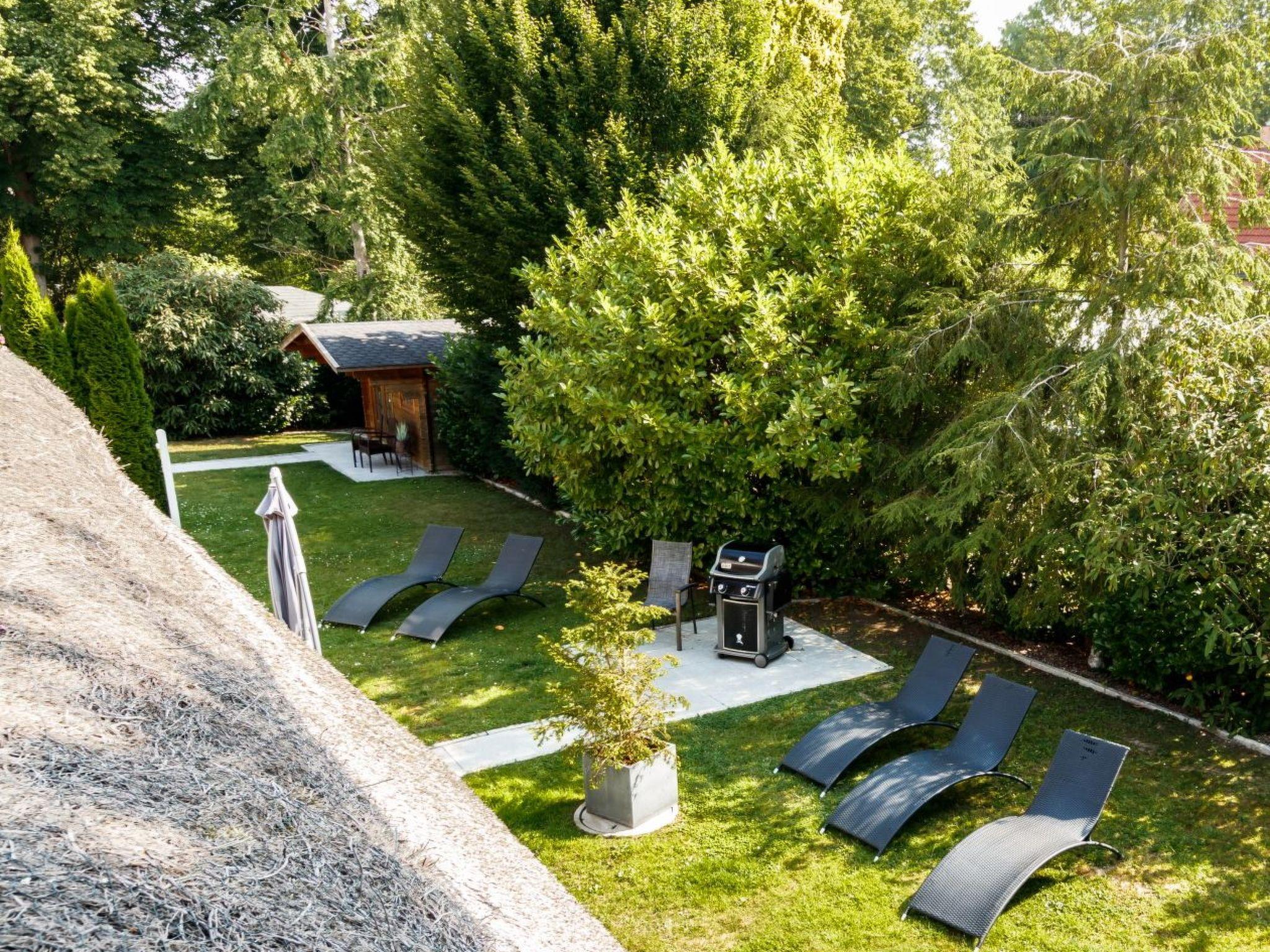 Der äußere Bereich unterstreicht mit fünf Terrassen, sonnigen Gartensitzgelegenheiten und schattigen Ruhezonen das luxuriöse Gesamtbild der Villa. Der Garten, umrahmt von alten Bäumen und sorgfältig ausgewählten Pflanzen, bietet den perfekten Ort für Erholung und Naturgenuss. Auf der großzügigen Dachterrasse können Gäste die weitläufige Landschaft und den Blick auf die Ostsee genießen, während der hochwertige Gasgrill für gesellige Abende unter freiem Himmel sorgt.