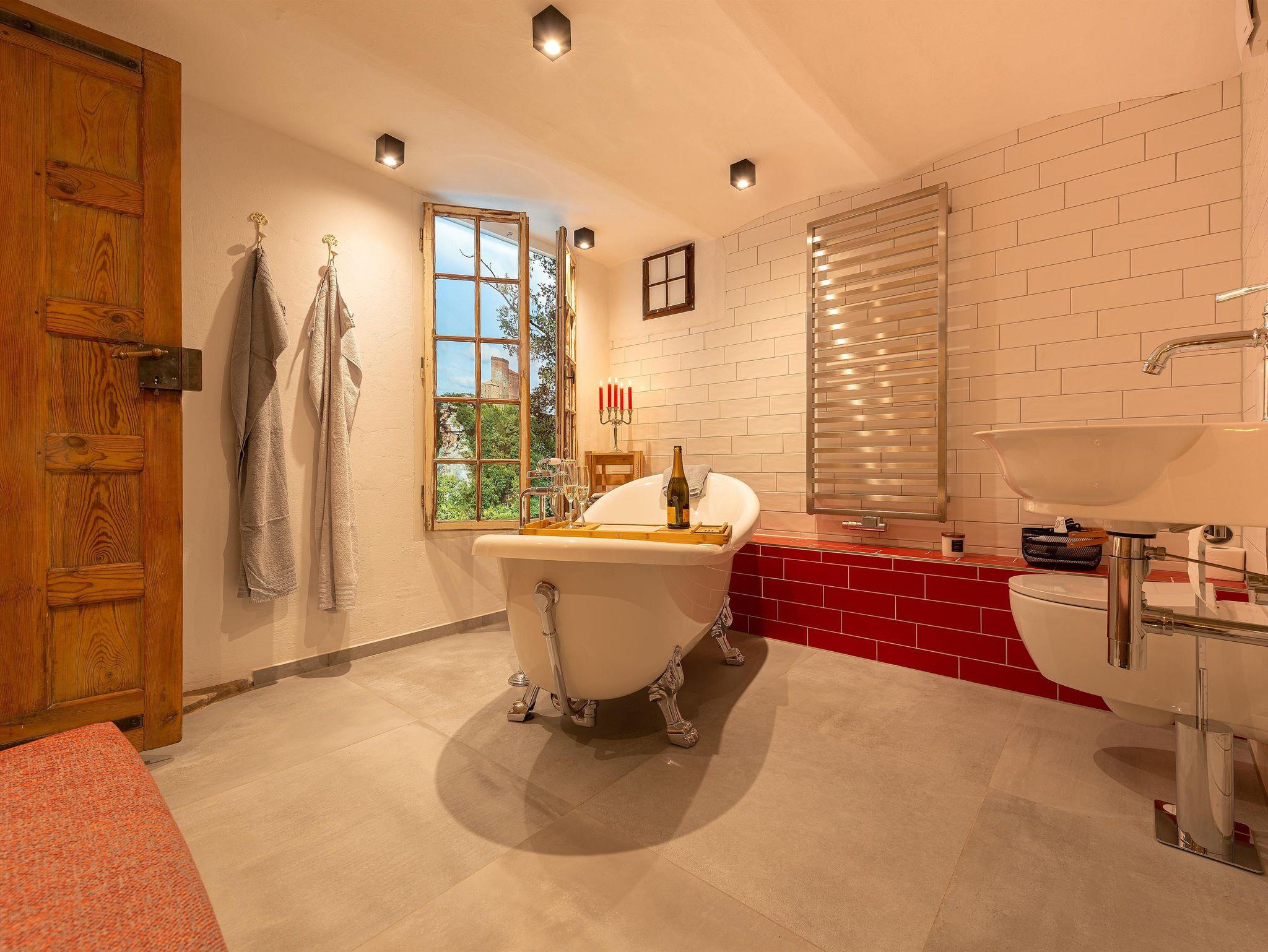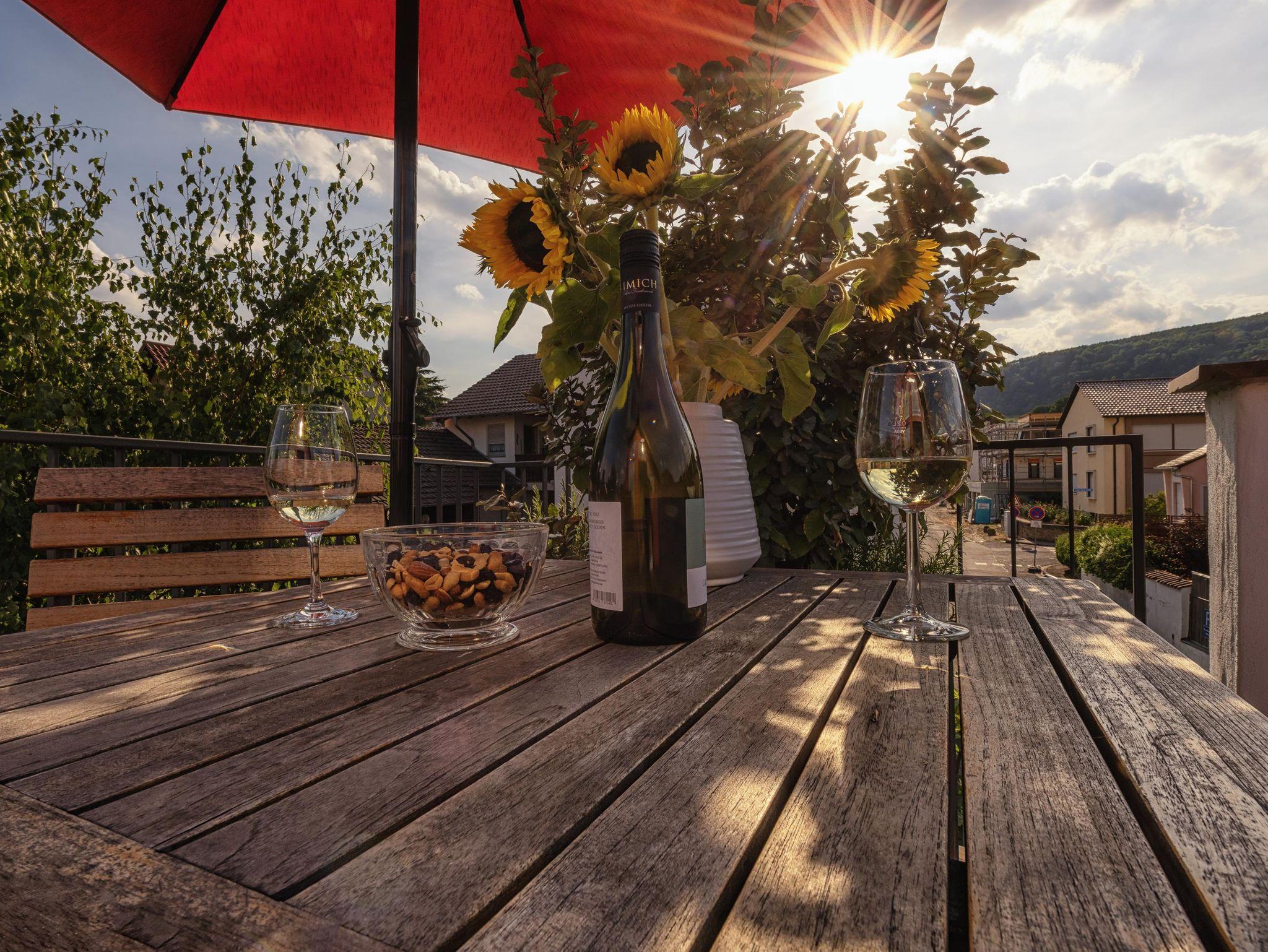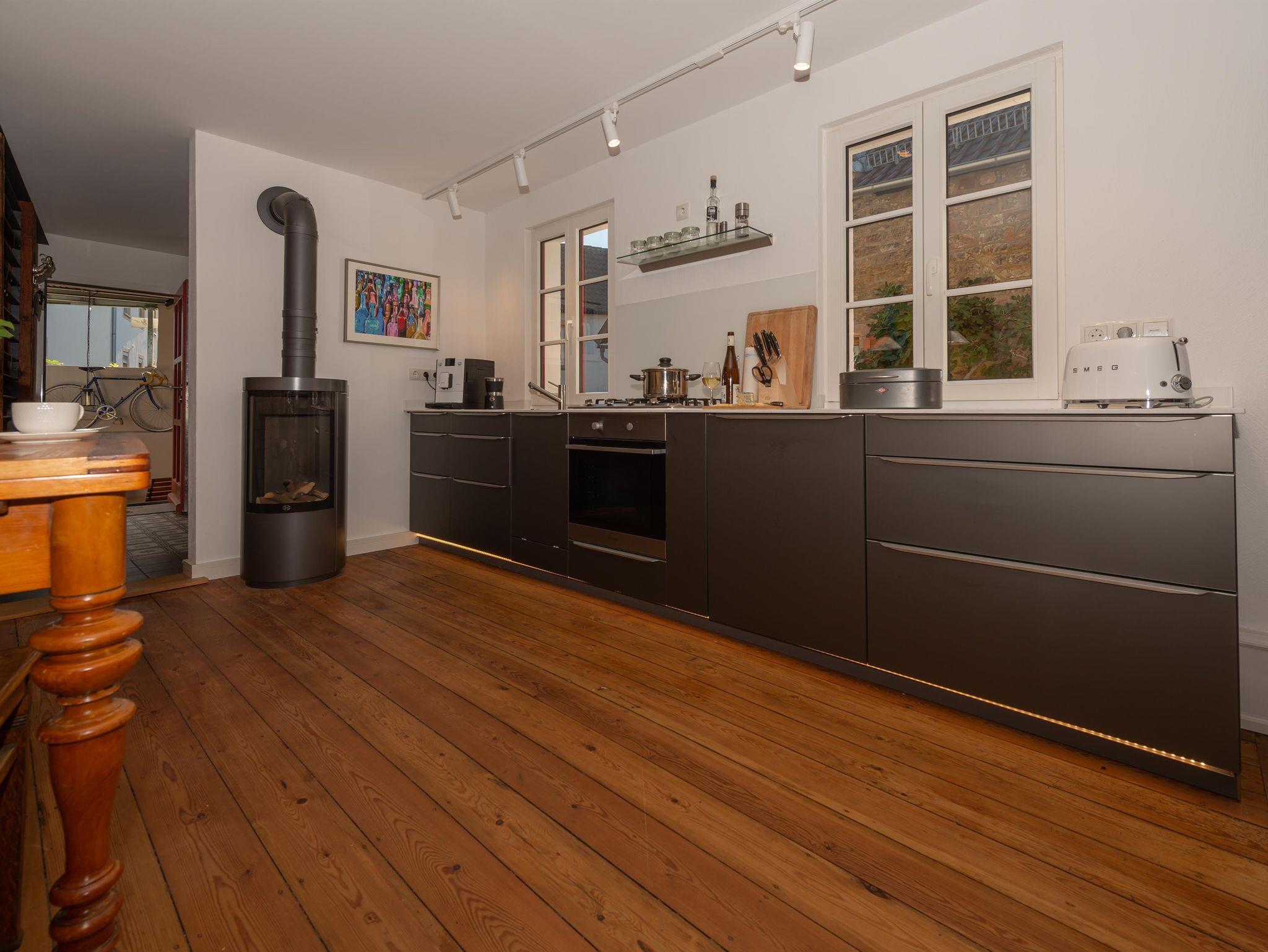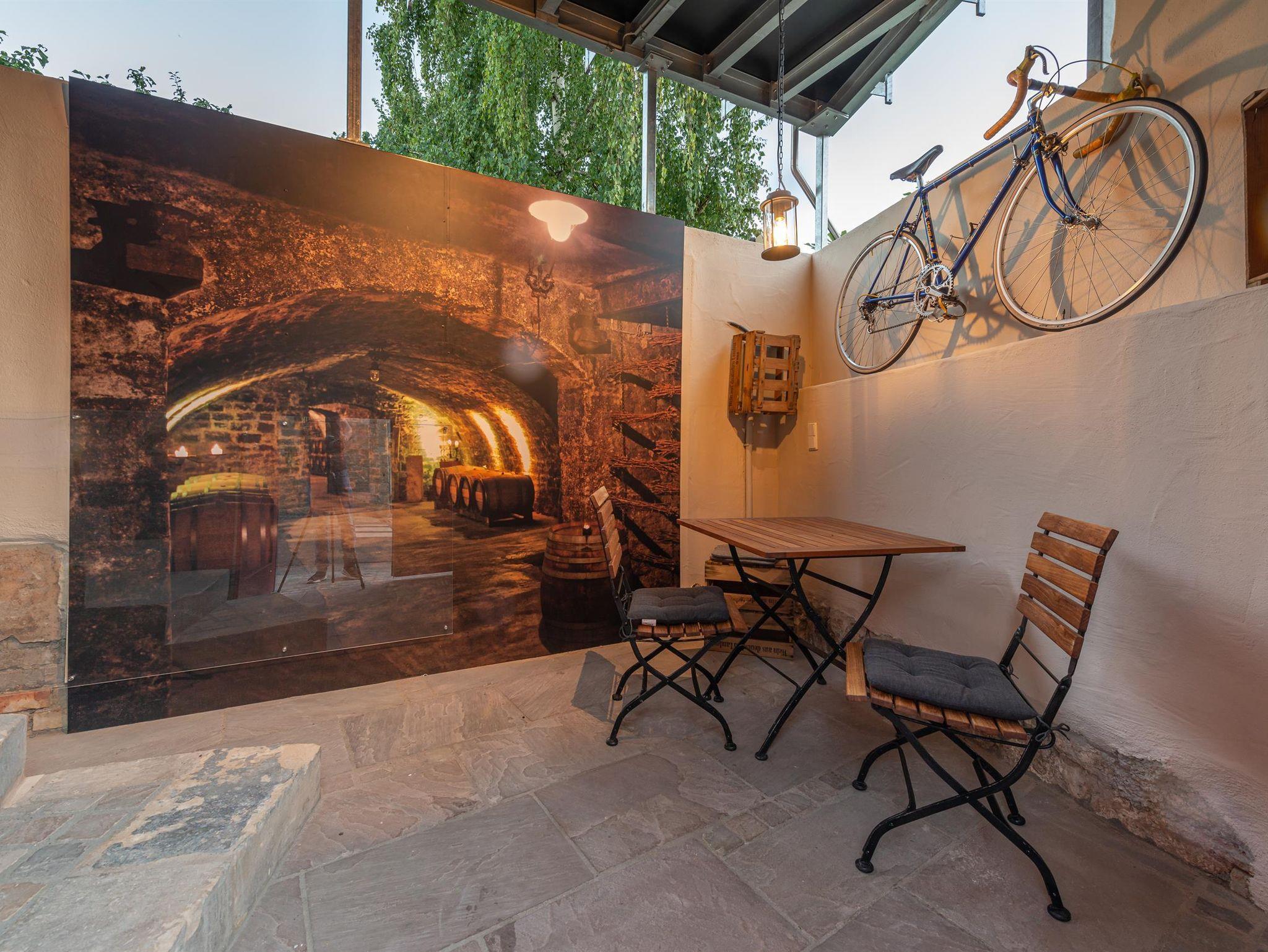 Im Sommer 2015 entdeckten wir in Deidesheim das kleine Winzerhaus. 2019 entschieden wir uns das kleine Schmuckstück für Sie von Grund auf zu sanieren. Sie werden begeistert sein! Wir haben geplant und getüftelt, um Ihnen auf kleiner Fläche jeglichen Komfort anbieten zu können. Wir waren erfolgreich: zwei Bäder, Terrasse, Klimaanalge, Sauna und Kamin. Fehlt Ihnen etwas? Nun gelangen Sie durch ein Pfälzer Tor vom überdachten Hof in das kleine Winzerhaus. Im Erdgeschoß befindet sich ein schöner gemütlicher Wohn-/Essraum mit neuer Küche. Hier können Sie je nach Temperatur, Lust und Laune ein Feuer im Gaskamin entfachen oder sich von der Klimaanlage abkühlen lassen. Im modernen Schrank mit Sofa versteckt sich ein Bett zum Ausgeklappen von 140 cm Breite. Die Treppe führt, nicht mehr ganz so steil, nach oben zur Terrasse, in ein neues Schlafzimmer mit modernem Duschbad und Sauna. Die Terrasse mit Süd/West-Ausrichtung befindet sich über dem Hof und ist mit Gartentisch, Stühlen, zwei Liegen und Sonnenschirm ausgestattet. Zum Keller führt die freigelegte Sandsteintreppe in das ebenfalls neu entstandene zweite Bad mit freistehender Badewanne.