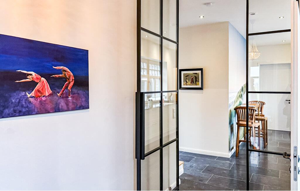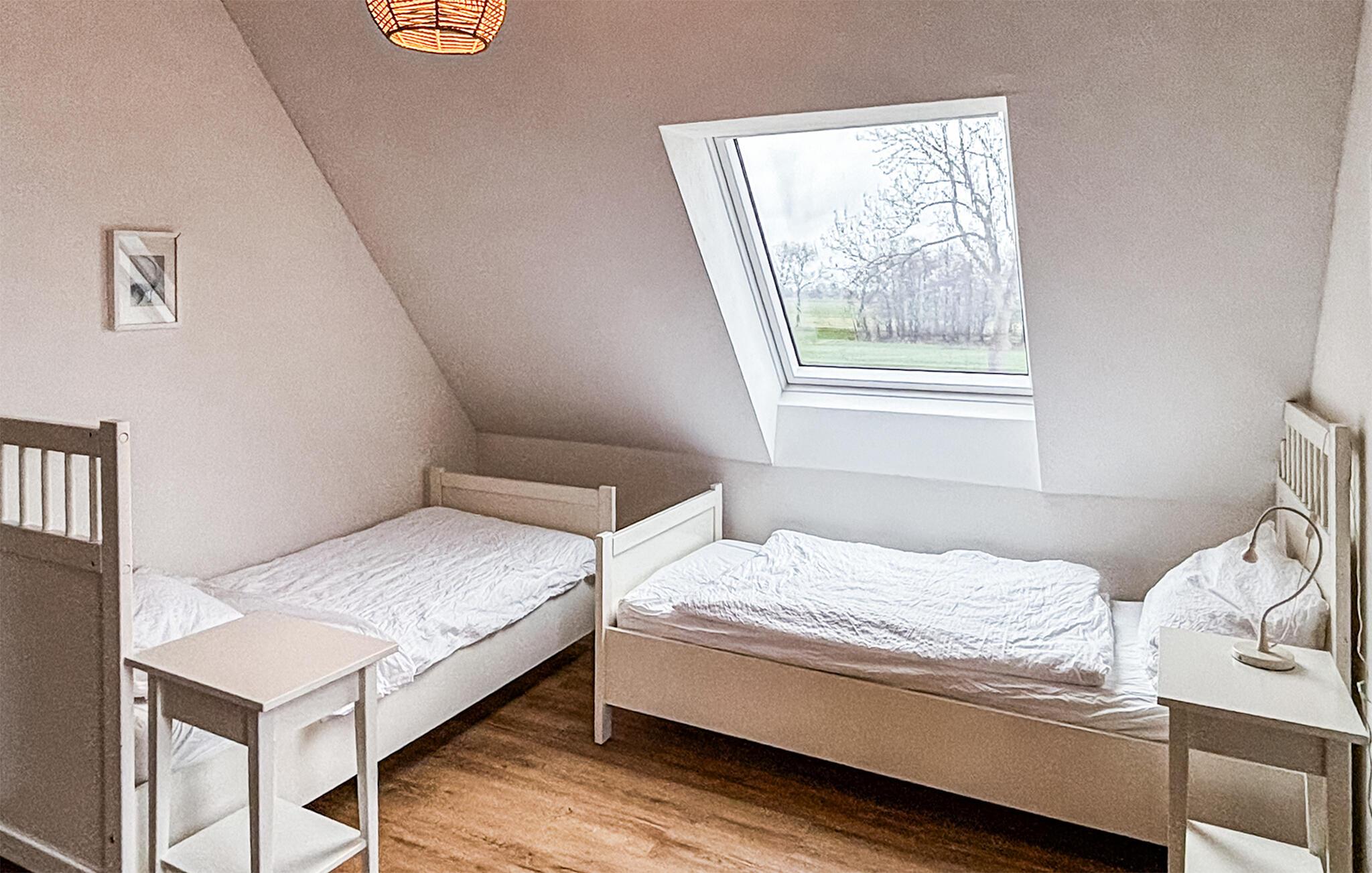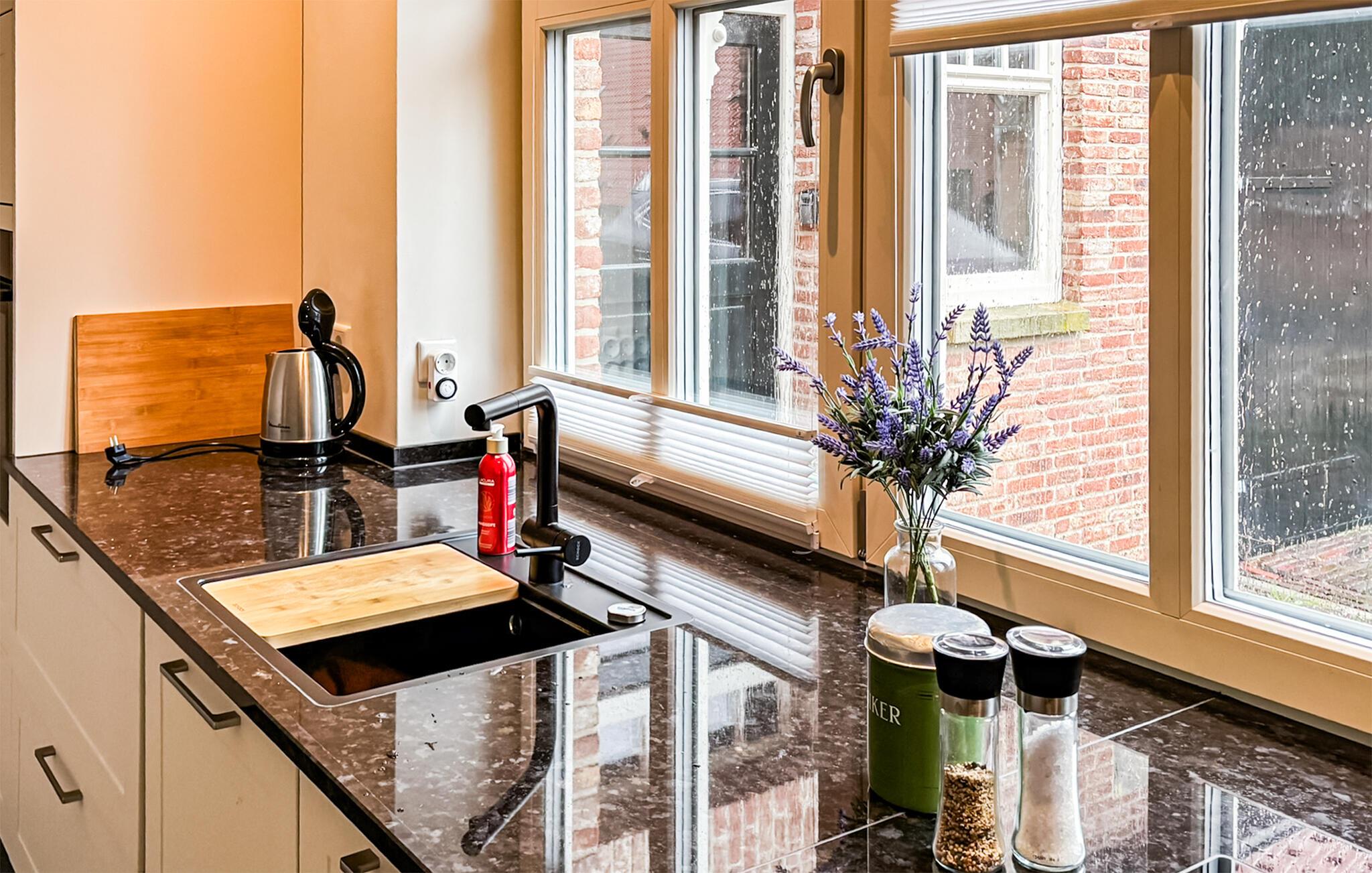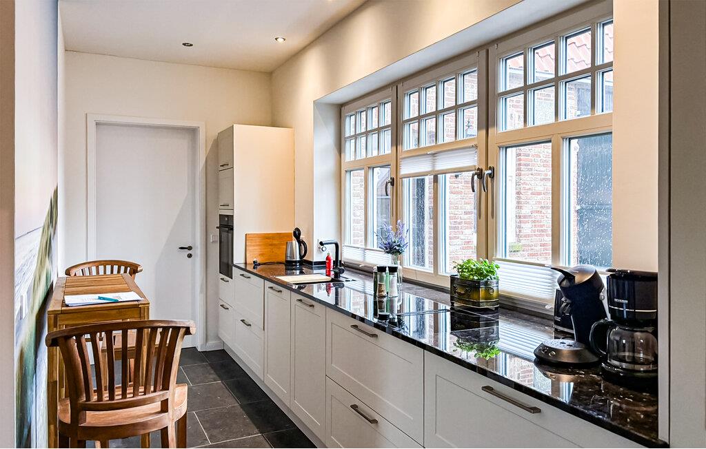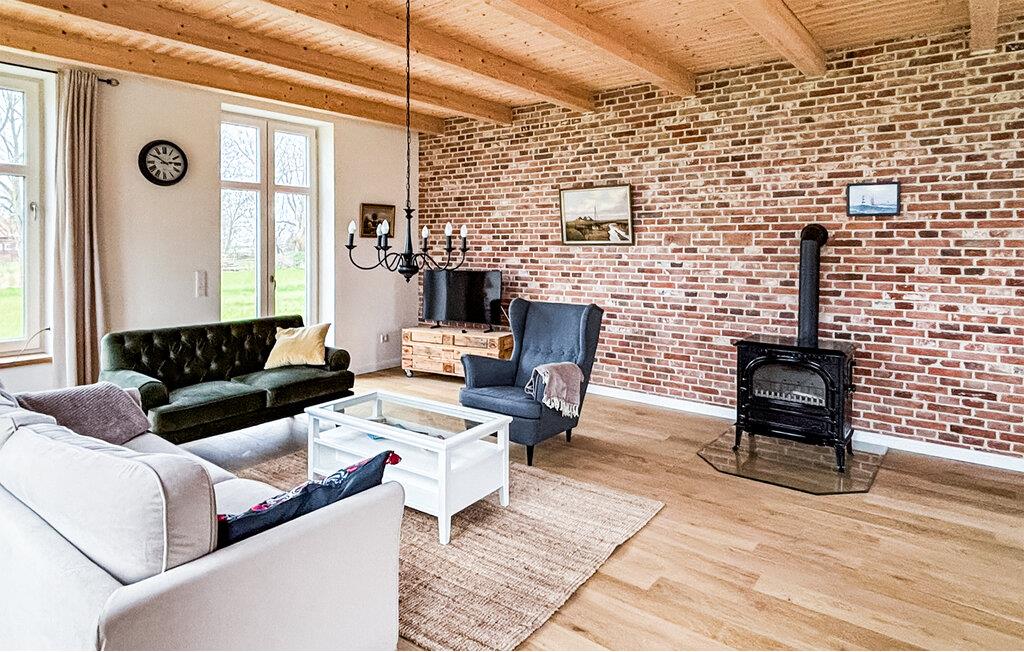 Genießen Sie den offenen Wohnbereich mit seinen sichtbaren Holzbalken und der warmen Backsteinwand. Große Fenster lassen viel Tageslicht herein und schaffen eine freundliche Atmosphäre. Machen Sie es sich auf den bequemen Sofas gemütlich oder lesen Sie im Sessel neben dem Kaminofen. Bereiten Sie Mahlzeiten in der modernen Küche mit großzügiger Arbeitsfläche zu und nehmen Sie anschließend am massiven Holztisch Platz. Ziehen Sie sich gelegentlich zurück und genießen Sie Ihre freie Urlaubszeit in vollen Zügen.