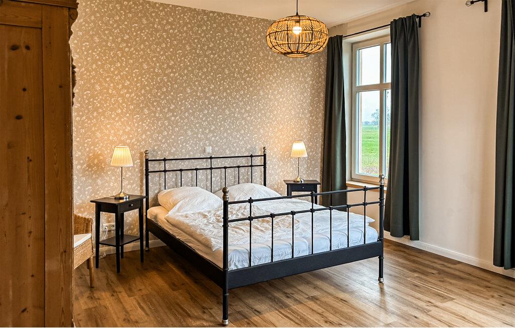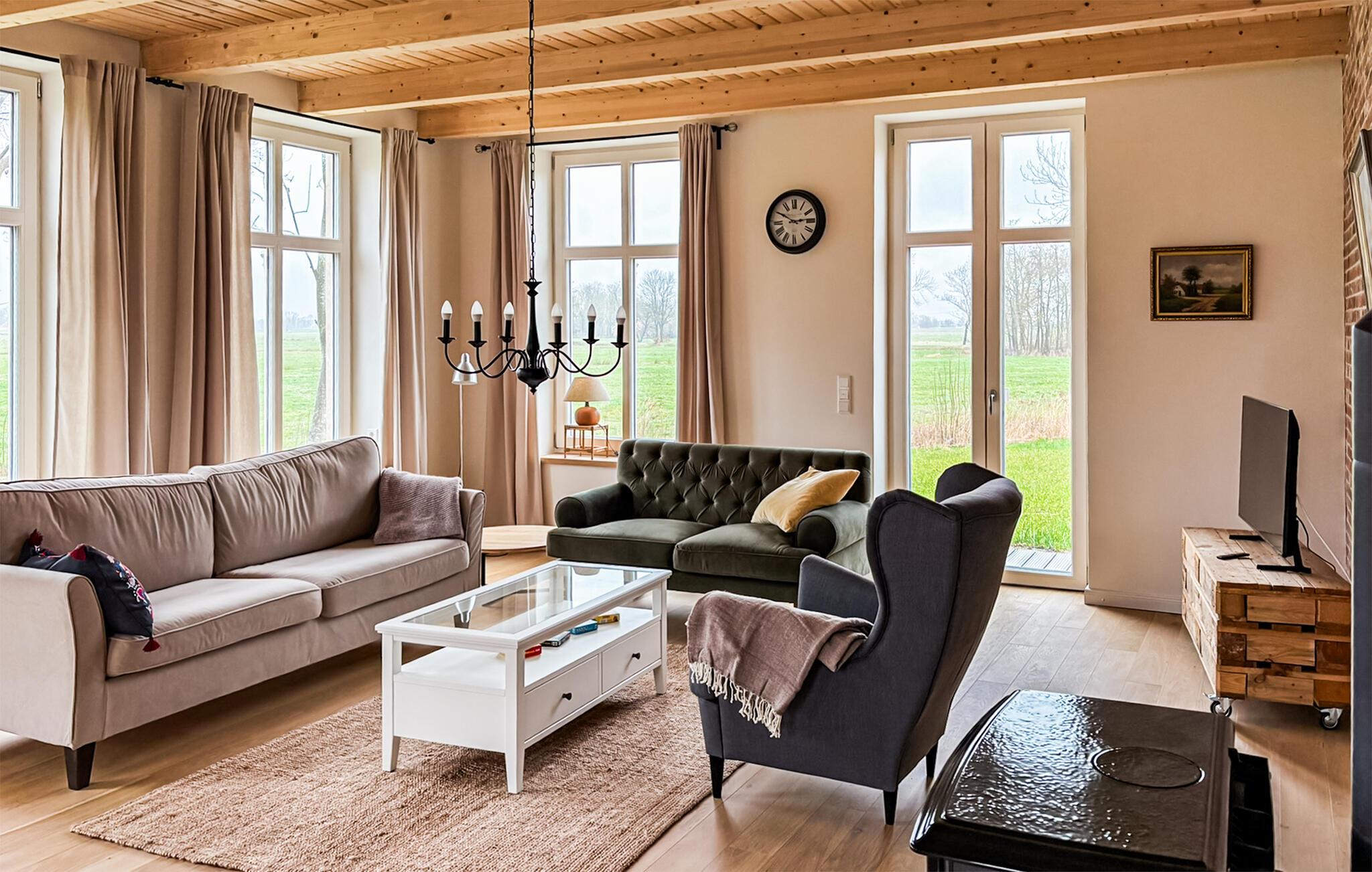 Stilvolles Ferienhaus in ruhiger Lage mit Kamin, moderner Küche und großem Garten in Ostfriesland.