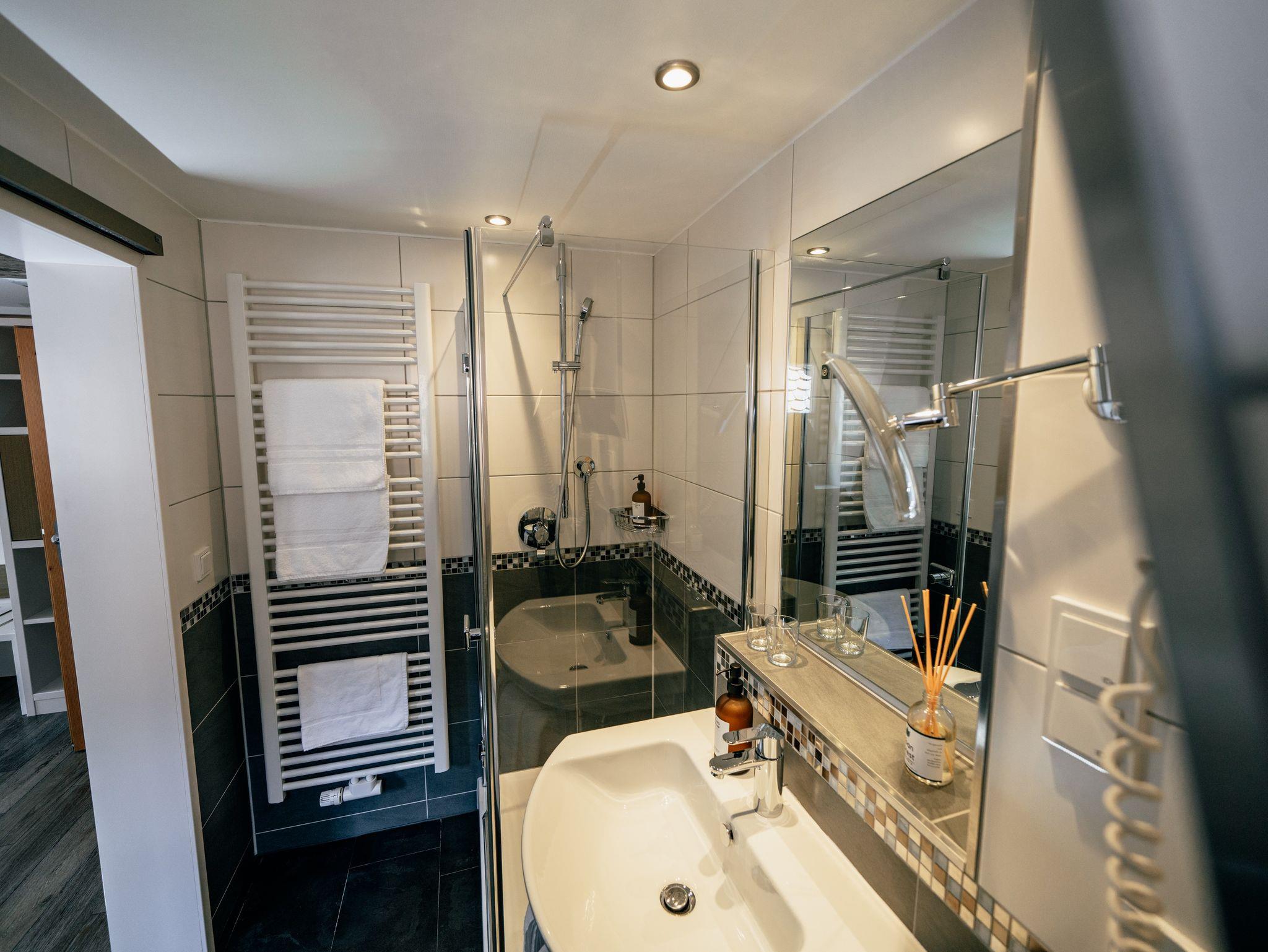 Alle Zimmer sind modern und gemütlich eingerichtete Nicht-Raucherzimmer. Damit ihr zu jeder Jahreszeit den größten Komfort genießen könnt, sind die Zimmer im Dachgeschoß standardmäßig mit einer Klimaanlage ausgestattet. Kostenfreies W-Lan gibt es in allen Bereichen. Jedes Zimmer verfügt über einen Schreibtisch, einer Sitzgruppe und einem Flachbildfernseher sowie einem modernen Bad mit Dusche. Föhn, Hand- und Badetüchern sowie diverse Pflegeprodukte sind vorhanden. Zwei unserer Gästezimmer können auch als Familienzimmer gebucht werden. Hier kann der Sitzbereich zu einer gemütlichen Schlafgelegenheit (Liegefläche 1,40m x 2,0m) umgebaut werden.