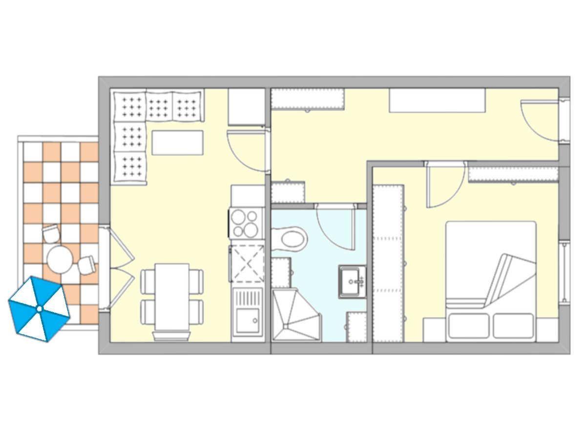 Das 2-Zimmer-Appartment mit Westbalkon befindet sich im 2.OG. Das Appartement