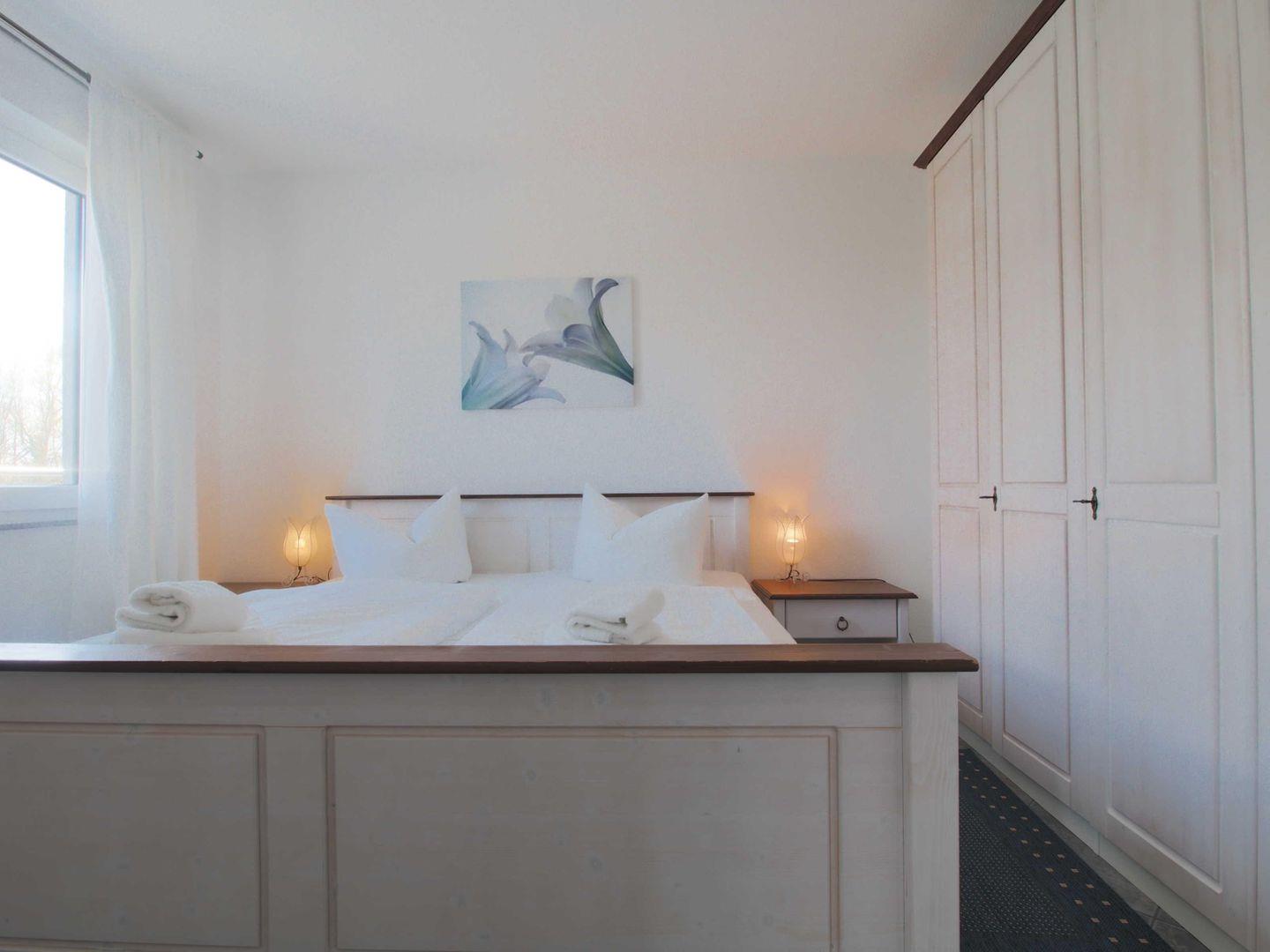 Doppelbett, großem Kleiderschrank ausgestattet.