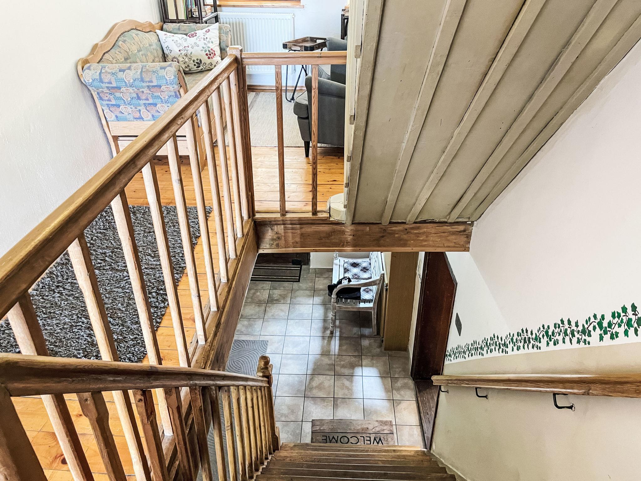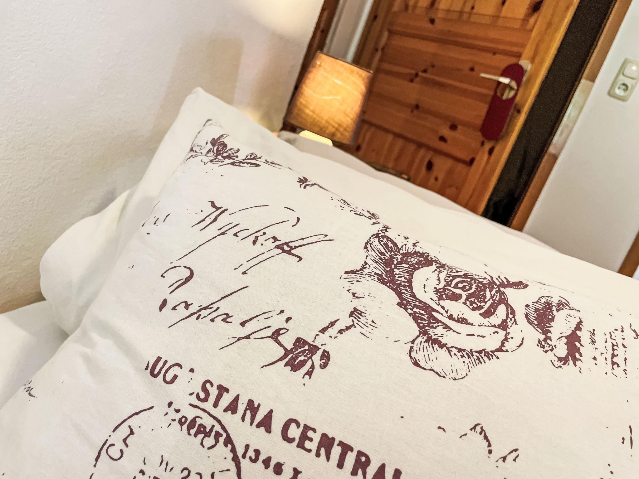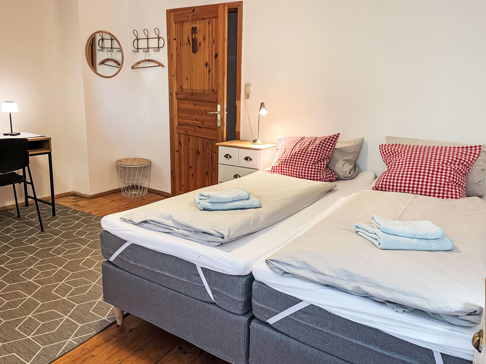 12-Zimmer-Haus 400 m2 auf 2 Stockwerken. Gemütlich eingerichtet: grosses Wohn-/Esszimmer mit Schwedenofen und Sat-TV (Flachbildschirm). 1 Zimmer mit 1 Doppelbett (180 cm, Länge 200 cm), Dusche/WC und Sat-TV (Flachbildschirm). 1 Zimmer mit 2 Betten (90 cm, Länge 200 cm), Dusche/WC und Sat-TV (Flachbildschirm). Küche (Backofen, Geschirrspüler, 4 Glaskeramikplatten, Toaster, Wasserkocher, Mikrowelle, elektrische Kaffeemaschine). 2 sep. WC's. Obergeschoss: (steile Treppe) Wohnzimmer mit Sat-TV (Flachbildschirm). 2 Zimmer, jedes Zimmer mit 1 Doppelbett (180 cm, Länge 200 cm), Dusche/WC und Sat-TV (Flachbildschirm). 1 Zimmer mit 2 Betten (90 cm, Länge 200 cm), Dusche/WC und Sat-TV (Flachbildschirm). 5 Zimmer, jedes Zimmer mit 1 Bett (90 cm, Länge 200 cm), Dusche/WC und Sat-TV (Flachbildschirm). Heizung. Holzdielenboden. Terrasse. Terrassenmöbel, Gartengrill (mobil). Zur Verfügung: Waschmaschine (extra). Wäschetrockner (extra). Internet (WLAN, gratis). Parkplatz (7 Autos) beim Haus. Bitte beachten: Nichtraucher-Haus. Maximal 3 Haustiere/Hunde erlaubt. Rauchmelder, Feuerlöscher.