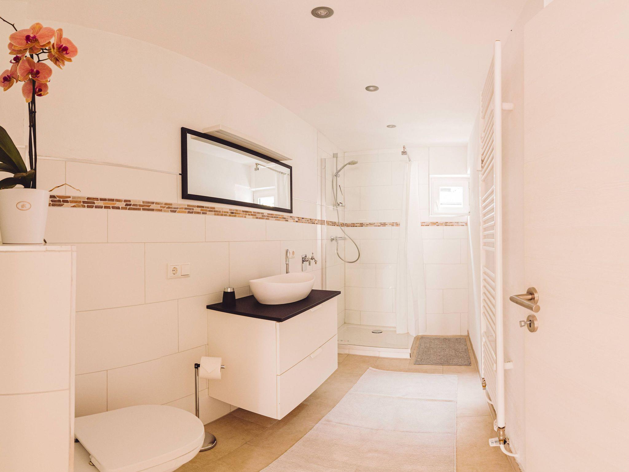 Das Badezimmer besitzt eine flach begehbare Dusche, eine Fußbodenheizung, einen Heizkörperhandtuchhalter, ein WC, ein Waschbecken, ein Fenster und einen Föhn.