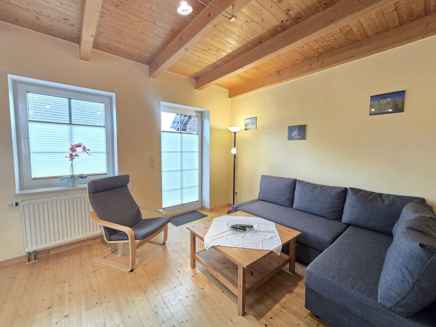 Gemütliche Ferienwohnung Nordseeperle mit Garten, Terrasse und WLAN in Dornum, ideal für Familien und Haustiere.