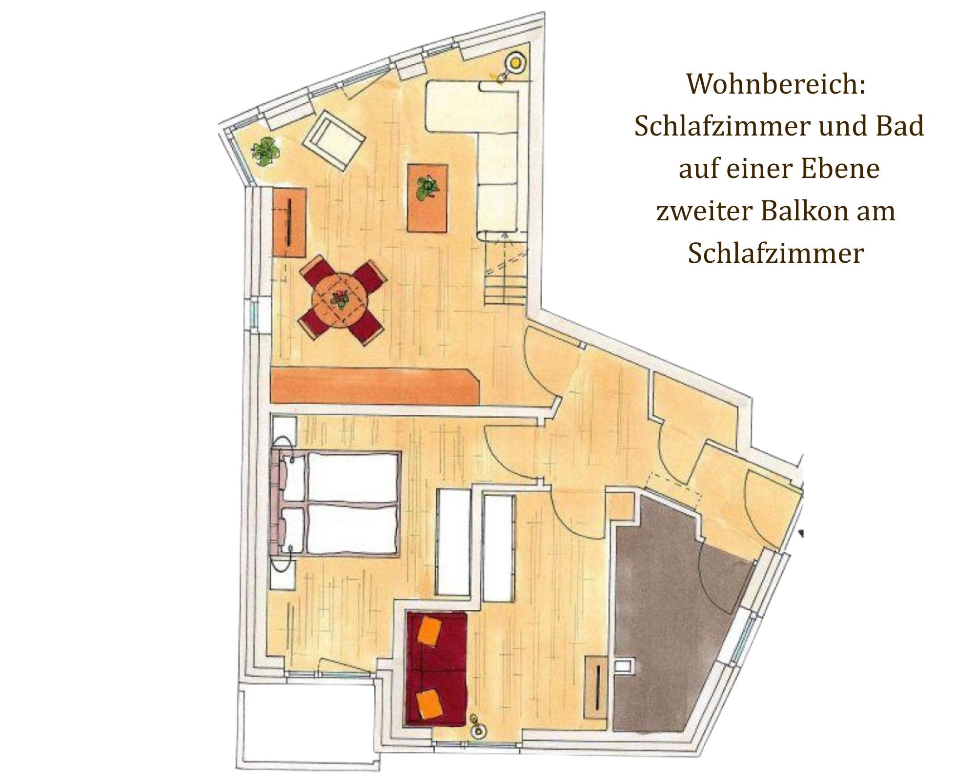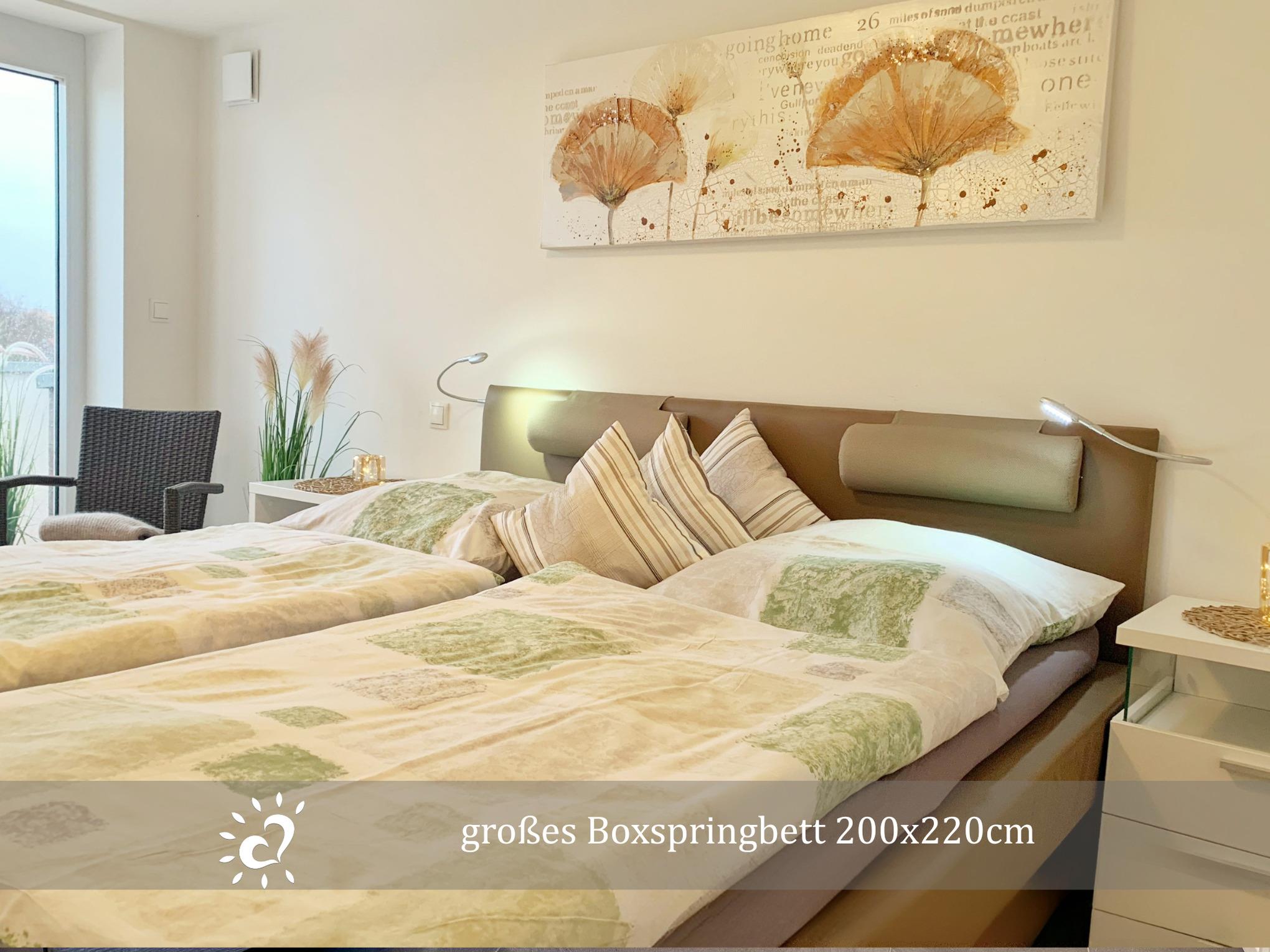 Das Schlafzimmer verwöhnt dich mit einem super großem Boxspringbett und eigenem Balkon für den Kaffee am Morgen. Das zweite Schlafzimmer bietet eine hochwertige Schlafcouch mit Lattenrost und durchgehender Matratze (160 × 200 cm) mit Smart-TV perfekt für private Abende.