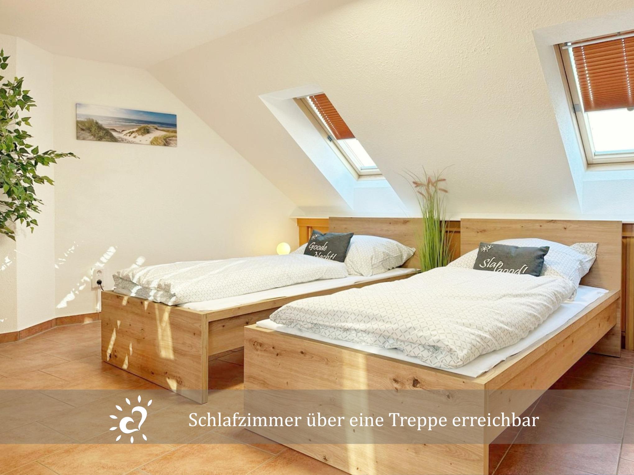Über eine Treppe erreichbar, mit zwei getrennt stehenden Betten (90×200 cm) ideal für Kinder oder Freunde. In der oberen Etage gibt es außerdem eine Playstation 4 mit Controllern sodass die Kinder auch Entspannung und Unterhaltung haben.