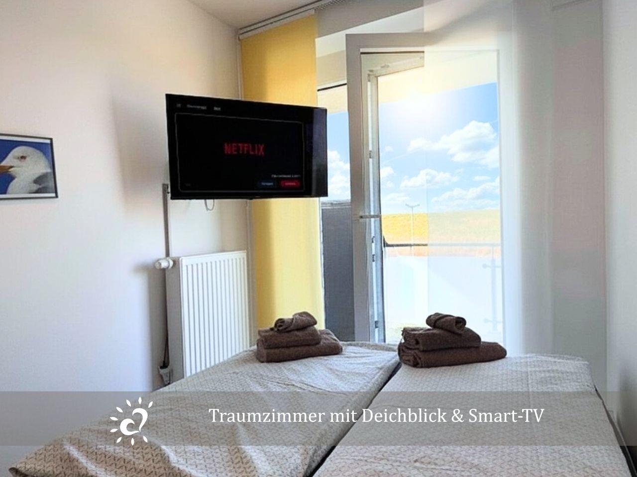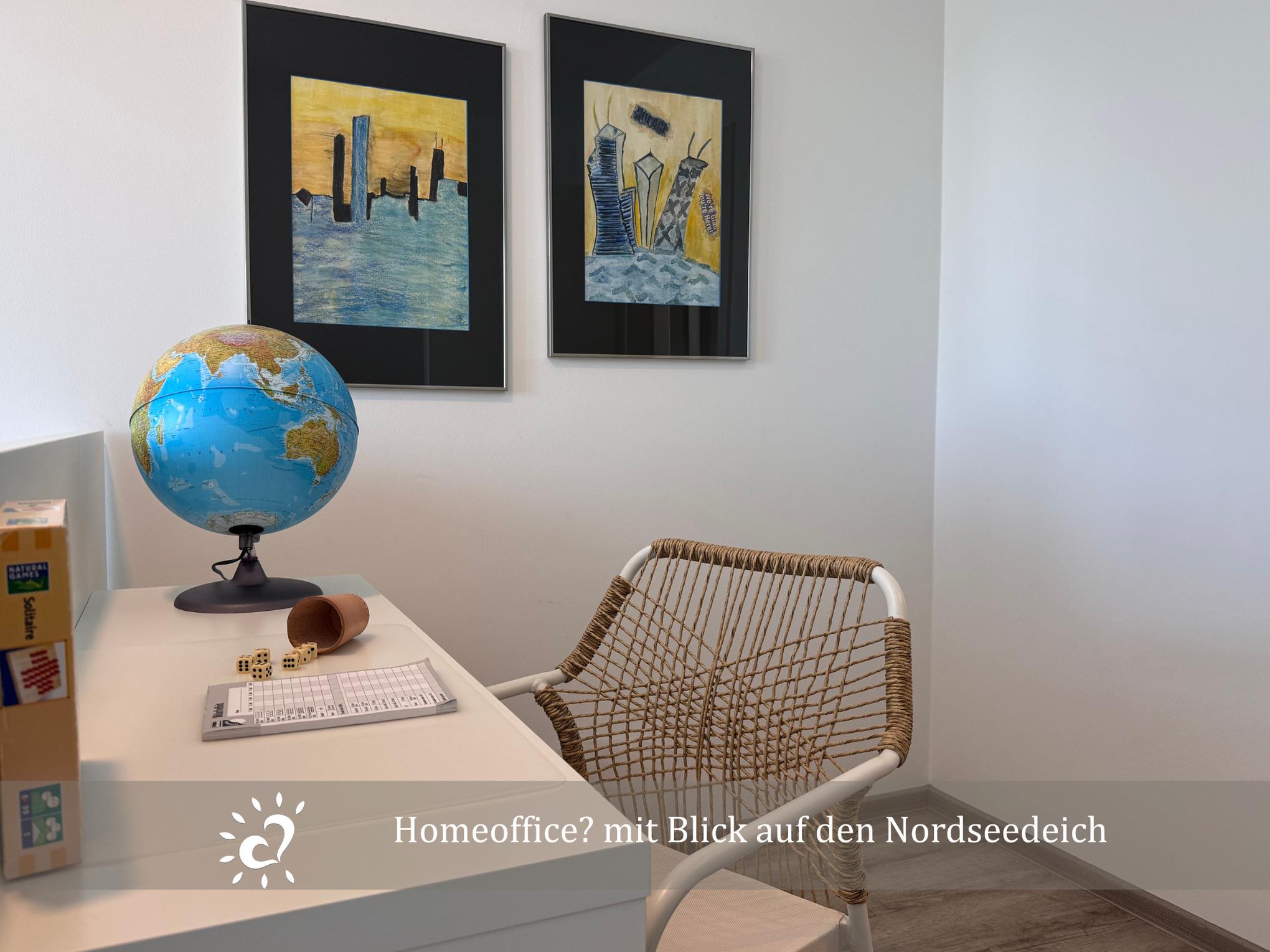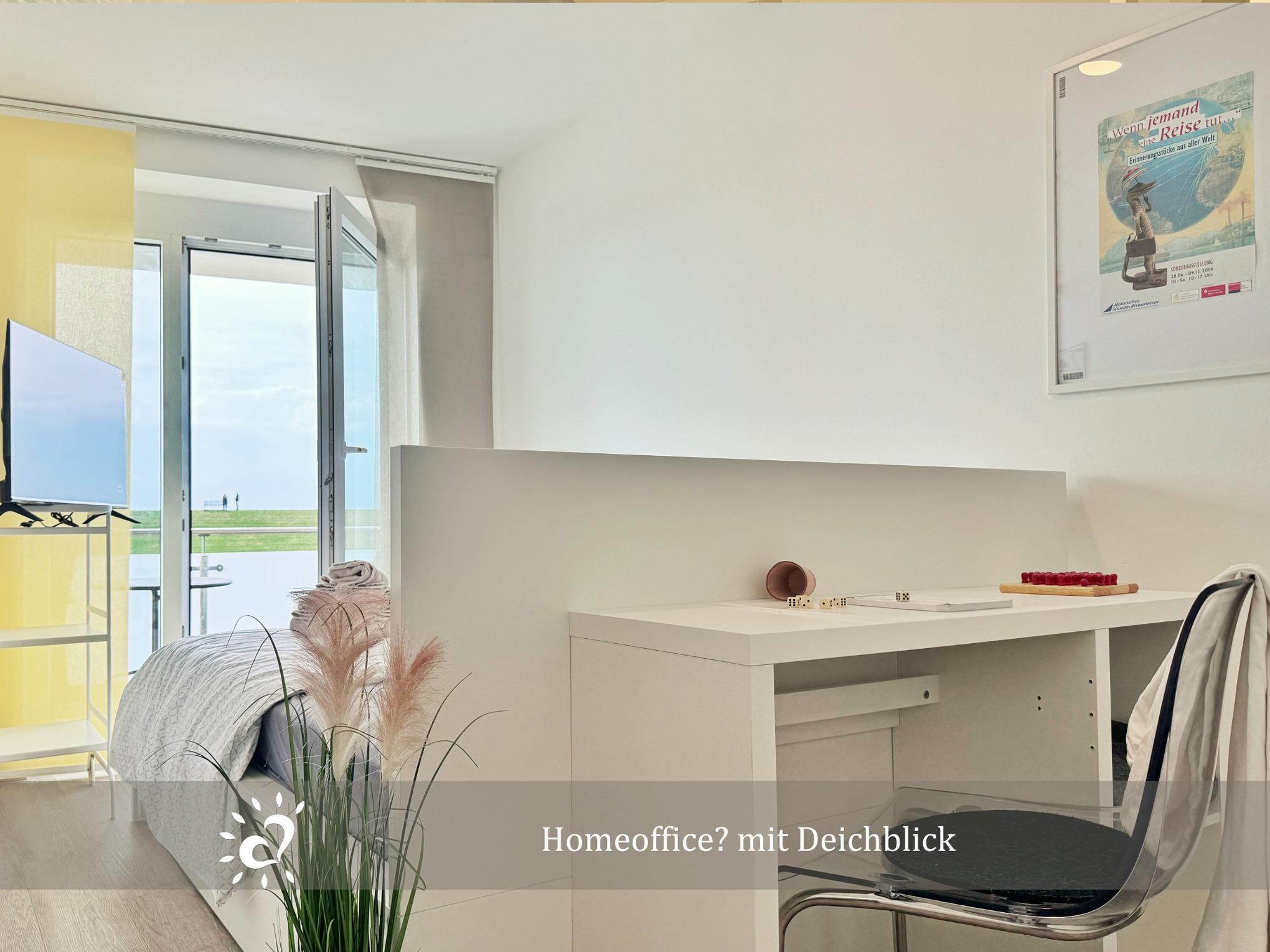 Der offene Wohnbereich mit Smart-TV lädt zu langen, entspannten Abenden ein, und ein kleiner Homeoffice-Bereich gibt dir die Möglichkeit, bei Bedarf in Ruhe zu arbeiten – mit Blick auf den Nordseedeich.