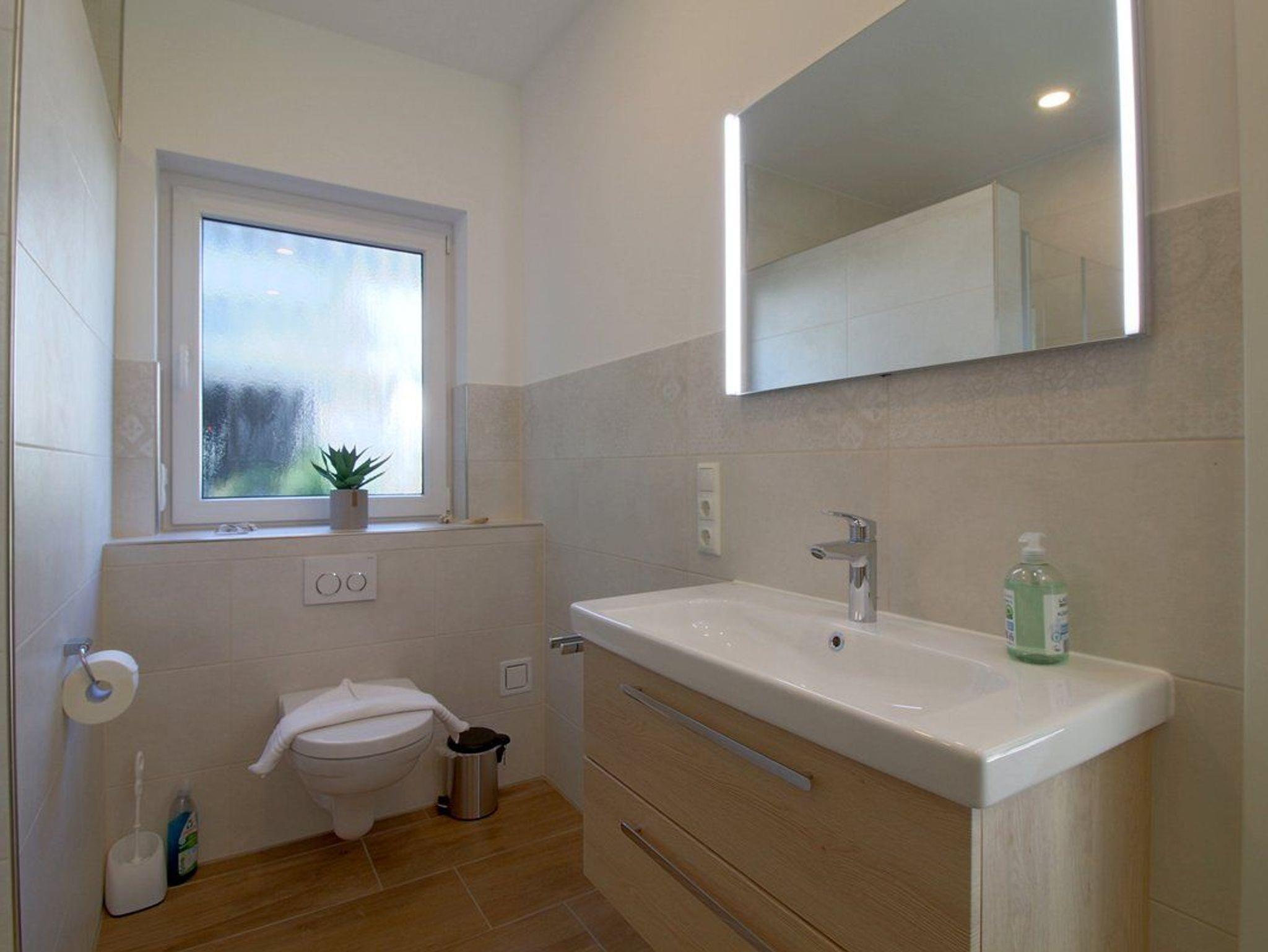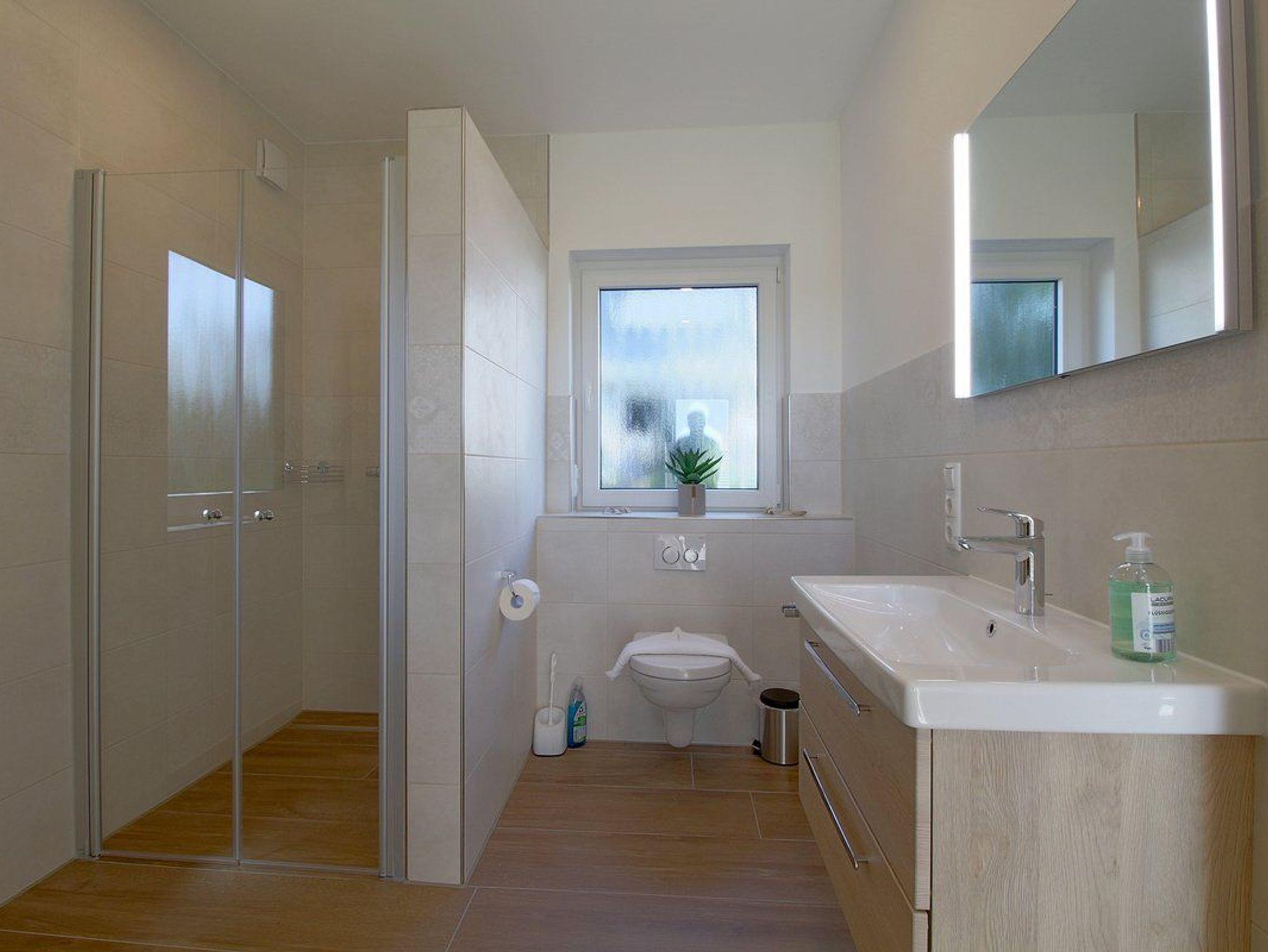 Das helle Duschbad hat neben einer ebenerdig begehbaren Dusche eine Sauna (mit Münzautomat), um den Urlaub auch an kühlen und regnerischen Tagen in vollen Zügen genießen zu können.