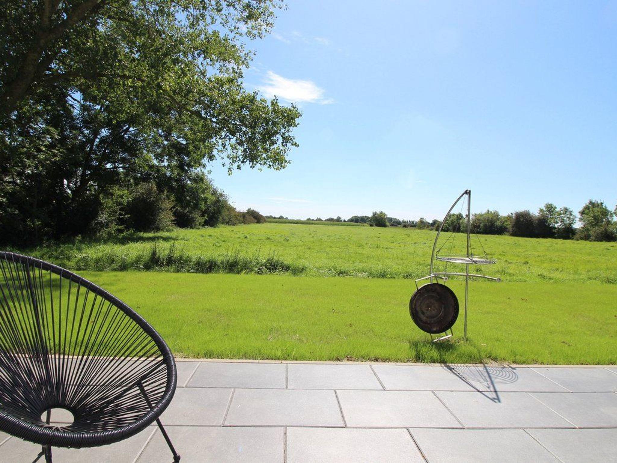 Jedes Zimmer hat einen direkten Zugang zu der großen Terrasse mit traumhaftem Blick über die Wiesen und Felder von Neufeld. Auf der sonnigen Terrasse können Sie sich auf einer der Liegen erholen oder es sich in geselliger Runde beim Grillen oder an der Feuerschale gutgehen lassen.