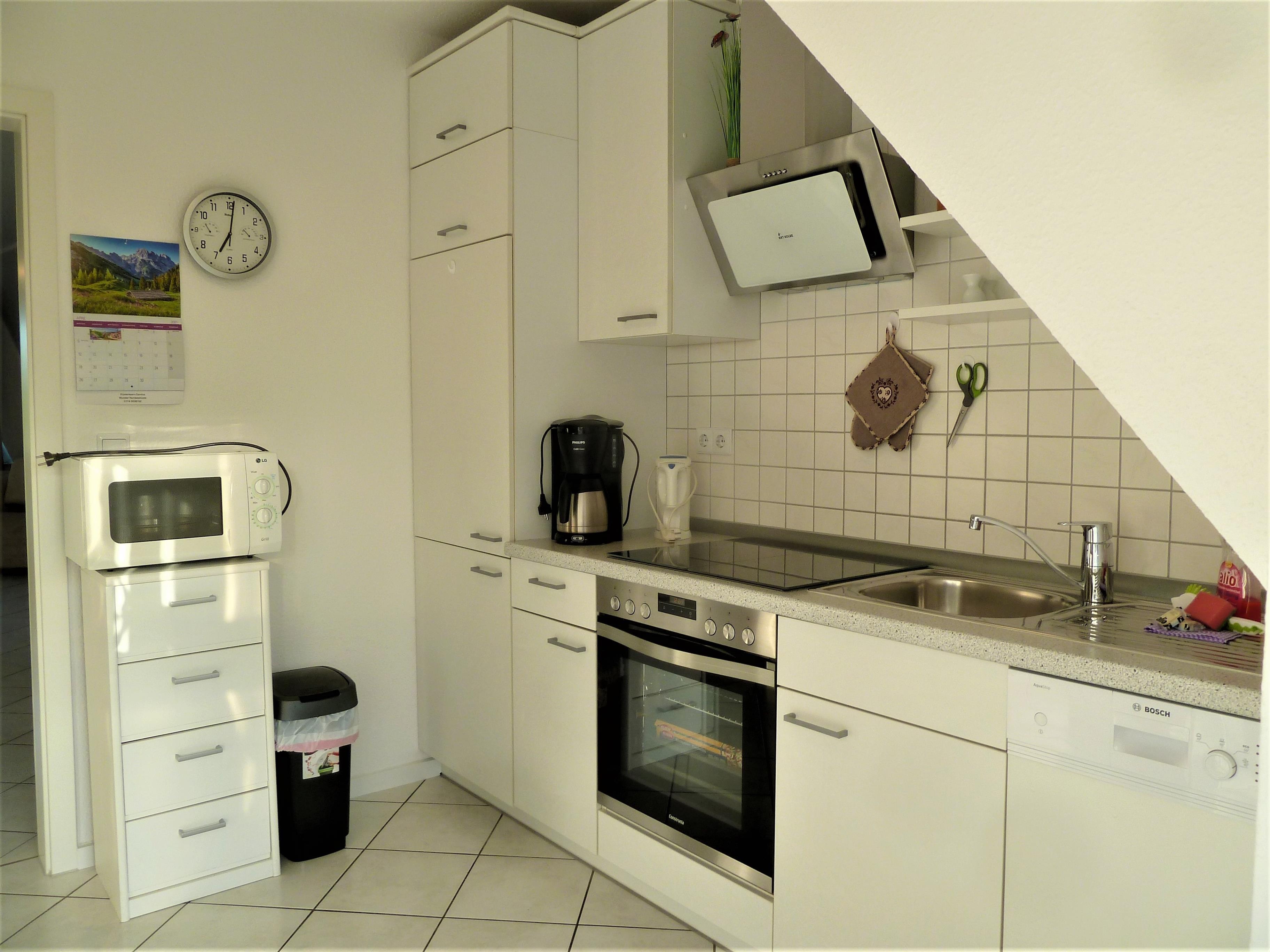 Geräumiges Wohnzimmer mit Essplatz (29 qm), komplett eingerichtete Küche mit Kühlschrank, Herd/ Backofen, 4 Ceranfelder, Mikrowelle, Wasserkocher Toaster, Eierkocher, Mixer, Stabmixer, Kaffeemaschine, Belegung bis max. 3 Personen und 1 Kleinkind im Kinderreisebett. PKW-Stellplatz vorhanden. Kostenlos