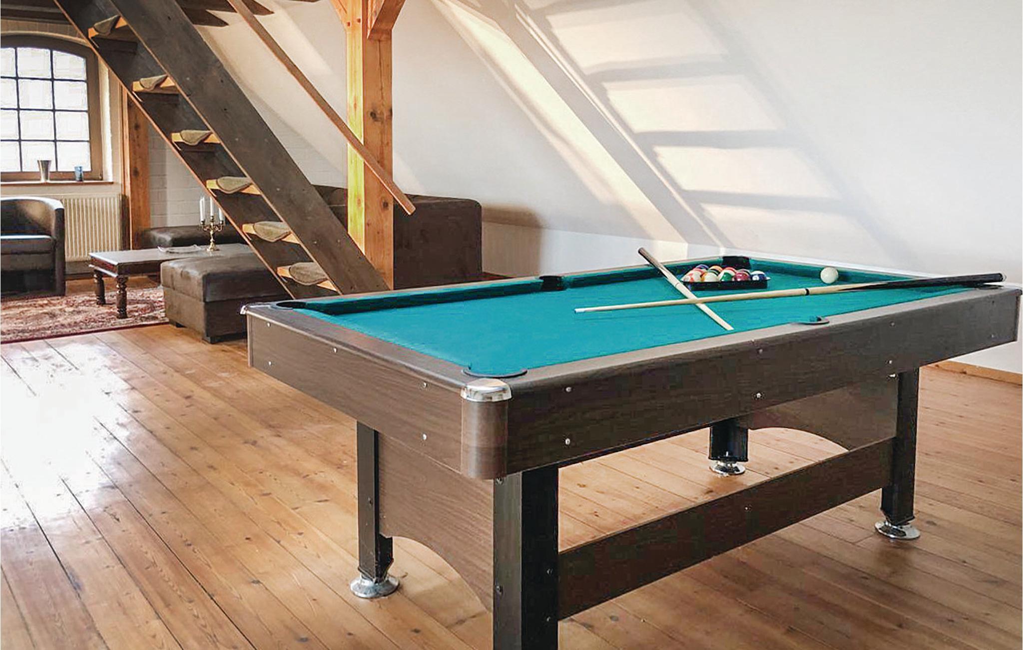 Die 10 Schlafzimmer erstrecken sich über insgesamt vier Etagen, einige verfügen über einen kombinierten Wohnraum. Im unteren Bereich befindet sich ein großer Raum für gemeinsame Aktivitäten oder Feierlichkeiten. Eine große Gemeinschaftsküche lädt ein, um gemeinsame Mahlzeiten zuzubereiten und dort auch gleich zu verspeisen. Ein separater Raum bietet Tischfußball und Billard, auch ein kleines Heimkino steht Ihnen zur Verfügung. Für Wellness sorgen im Außenbereich eine Sauna und eine Badetonne. Das Holz für den Saunaofen muss je nach Bedarf selbst mitgebracht werden.