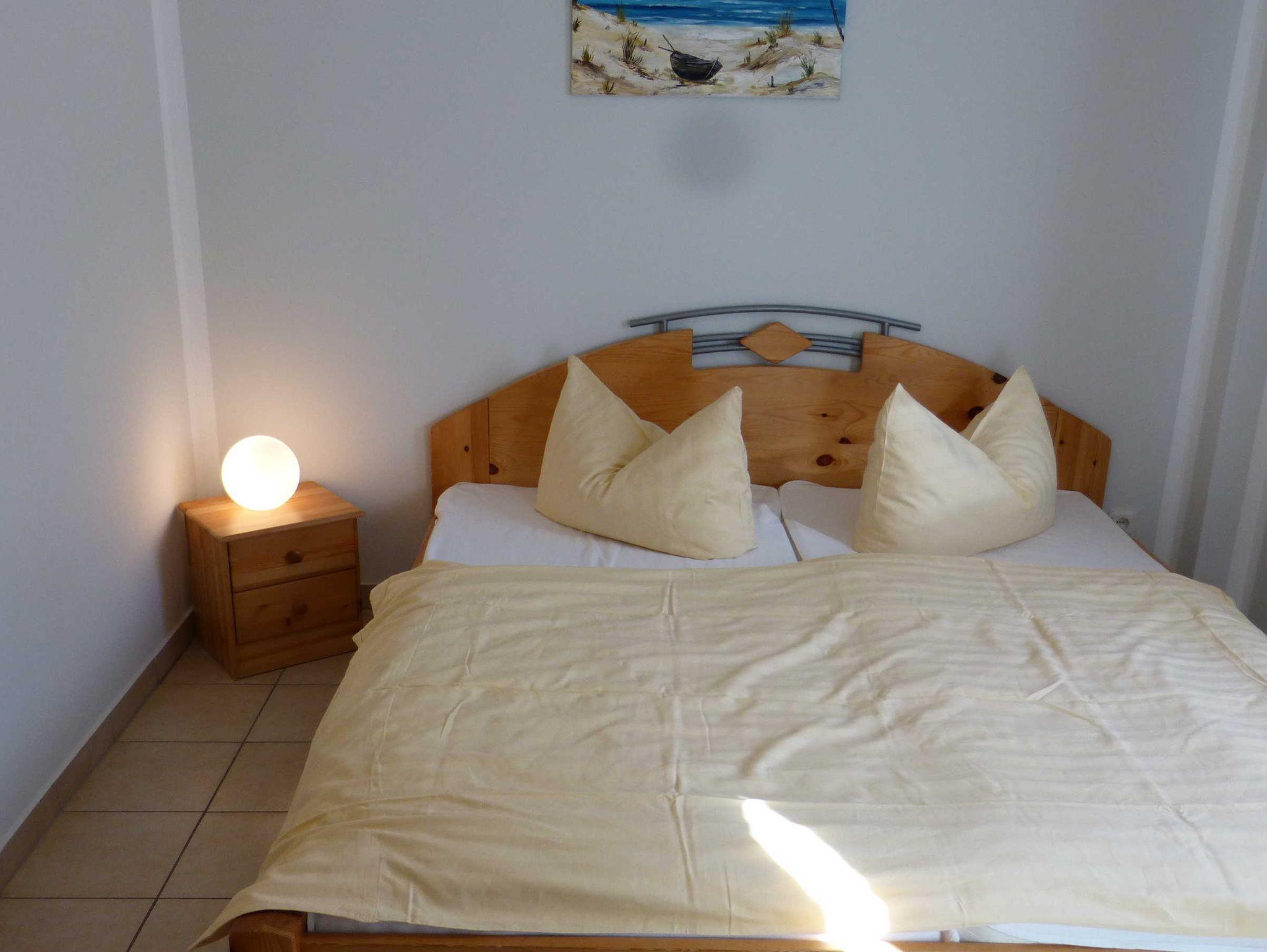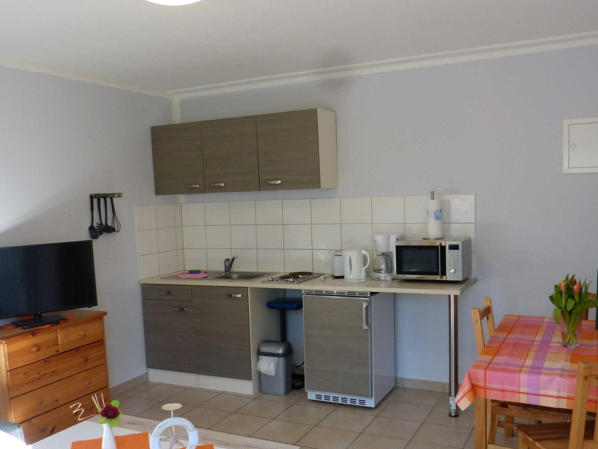 Die Ferienwohnung liegt im Erdgeschoß, hat eine Größe von 28 m² und verfügt über einen Wohnraum mit Pantry, ein Schlafzimmer mit einem Doppelbett, ein Badezimmer und eine Terrasse. Eine Aufbettung ist im Wohnraum möglich (Schlafsofa). In der Miniküche befinden sich zwei Kochplatten, eine Kaffemaschine, ein Wasserkocher, ein Toaster, ein Kühlschrank mit Gefrierfach sowie eine Mikrowelle. Wäsche kann zugebucht werden ((Handtuch- Bettwäschepaket 25,00 pro Person). Im Ferienpark kann ein Grill gemietet werden, ebenso ist die Nutzung einer gemeinschaftlichen Waschmaschine möglich (gegen Gebühr).