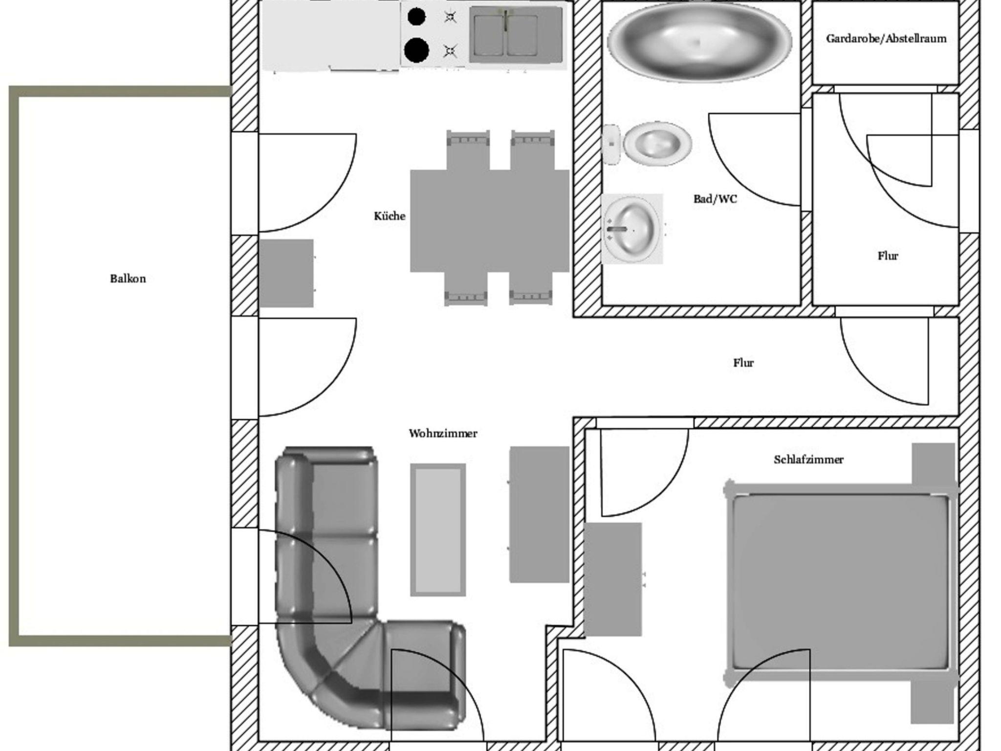 Das Schlafzimmer ist mit einem Doppelbett 160 cm x 200 cm und Kleiderschrank möbliert. Das Bad ist vollständig gefliest und mit einer Badewanne/Dusche, Waschbecken und WC versehen. Ein separater Abstellraum/Garderobe in der Wohnung bietet zusätzlichen Stauraum (z.B. für Gepäcktaschen). Im Wohn- und Schlafbereich ist Laminat verlegt. Küche, Bad, Flur und Garderobe/Abstellraum sind mit Granitbodenfliesen versehen.