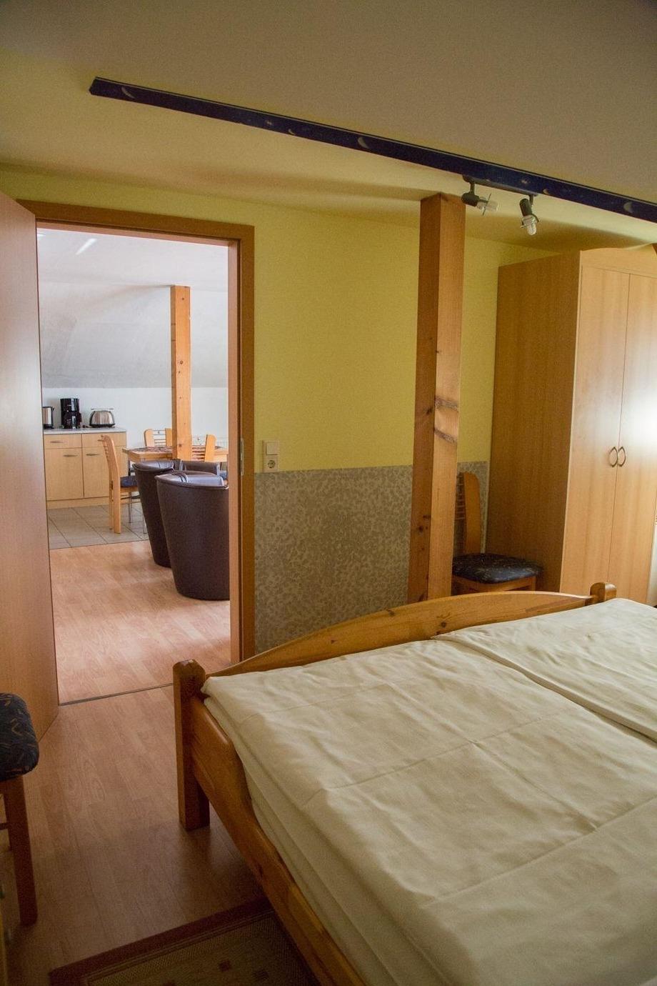 Das Apartment der "Villa Elsa" befindet sich in der 2. Etage (kein Aufzug im Haus). Die Wohnung besitzt ein separates Schlafzimmer mit einem Doppelbett (180 x 200 cm). Das Doppelbett steht unter einer Dachschräge. Neben dem Doppelbett ist Platz für ein Kinderbett. Das Wohnzimmer mit Fernseher, Radioanlage, seperater Schlafliege (90 x 200 cm), Couche, Couchetisch und zwei Sesseln ist kombiniert mit einer Miniküche und Esstisch mit Stühlen. Die Miniküche besitzt zwei Elektroherdplatten, Kühlschrank, Toaster, Wasserkocher, Kaffeemaschine, Eierkocher und eine Mikrowelle. Bad mit einer Dusche, einem Waschbecken und WC.