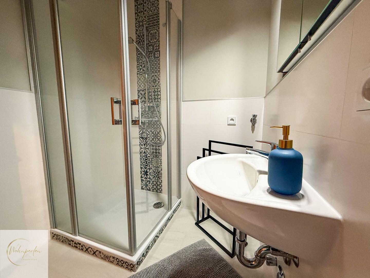 Das Badezimmer ist modern gestaltet und mit einer bodengleichen Dusche ausgestattet, die besonders angenehm zugänglich ist. Weiterhin sind WC, Waschbecken, Spiegel und Haartrockner vorhanden. Für Ihren Aufenthalt stehen Ihnen zudem Badetücher, Handtücher und Bettwäsche zur Verfügung.
