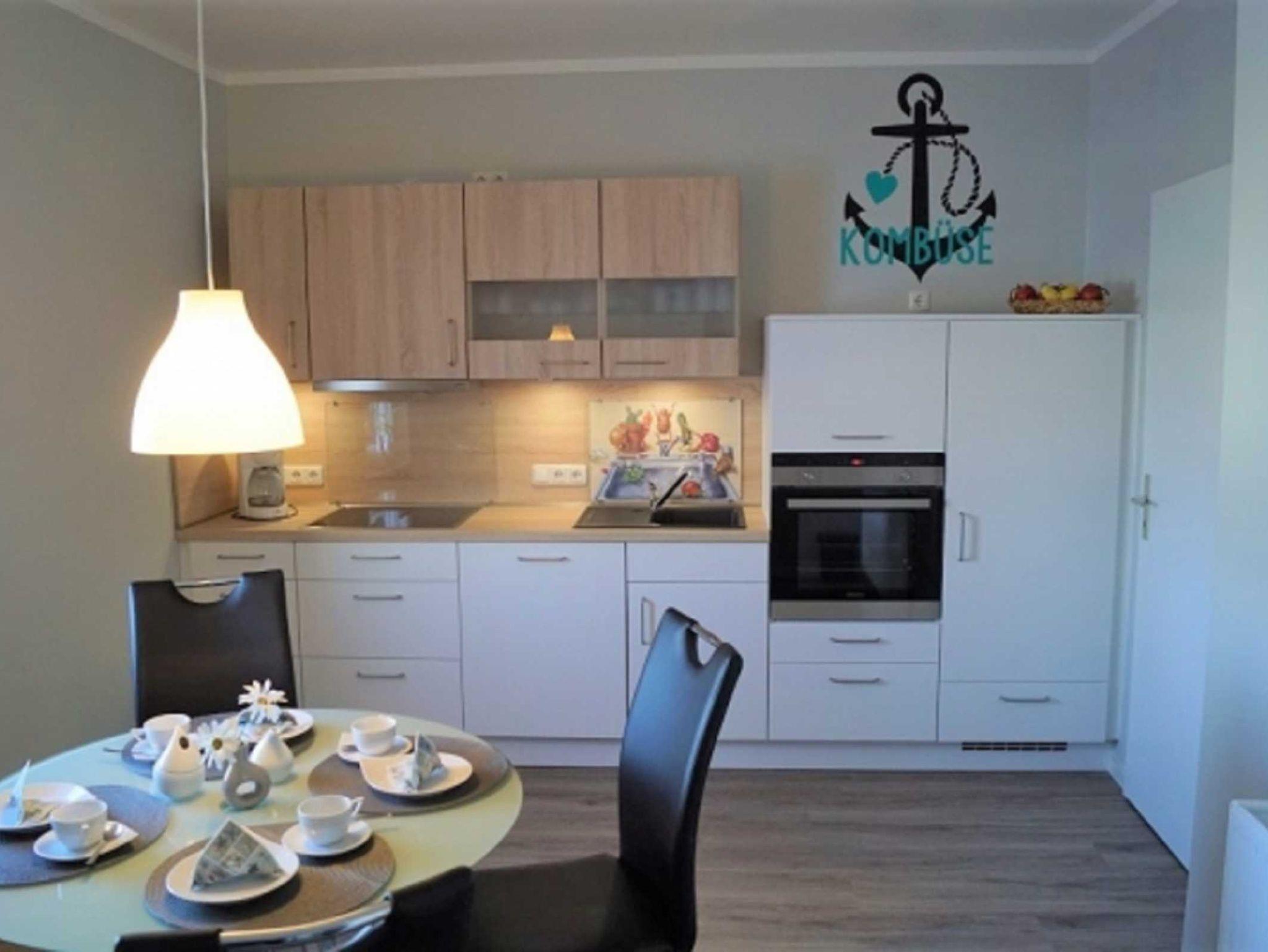 Ein Esszimmer mit angrenzender voll ausgestatteter Küche.