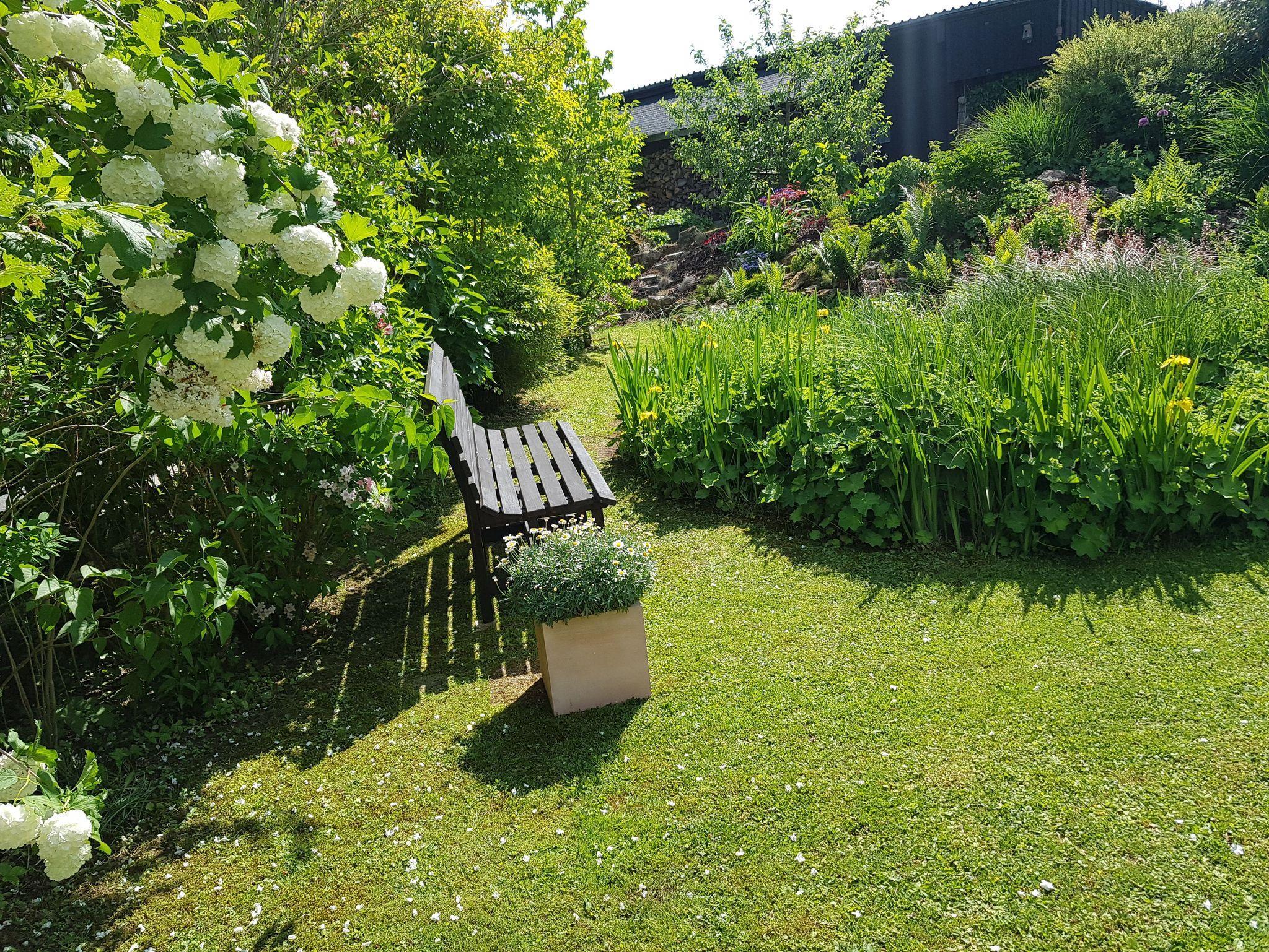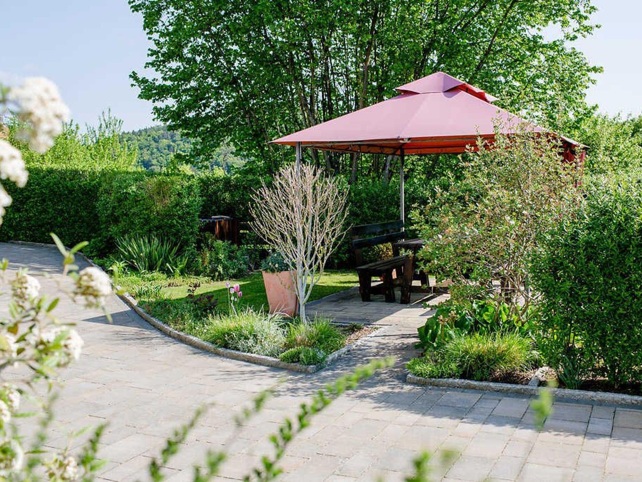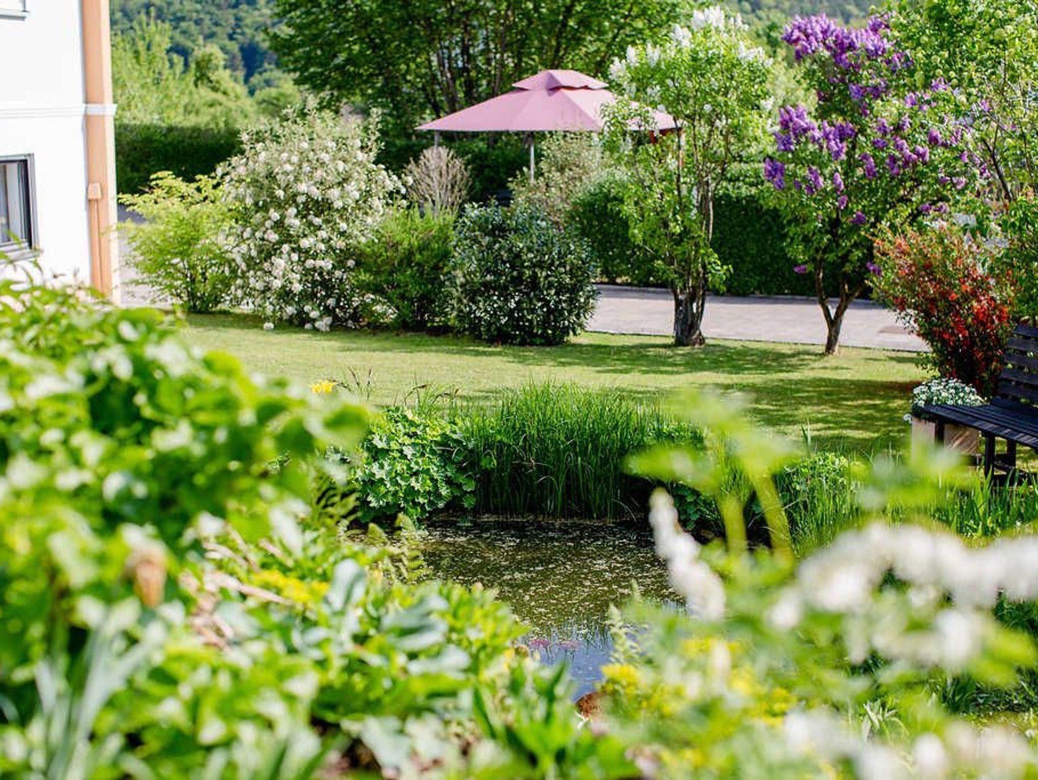 Blick vom Wohnzimmer in den ländlichen sehr gepflegten Garten mit Teich, Gartenmöbeln, Liegestühlen und Grill.