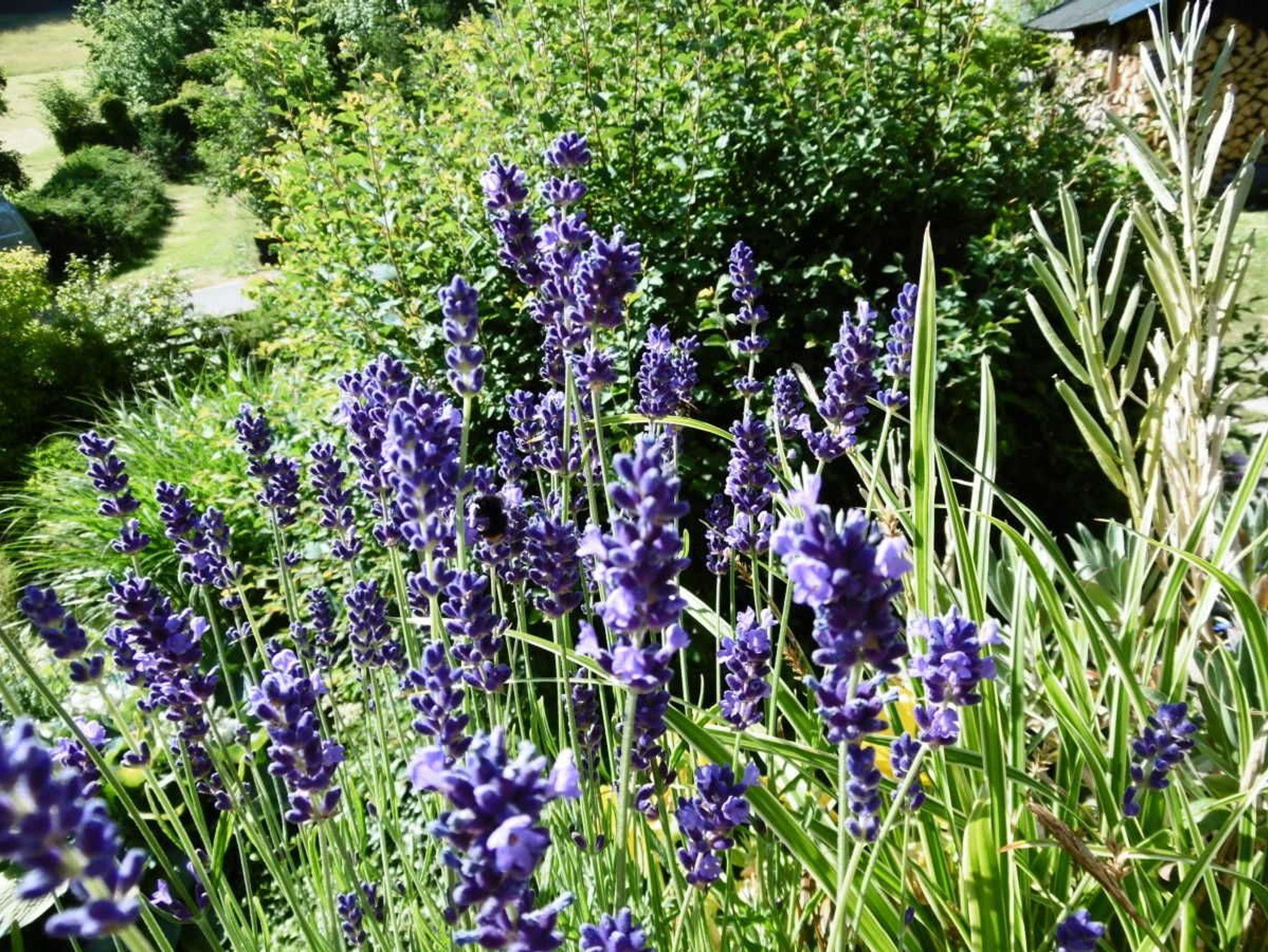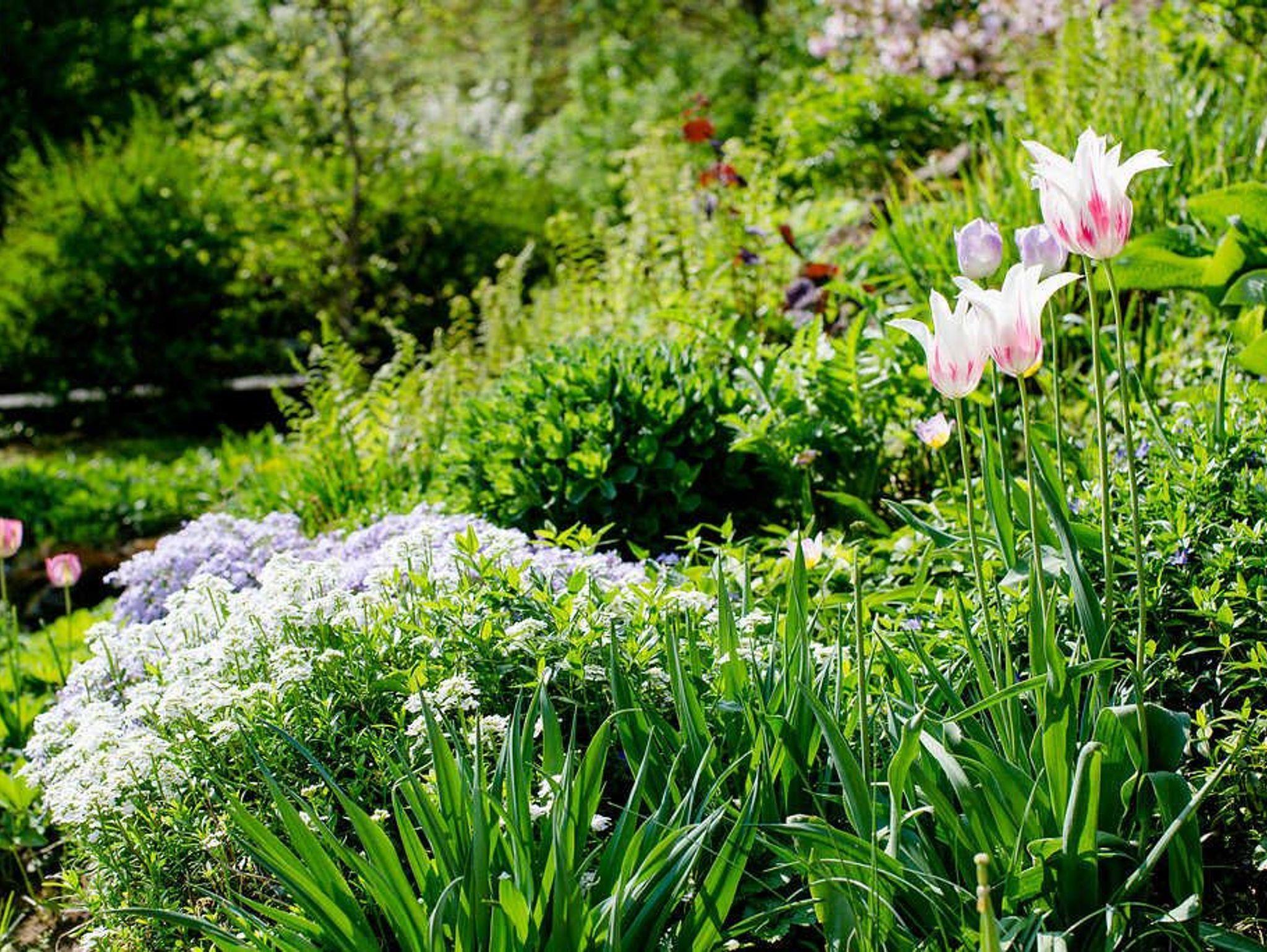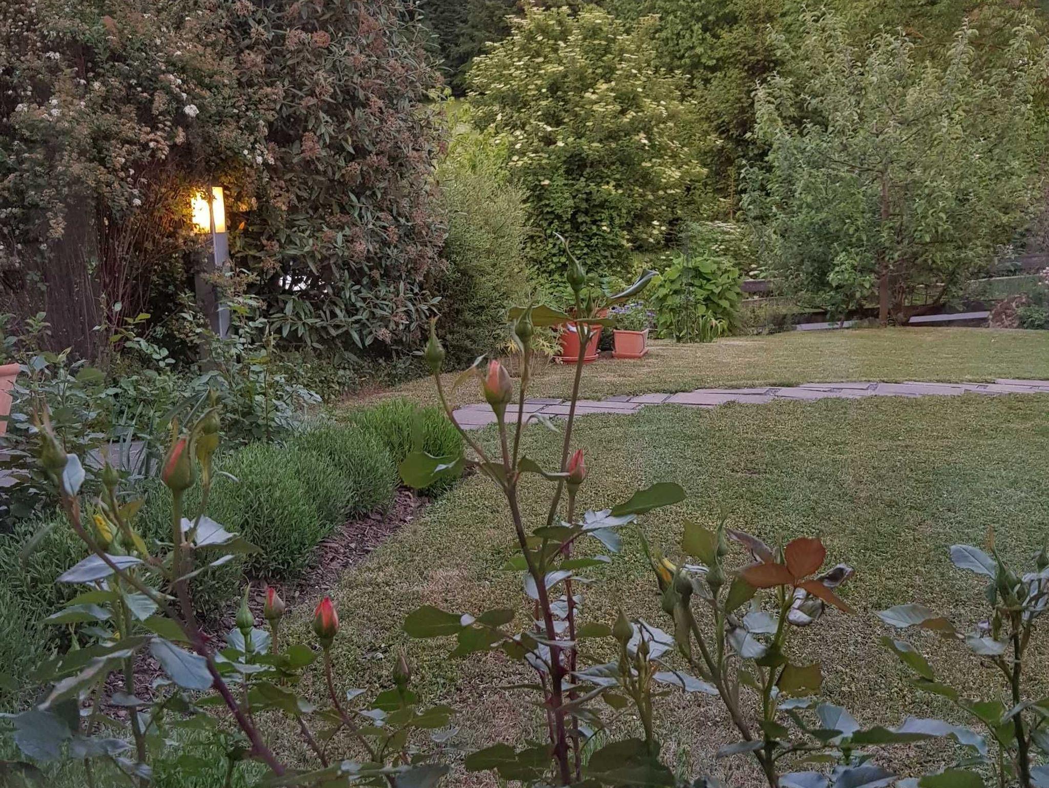 Blick vom Wohnzimmer in den ländlichen sehr gepflegten Garten mit Teich, Gartenmöbeln, Liegestühlen und Grill.