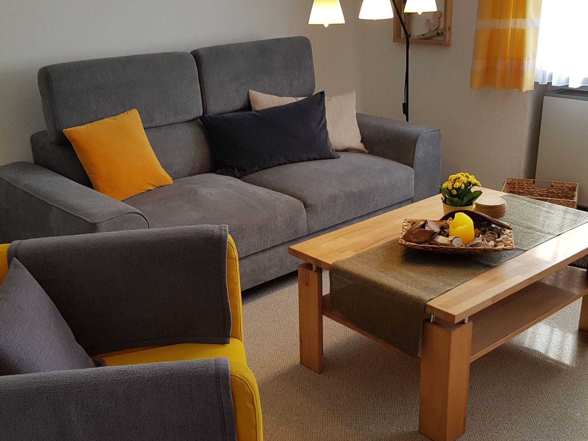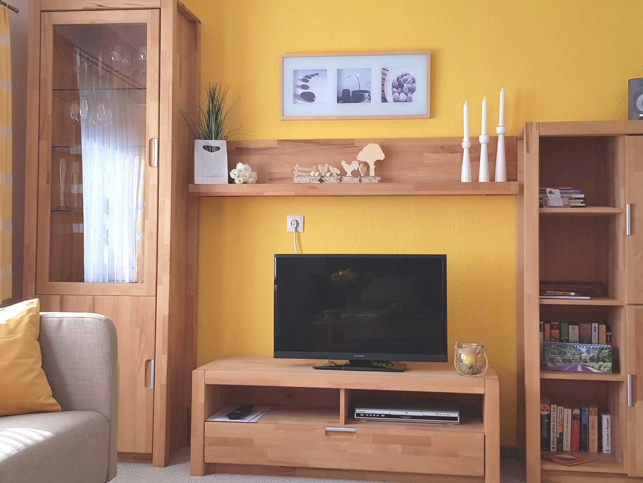 1 modernes gemütliches Wohnzimmer mit komfortabler Sitzgruppe, SAT-TV-Flachbildschirm, DVD, CD, Stereoanlage.