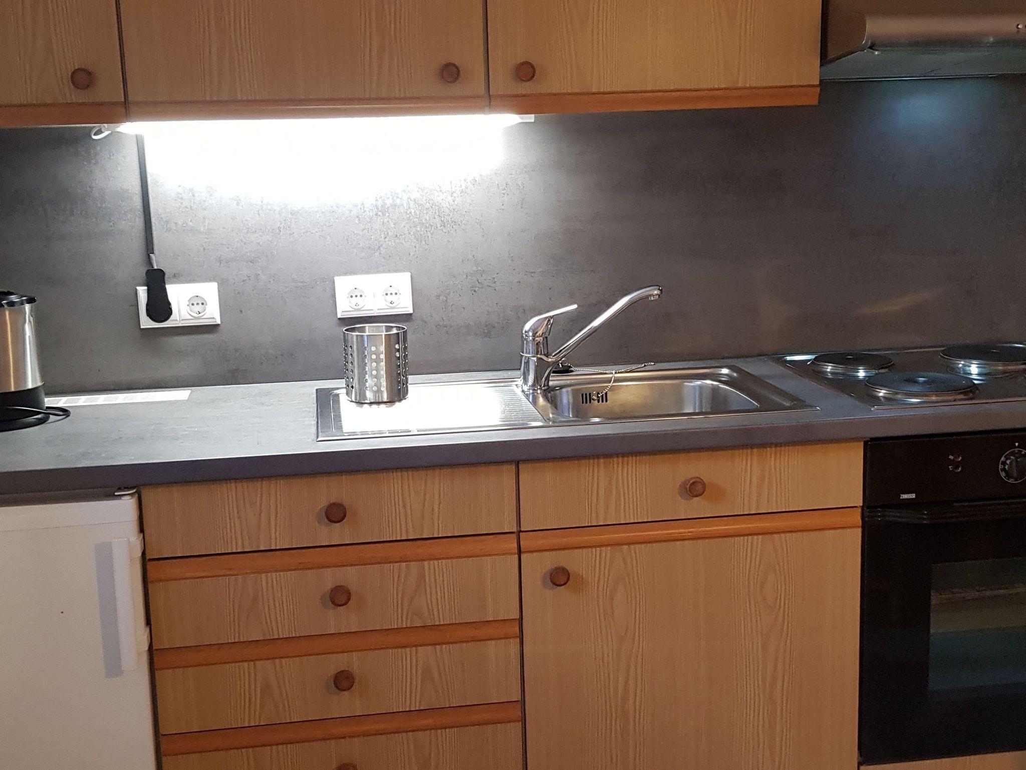 Komplett eingerichtete Küche mit gemütlicher Essecke für bis zu 6 Personen, Kühlschrank mit Gefrierfach, Geschirrspüler, 4- Plattenherd, Backofen, Mikrowelle, Kaffeemaschine, Wasserkocher, Toaster, Eierkocher, Espressokocher, Radio usw., Küchentücher.