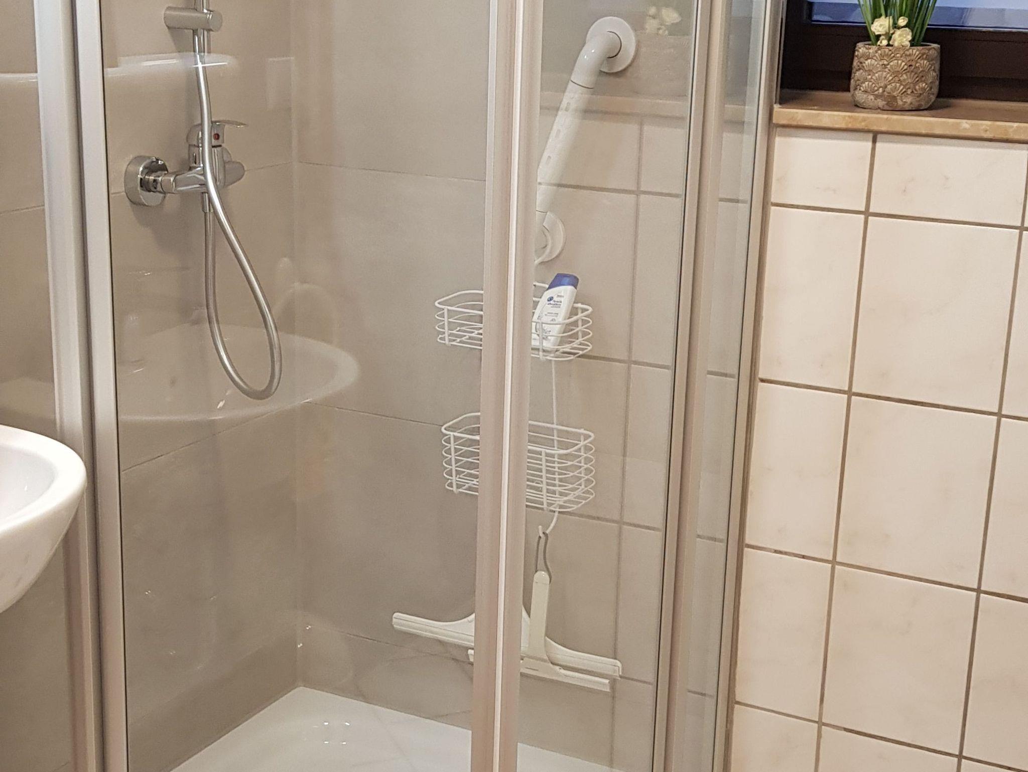 1 Bad: Moderne Dusche mit niedrigem Einstieg, Haltegriffe in der Dusche, auch am WC, Waschbecken, WC, Föhn.