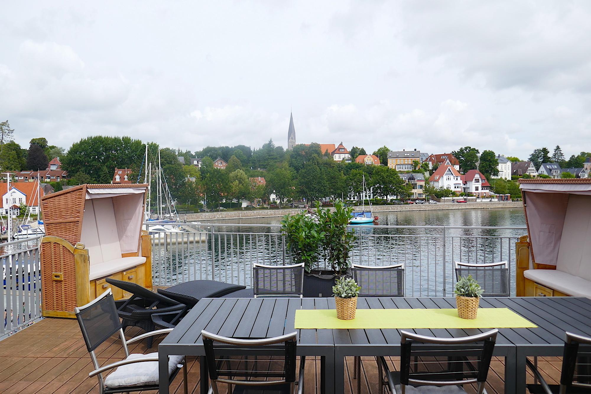 Moderne Ferienwohnung in Eckernförde mit Hafenblick, Dachterrasse und barrierefreiem Zugang direkt an der Hafenpromenade.