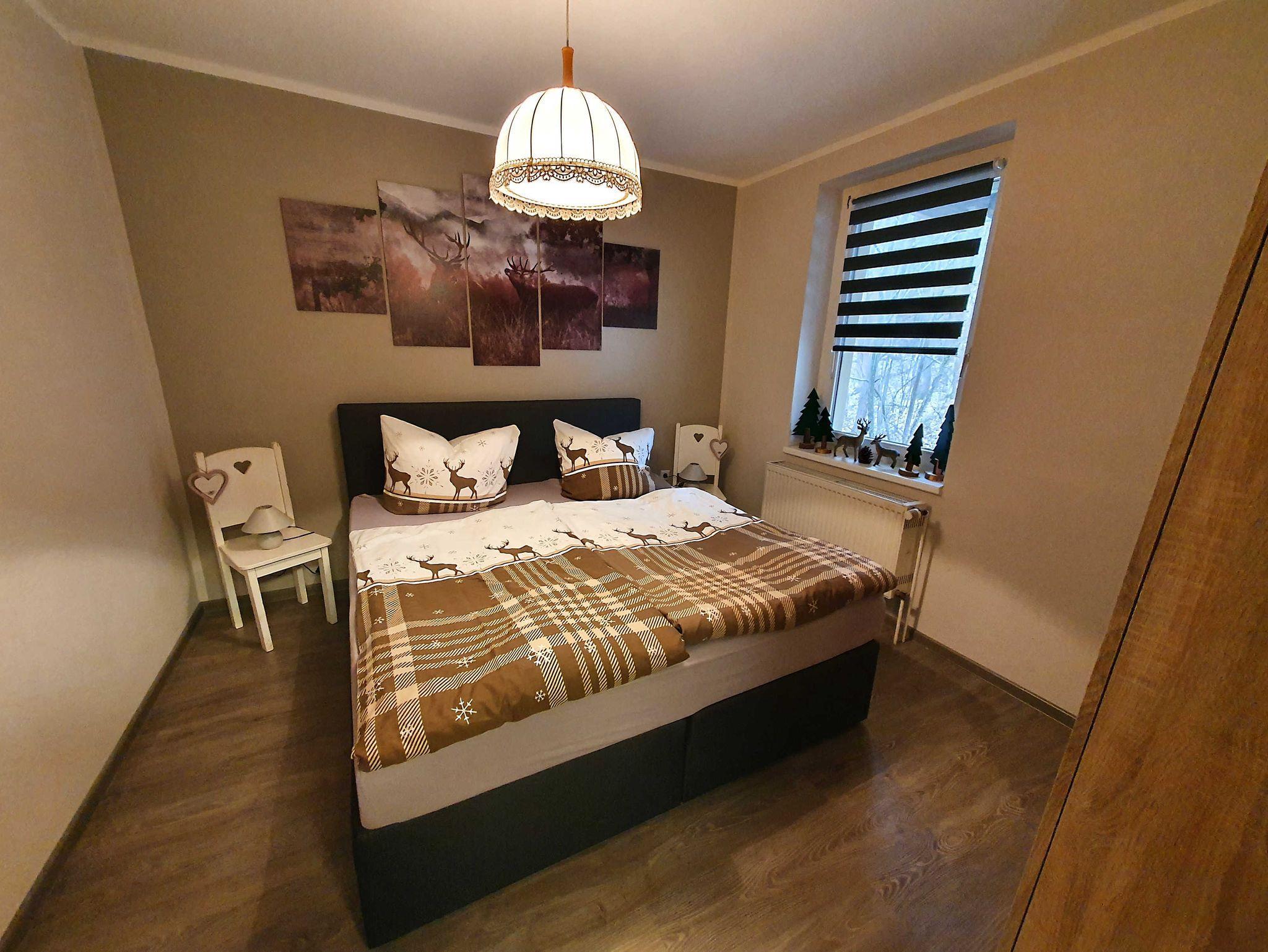 Das große Schlafzimmer liegt zur Waldseite raus, mit Blick auf die Bode, es verfügt über ein Boxspringbett 180x200m mit Kleiderschrank sowie Laminatboden.