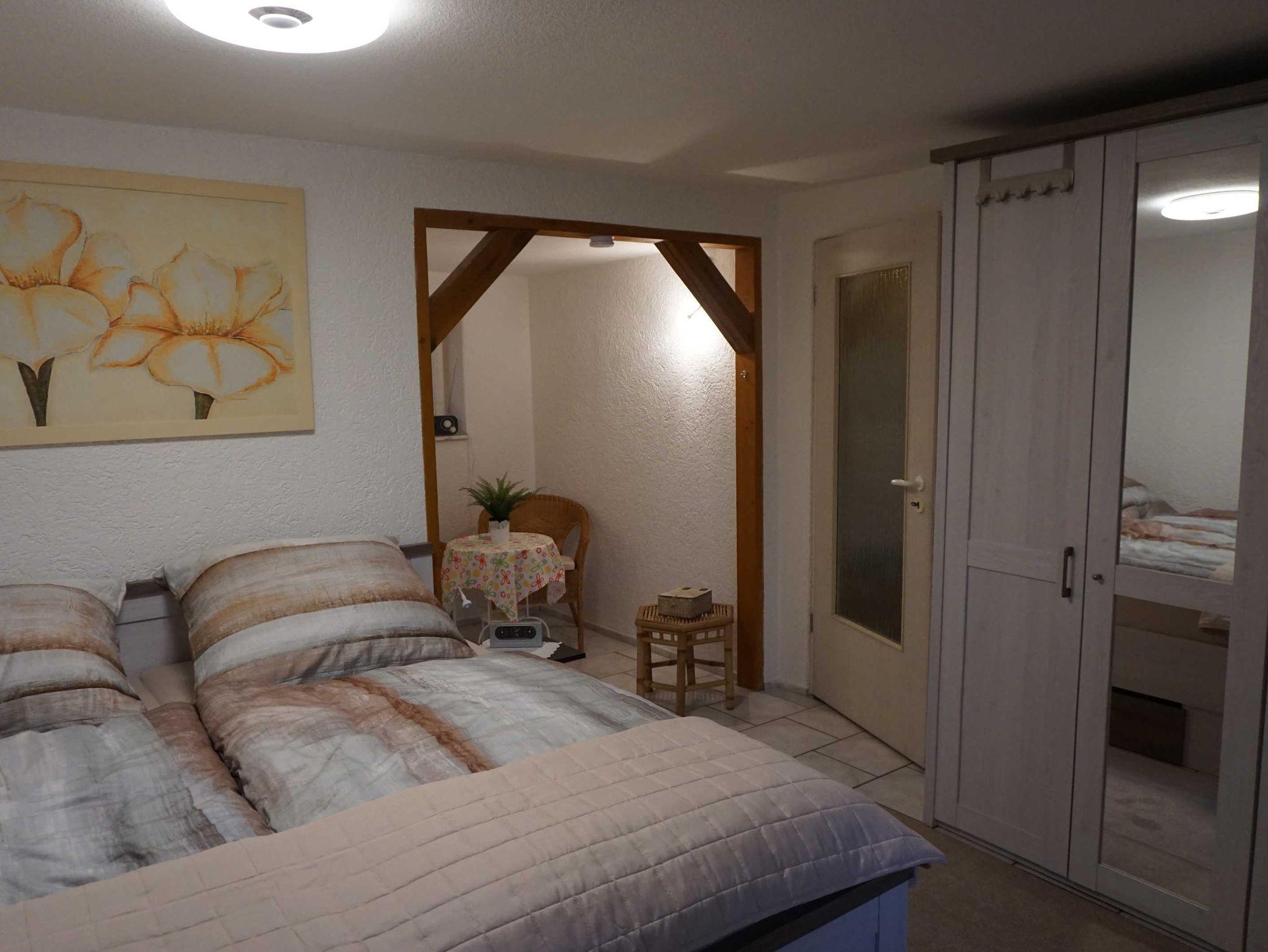 1 Schlafzimmer 1.OG mit Doppelbett, TV und Sitzgelegenheit