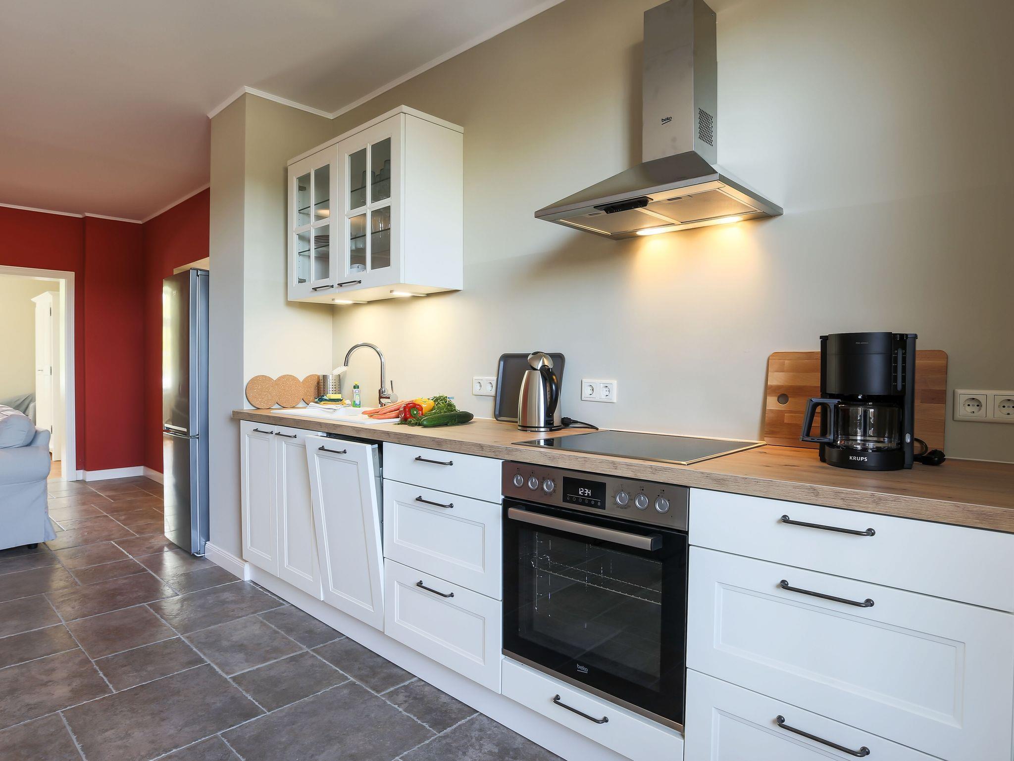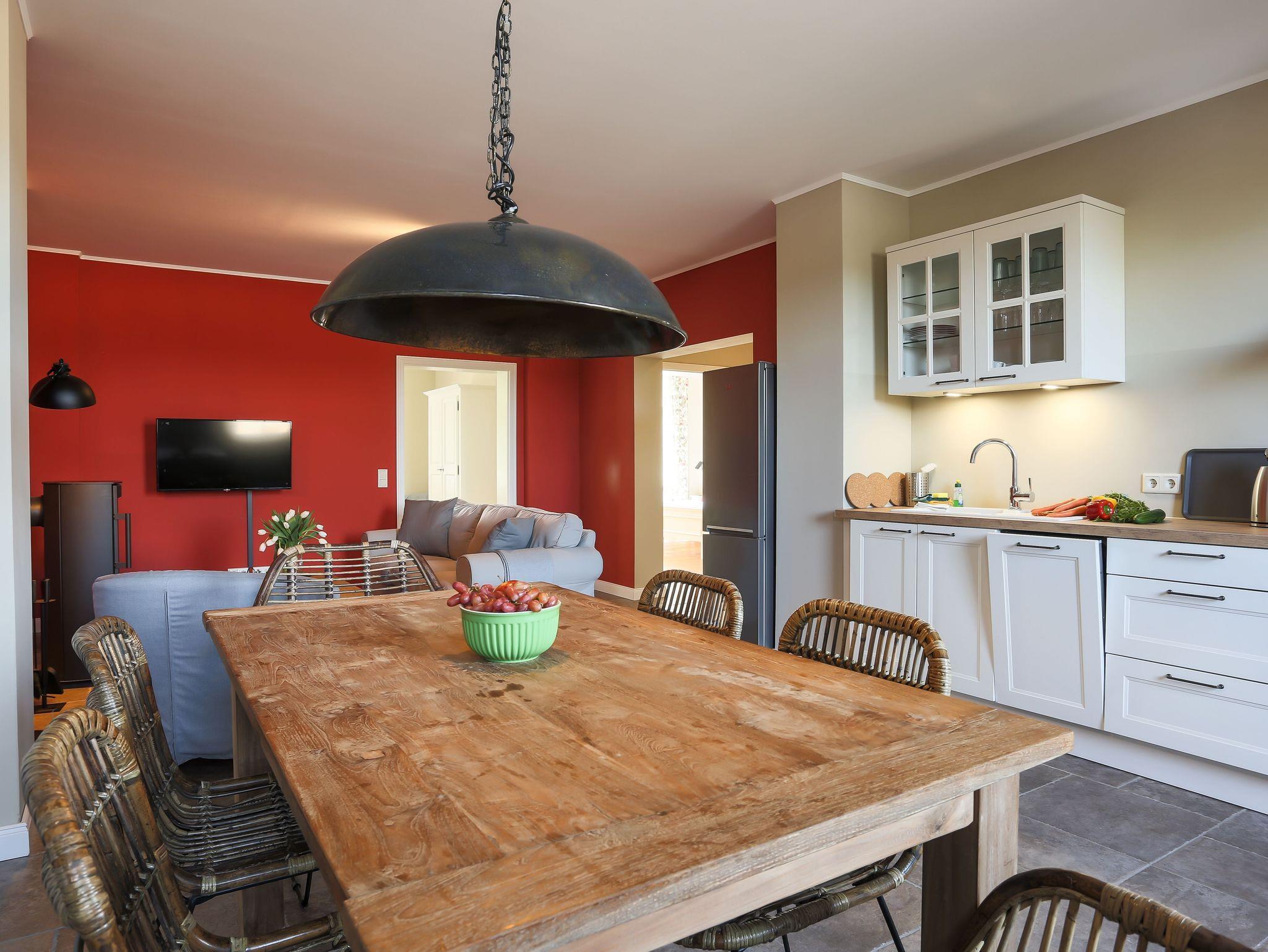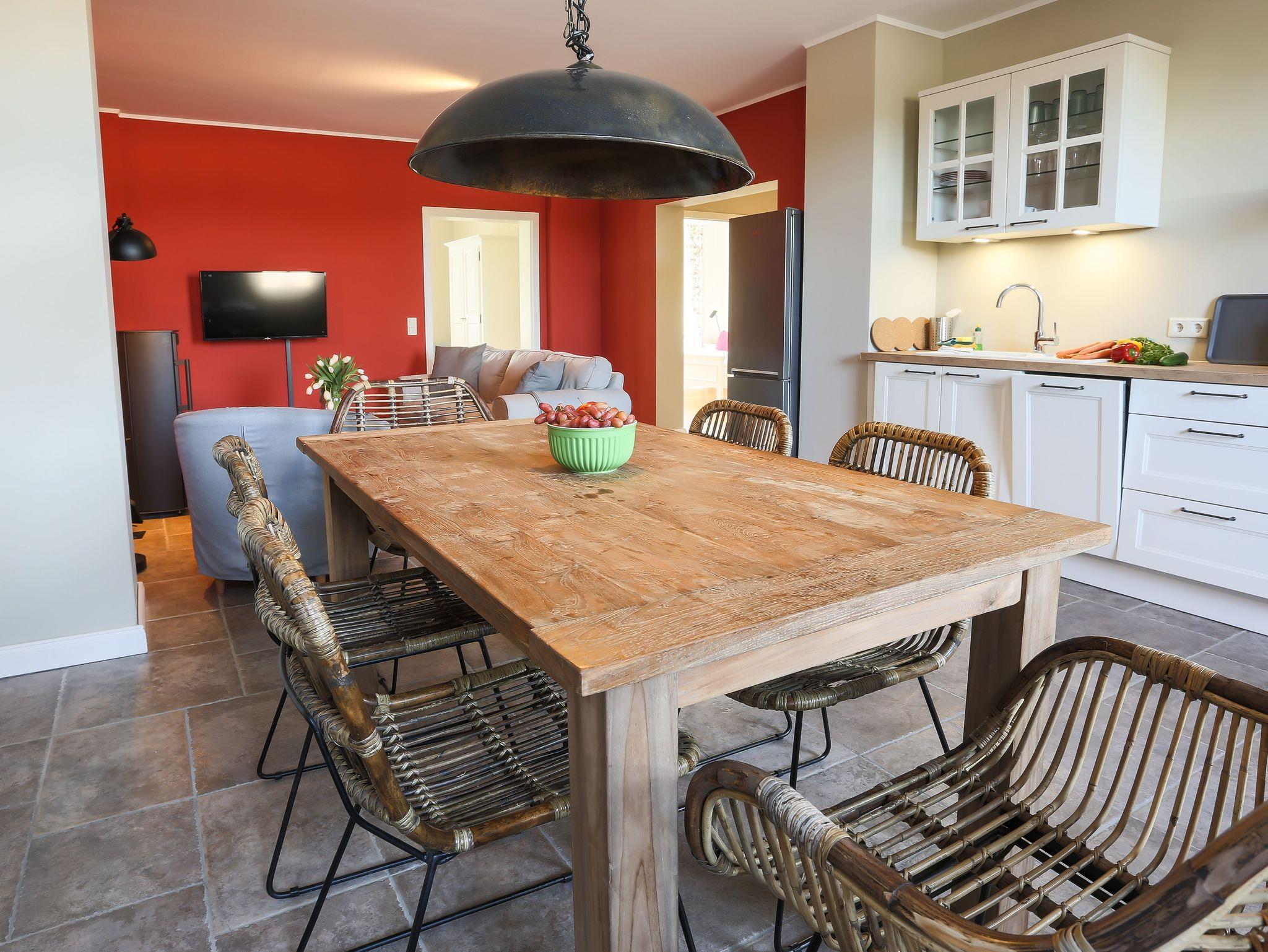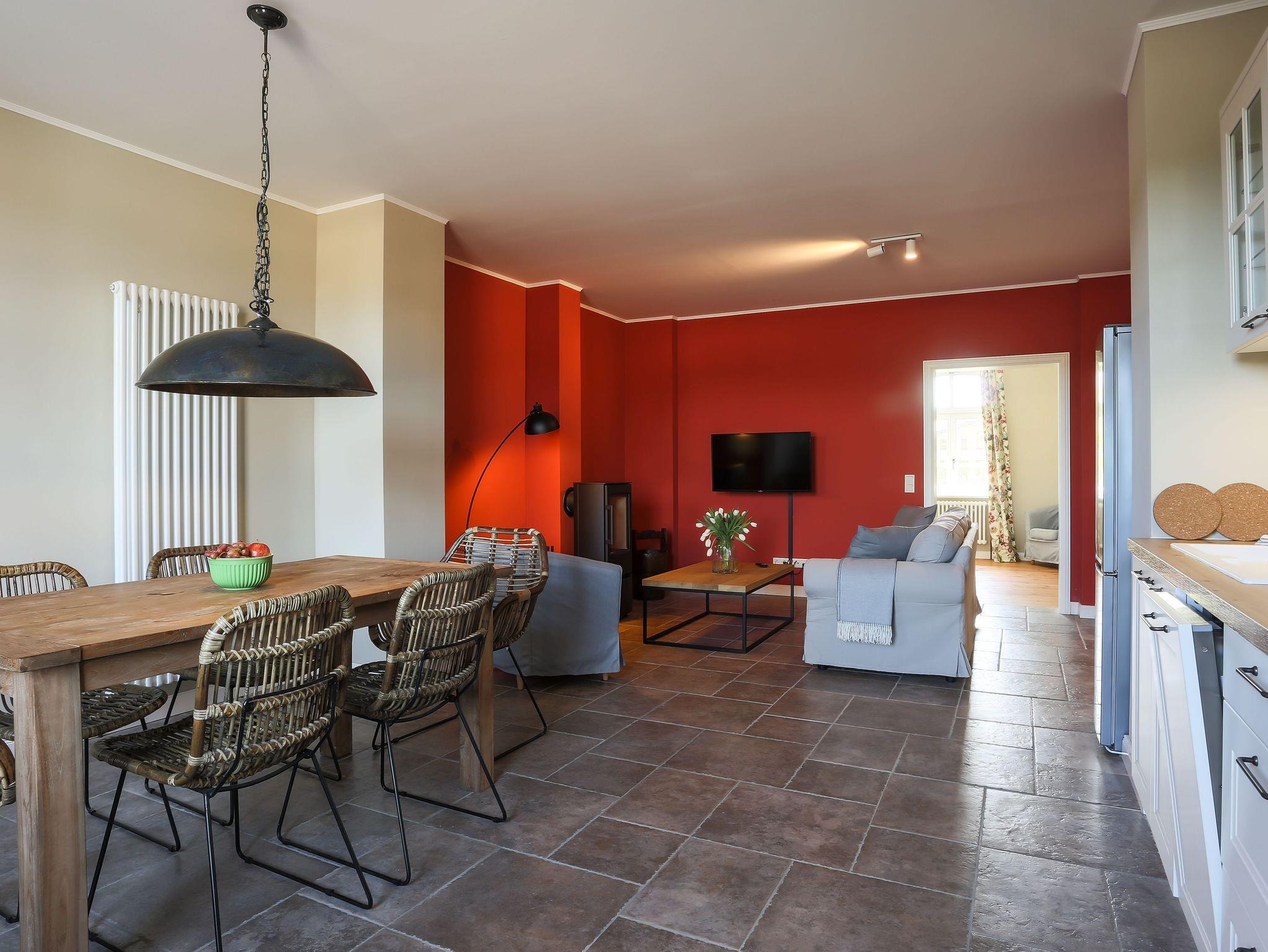 Von der Terrasse geht es gleich in die Küche. Links der große Esstisch. Rechts die komplette, moderne Küchenzeile. Angegliedert der Wohnbereich mit Sofa, Sesseln, Flachbildschirm und Kamin. Dahinter ein großes Schlafzimmer mit Doppelbett und Fenstern zum Park. Das zweite Schlafzimmer geht vom kleinen Flur ab. Es ist so groß wie das Erste, hat aber zwei Einzelbetten. Ebenfalls vom Flur geht es in das geräumige Bad mit großer Erlebnisdusche und Doppelwaschbecken. Farblich harmonisch setzt die rote Wand im Wohnbereich besondere Akzente. Selbstverständlich steht auch hier kostenloses WLAN sowie kostenfreie Parkplätze zur Verfügung. Eine Aufbettung mit Zustellbett ist möglich.