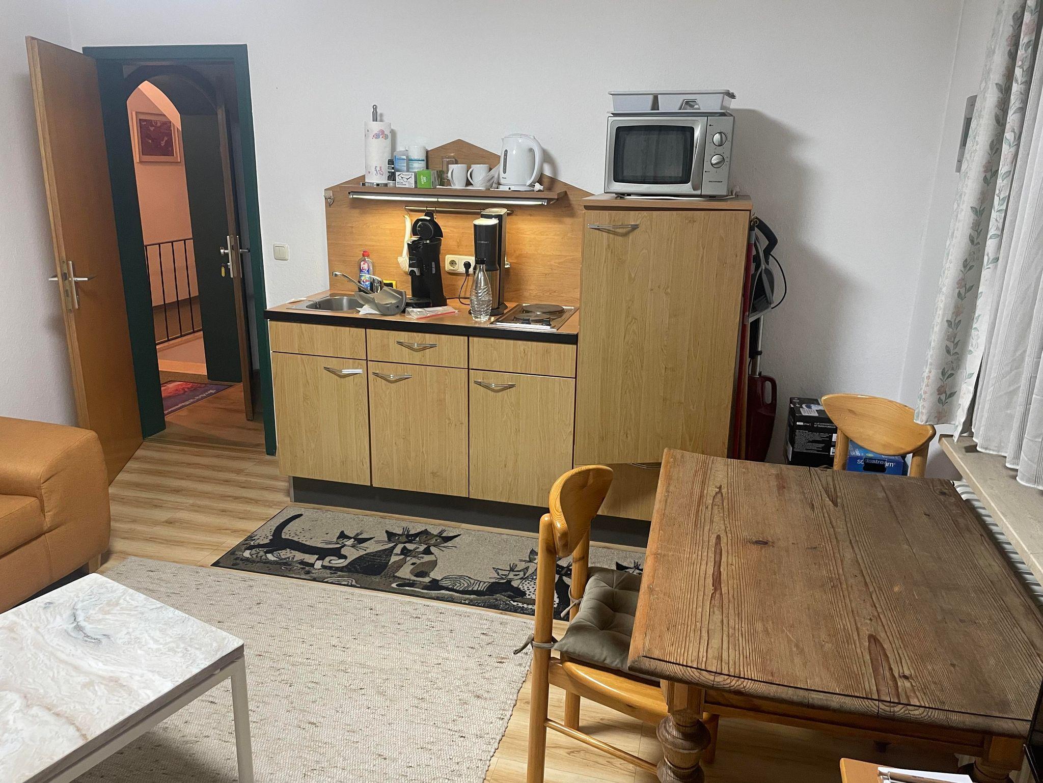 Gemütlich möblierte Ferienwohnung, Wohnküche, Schlafzimmer, Dusche mit WC, Südbalkon, TV, Radio, Toaster, Mikrowelle, Eierkocher.