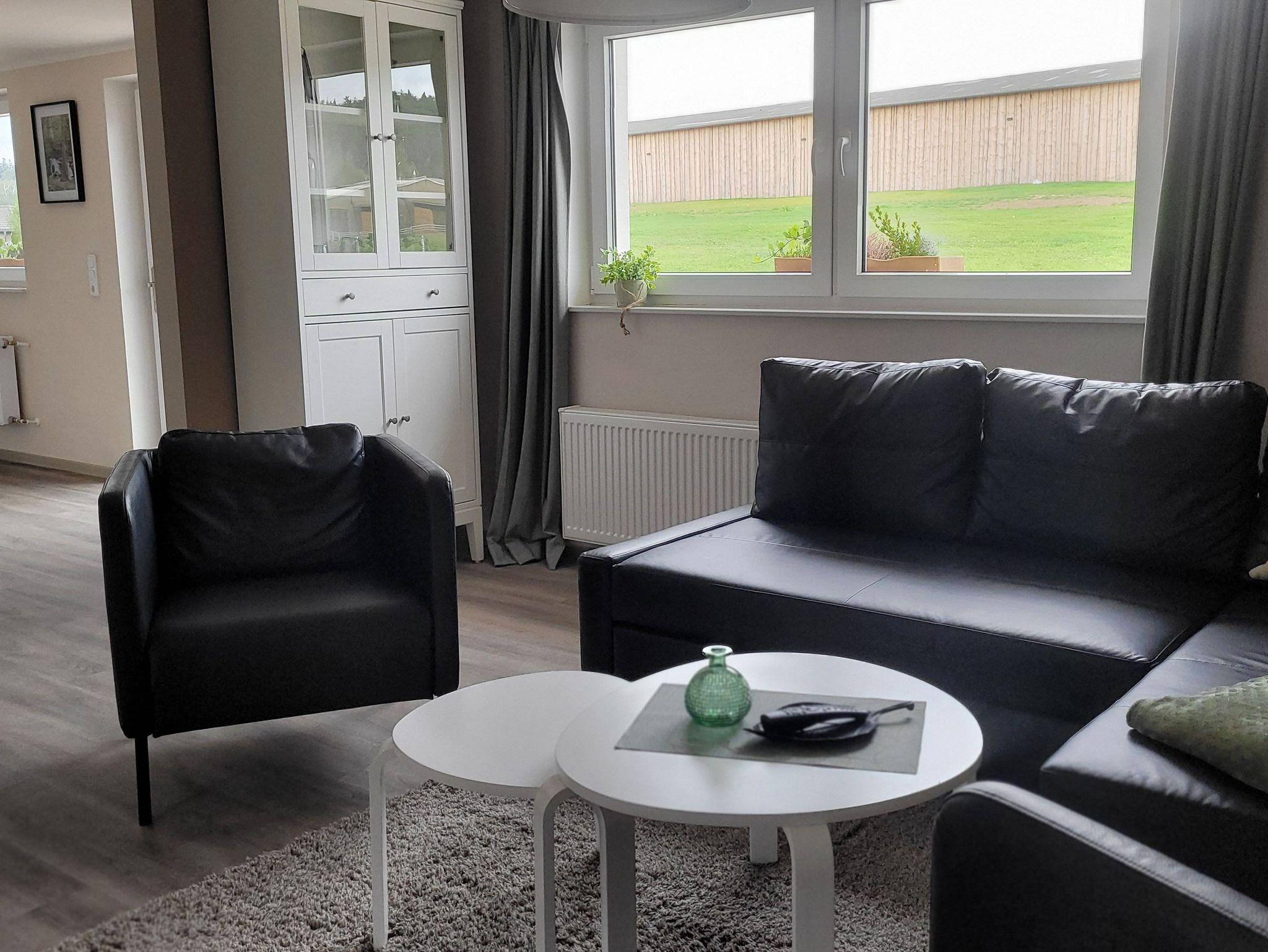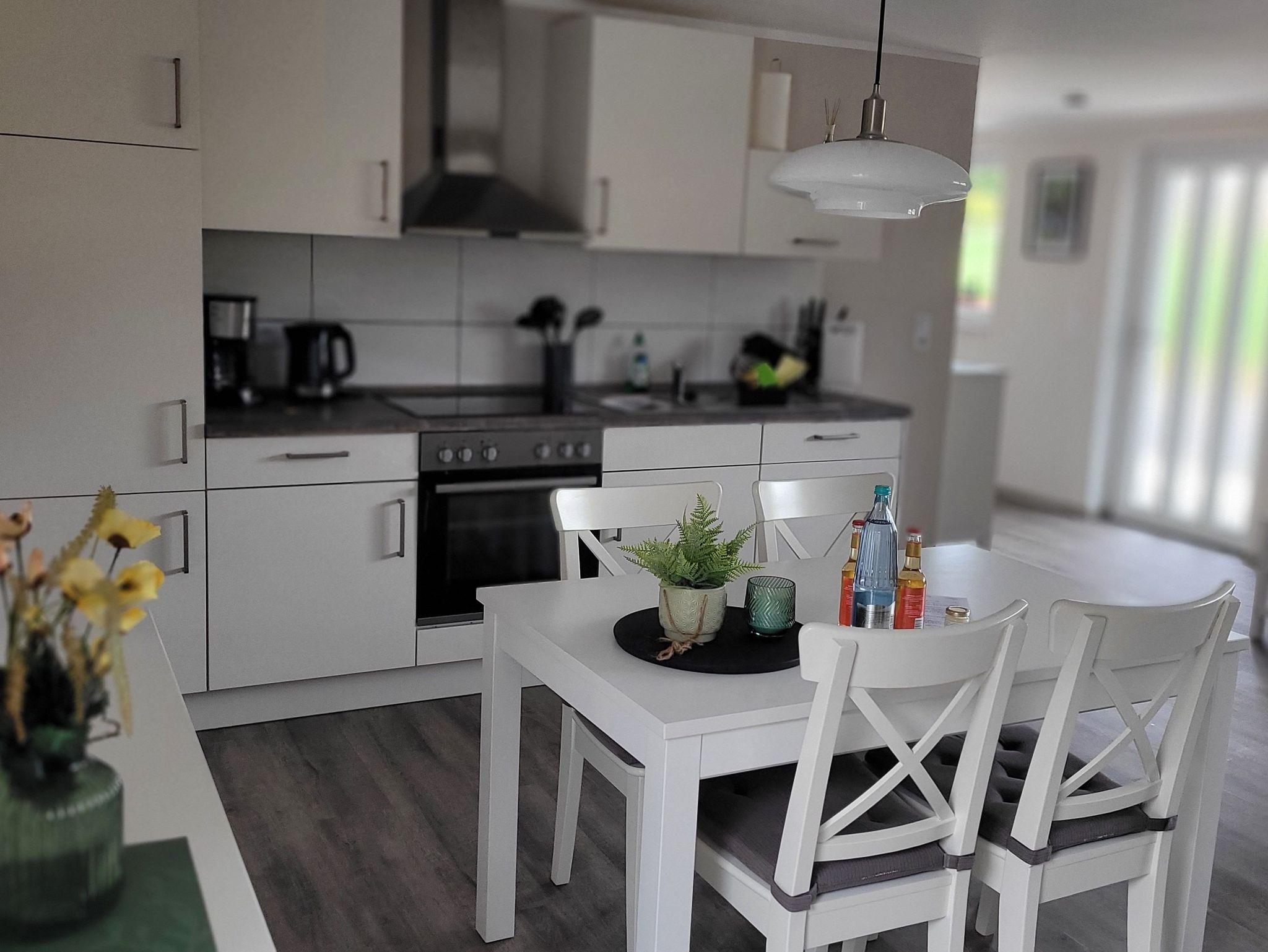 Die frisch renovierte Ferienwohnung Isi verfügt über eine modern eingerichtete Küche, ein Schlafzimmer, ein Wohnzimmer mit Flachbildfernseher und ein Bad. In dem ruhig gelegenen Schlafzimmer verbringen bis zu zwei Personen eine ausgeruhte Nacht in einem großen Doppelbett. Zwei weitere Personen finden einen gemütlichen Platz in den Einzelbetten. Für eine fünfte Person bieten wir als Aufbettung eine Schlafcouch in dem offenen Wohnbereich. In der Küche befindet sich alles, was Sie für ein leckeres Frühstück, Mittagessen oder Barbecue am Abend benötigen. Zur Ausstattung gehören eine Geschirrspülmaschine, ein Toaster, eine Kaffeemaschine, ein Backofen, ein 4-Platten-Herd und eine großzügige Ausstattung mit Ess- und Kochgeschirr. Der offene Wohn- und Essbereich lädt zum Verweilen ein. Außerdem gibt es einen direkten Zugang zu einer eigenen Holzterrasse mit kleinem Garten. Hier lassen Sie den Alltag hinter sich und die Seele baumeln. Gönnen Sie sich eine Tasse Tee oder Kaffee auf unseren modernen Gartenmöbeln im Outdoorbereich. Ihr Fahrzeug können Sie direkt an der Ferienwohnung parken - es steht sicher auf unserem Gelände. Wir freuen uns nun, Sie auf dem Falkenhof in Meisdorf begrüßen zu dürfen und wünschen Ihnen eine gute Zeit.