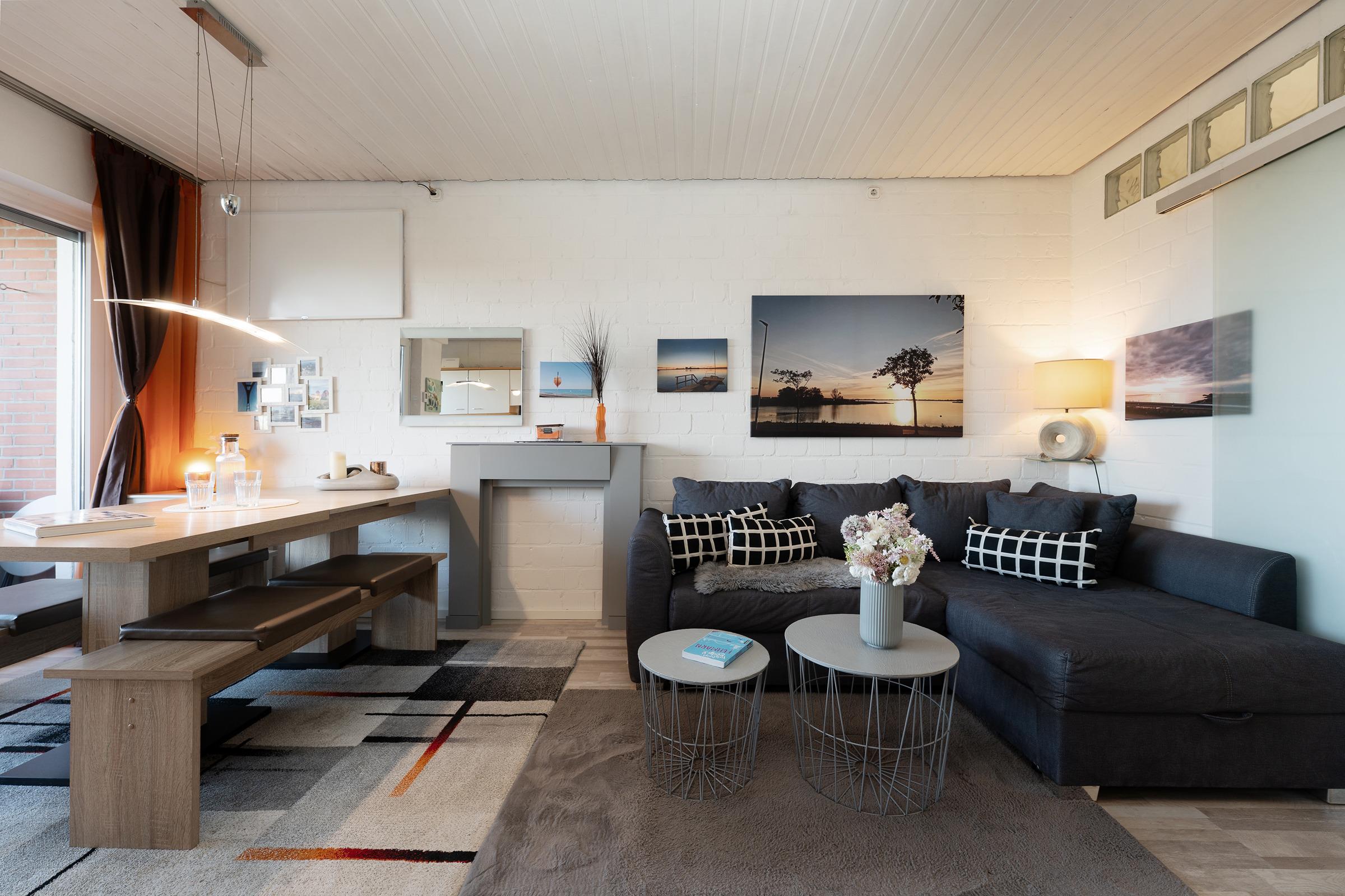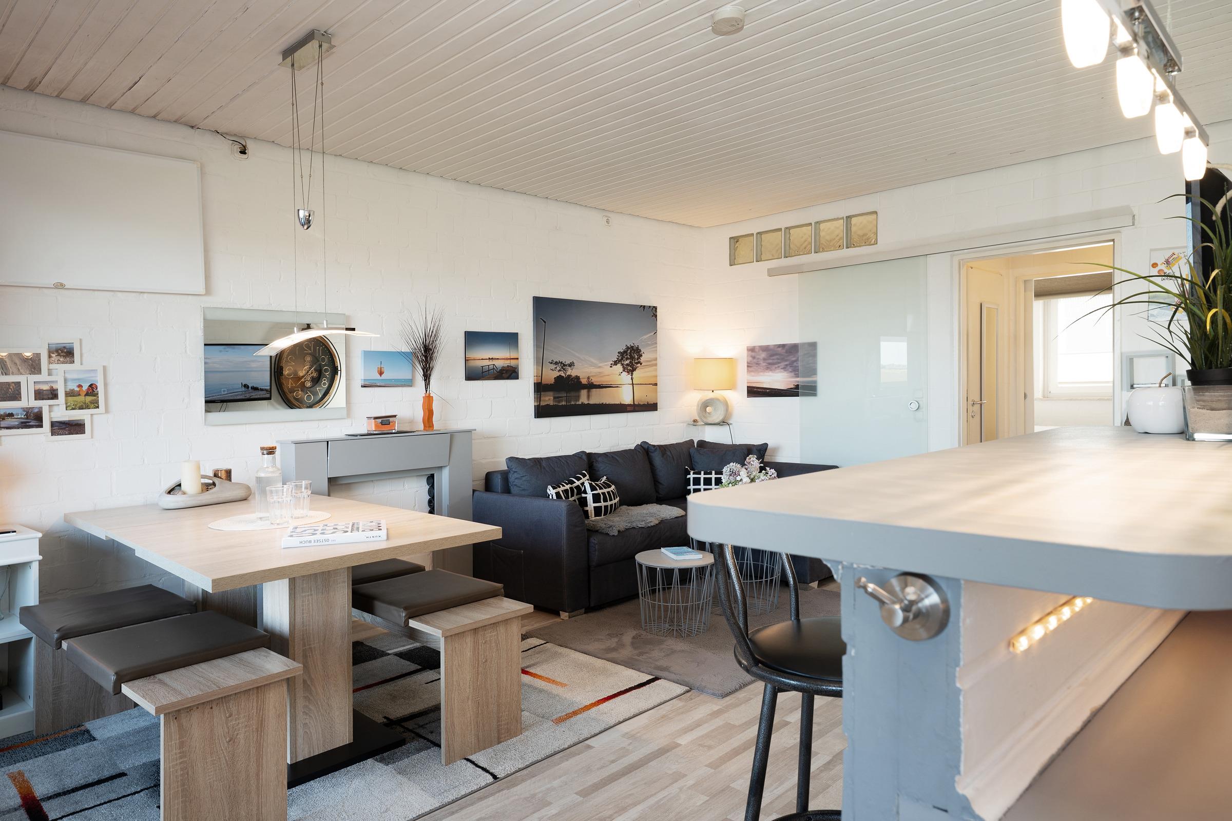 Der helle Wohnbereich lädt mit gemütlicher Sitzecke, Fernseher und Kaminofen zu entspannten Stunden ein. Von hier aus gelangen Sie auf die möblierte Terrasse, die mit Gartenmöbeln und Strandkorb ausgestattet ist und zum Verweilen im Freien einlädt. Die offene Küchenzeile verfügt über moderne Geräte wie Backofen, Geschirrspülmaschine, Kühlschrank, Backmikrowellenkombination, Kaffeepadmaschine und ermöglicht eine komfortable Selbstverpflegung. Im angrenzenden Essbereich finden alle Gäste ausreichend Platz für gemeinsame Mahlzeiten. Das separate Schlafzimmer ist mit einem komfortablen Doppelbett eingerichtet und verspricht erholsame Nächte. Zusätzlich steht im Wohnbereich ein Schlafsofa zur Verfügung. Das Badezimmer ist modern ausgestattet und bietet eine Dusche für die Erfrischung am Morgen.