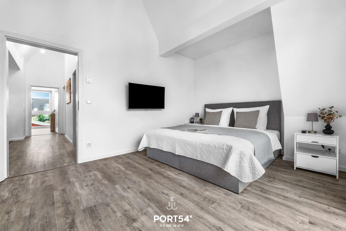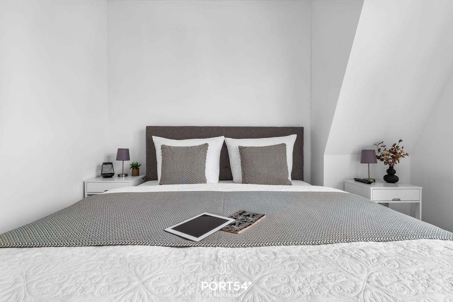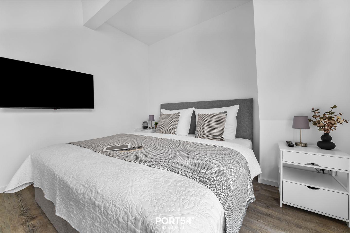 * Eines der Schlafzimmer hat ein großes Doppel-Boxspringbett (180x200 cm – passend für ein Spannbettlaken) für zwei Personen.