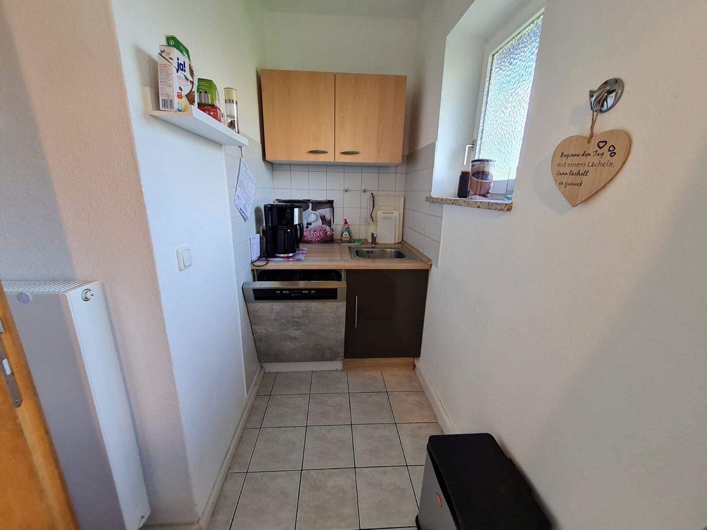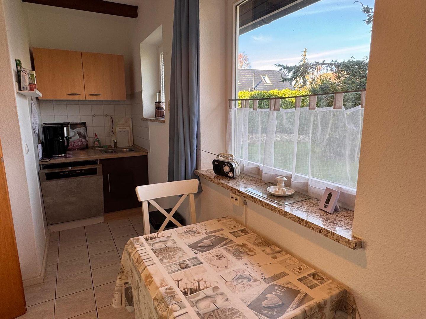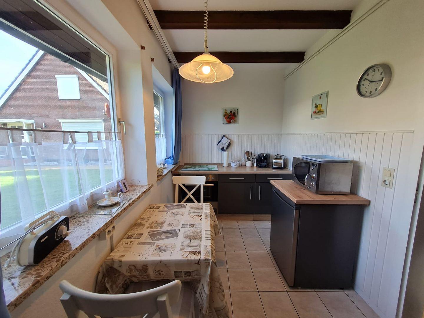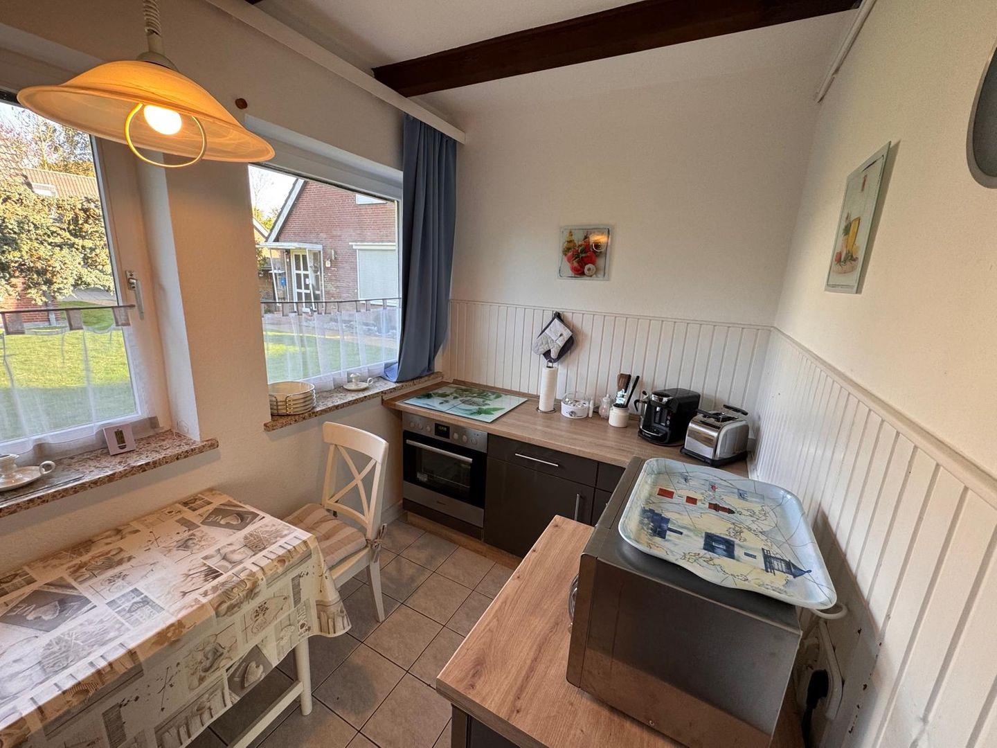 Die geschlossene Küche ist voll ausgestattet und ideal auf Selbstversorger zugeschnitten. Neben Ceranfeld, Backofen, Kühlschrank mit Gefrierfach (im Kühlschrank integriert), Spülmaschine, Mikrowelle, Wasserkocher, Kaffeemaschine, Toaster und Eierkocher stehen ausreichend Geschirr und Besteck zur Verfügung. So können Sie Ihre Lieblingsgerichte einfach zubereiten und diese anschließend im angrenzenden Essbereich mit Esstisch genießen.