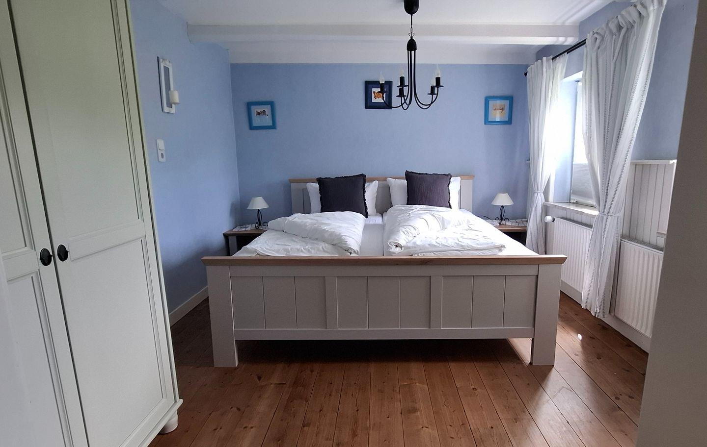 Über eine schmale Treppe gelangen Sie ins Obergeschoss, wo Sie zwei weitere Schlafzimmer mit Doppelbett erwarten. Hier oben befindet sich außerdem eine kleine, liebevoll gestaltete Spielecke – ein Highlight für kleine Gäste – sowie ein zusätzliches Gäste-WC mit Waschbecken und Toilette.
