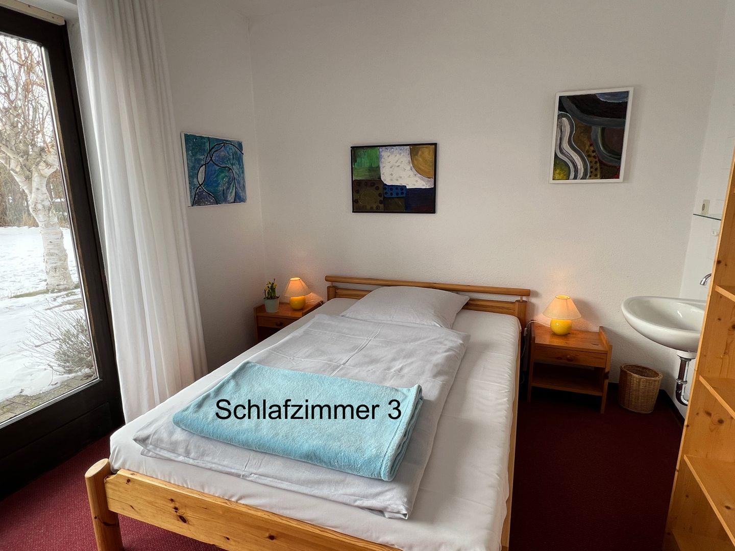 • Schlafzimmer 3 mit Bett (140 cm), eigenem Waschbecken und Zugang zur Süd-Terrasse, Belegung: 1 Erwachsener oder 2 Kinder