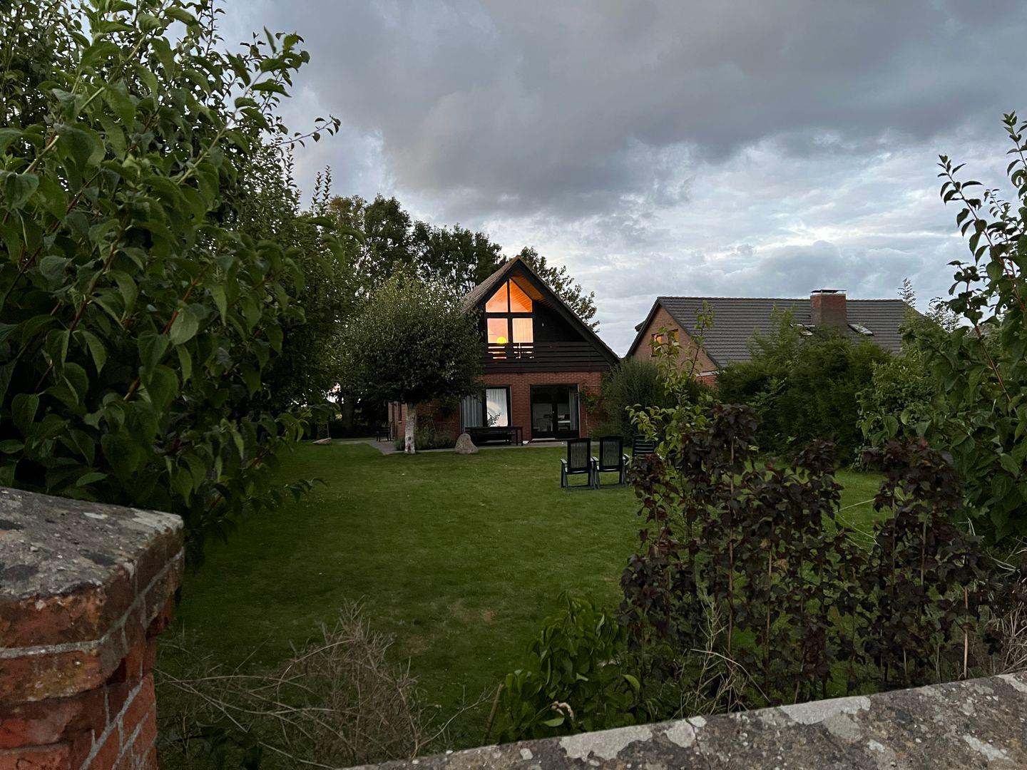 Im Außenbereich finden sie eine große Terrasse mit Südausrichtung sowie eine kleinere Terrasse im Westen des Hauses. Die große Rasenfläche eignet sich als Liegewiese oder Spielfläche für die Kinder. Für gemütliche Abende stehen Gartenmöbel und ein Holzkohlegrill bereit, dessen Reinigung der Mieter allerdings selbst übernehmen muss.