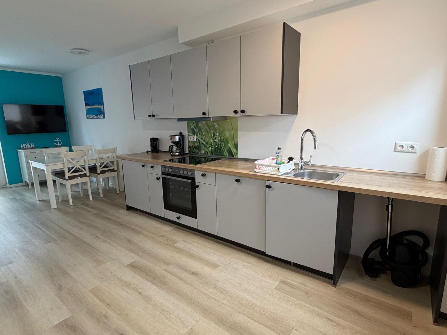 Der helle Wohnbereich mit gemütlicher Sofaecke, Esstisch und TV lädt zum Verweilen ein. Die offene, gut ausgestattete Küche mit Ceranfeld, Backofen, Spülmaschine und Kaffeemaschine macht die Selbstversorgung ganz einfach.