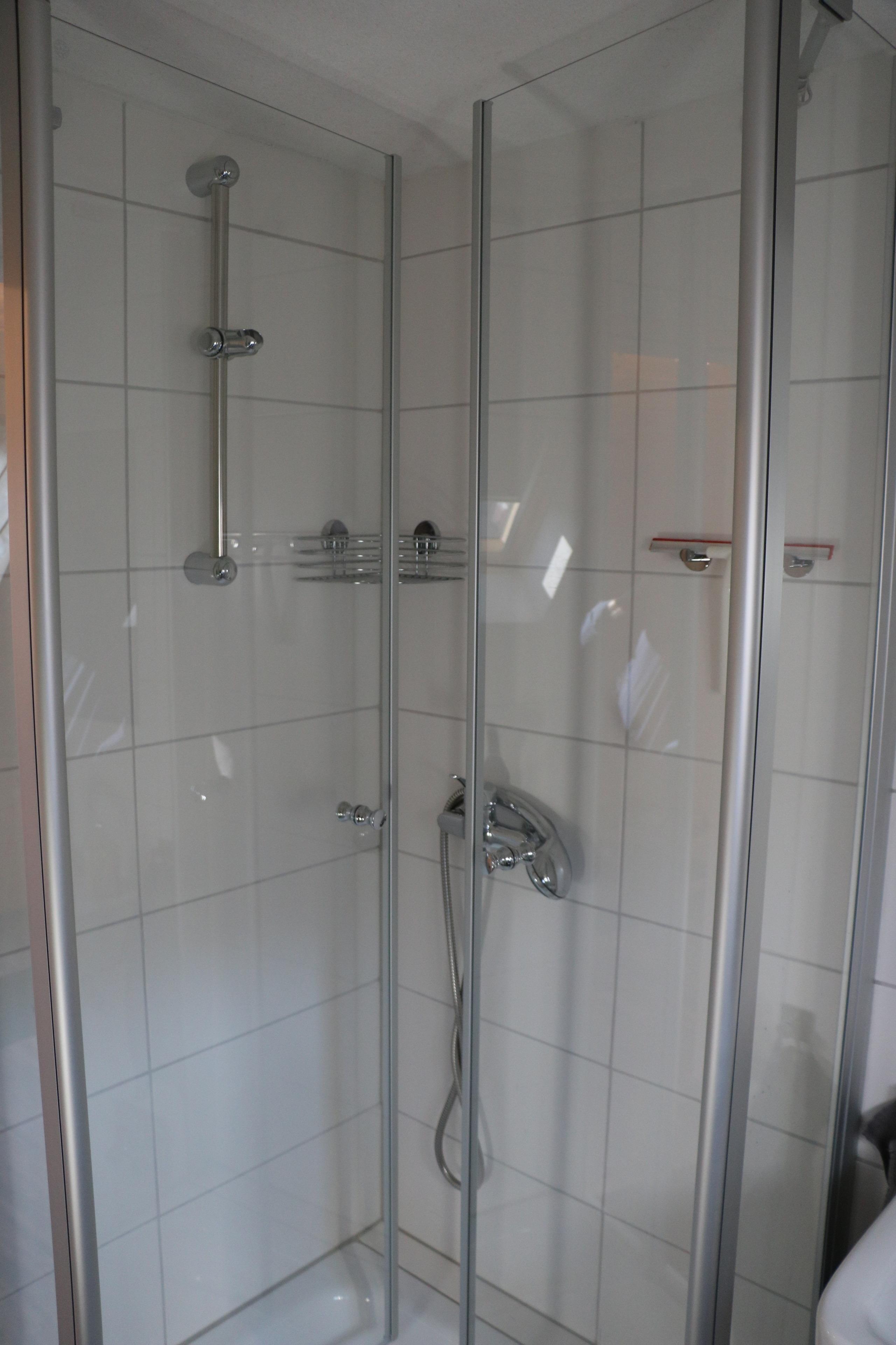 Im Badezimmer gibt es ein Waschbecken, eine Dusche und ein WC.