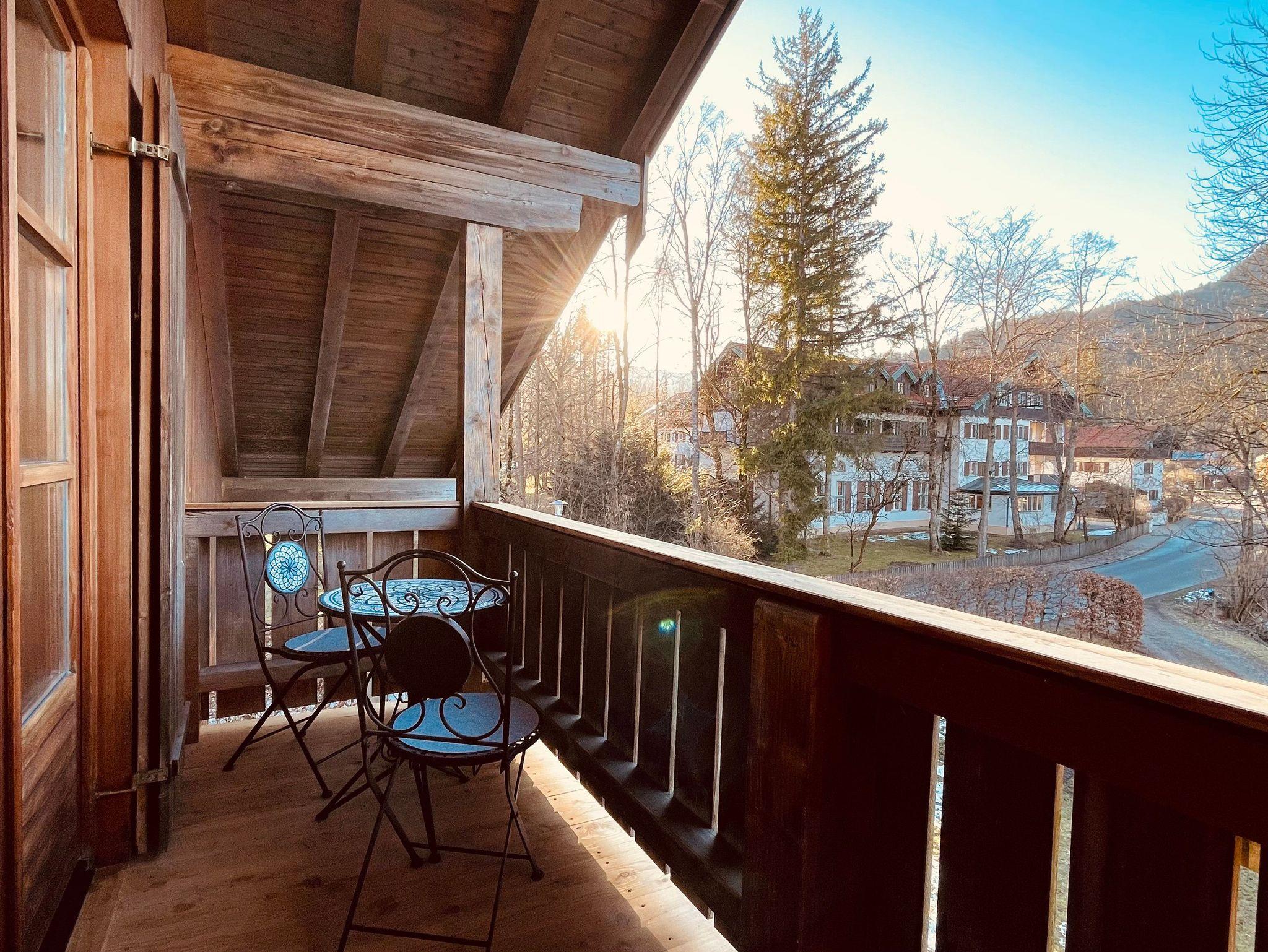 Hochwertige Ausstattung (Naturholzausbau), ruhige Lage, Westbalkon mit Berg-, Bach- und Talblick, Nichtraucherwohnung, Fußbodenheizung, Terracotta- Kork- und Fliesenboden, spaltenfreies Bett der Größe 180 x 200 cm, antiker Hornschlitten als zusätzliches Ruhemöbel.