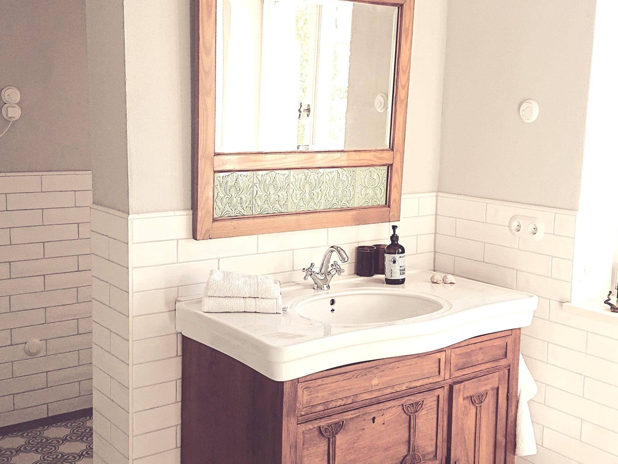 Das Badezimmer ist mit WC, Dusche und Badewanne ausgestattet, außerdem befindet sich hier eine Waschmaschine und ein Wäscheständer. Ein weiteres WC befindet sich auf halber Treppe.