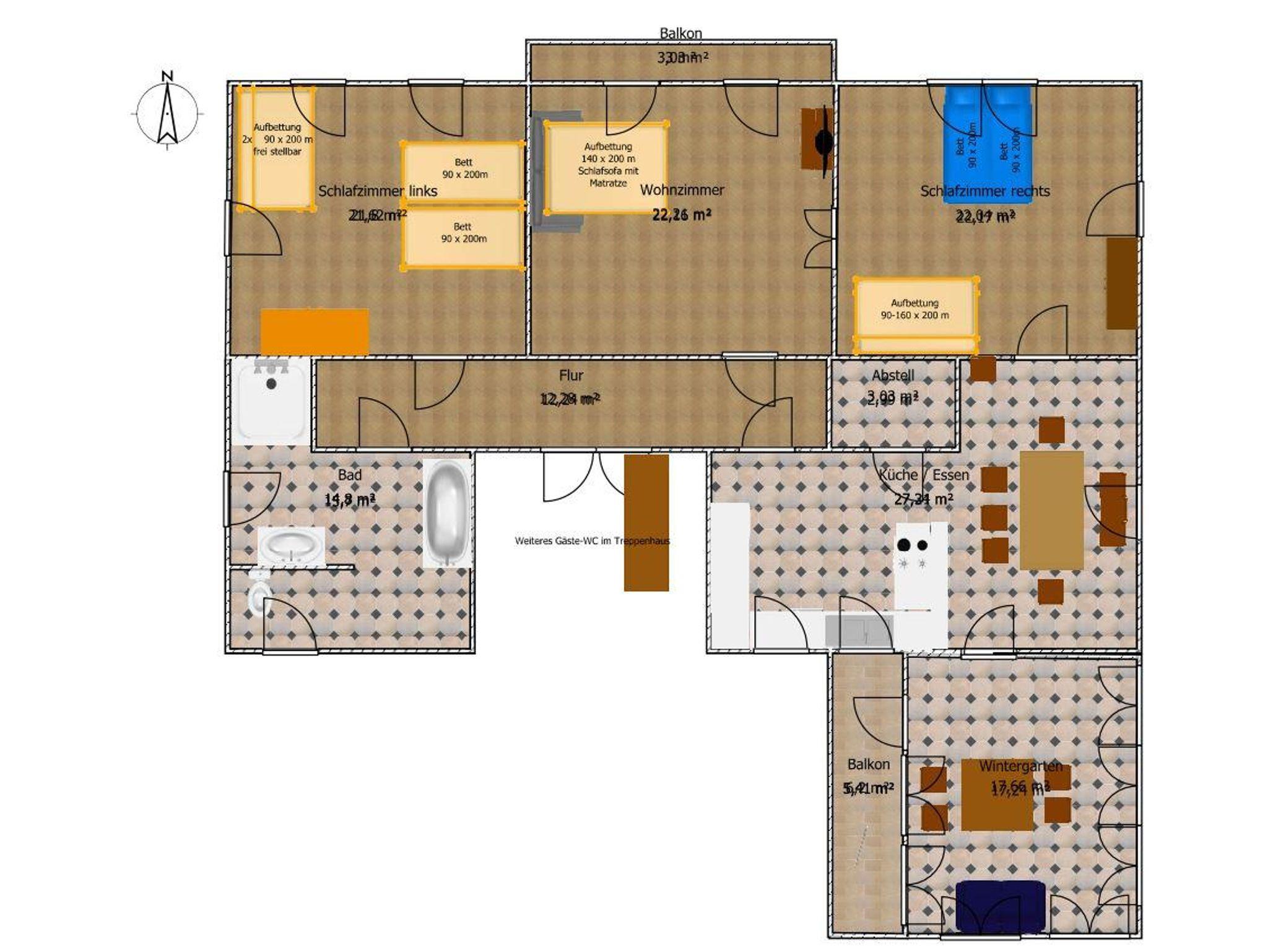 Die Schlafzimmer sind jeweils mit einem Doppelbett (180 x 200 m) ausgestattet und jeweils einem Gästebett mit hochwertigen Matratzen.