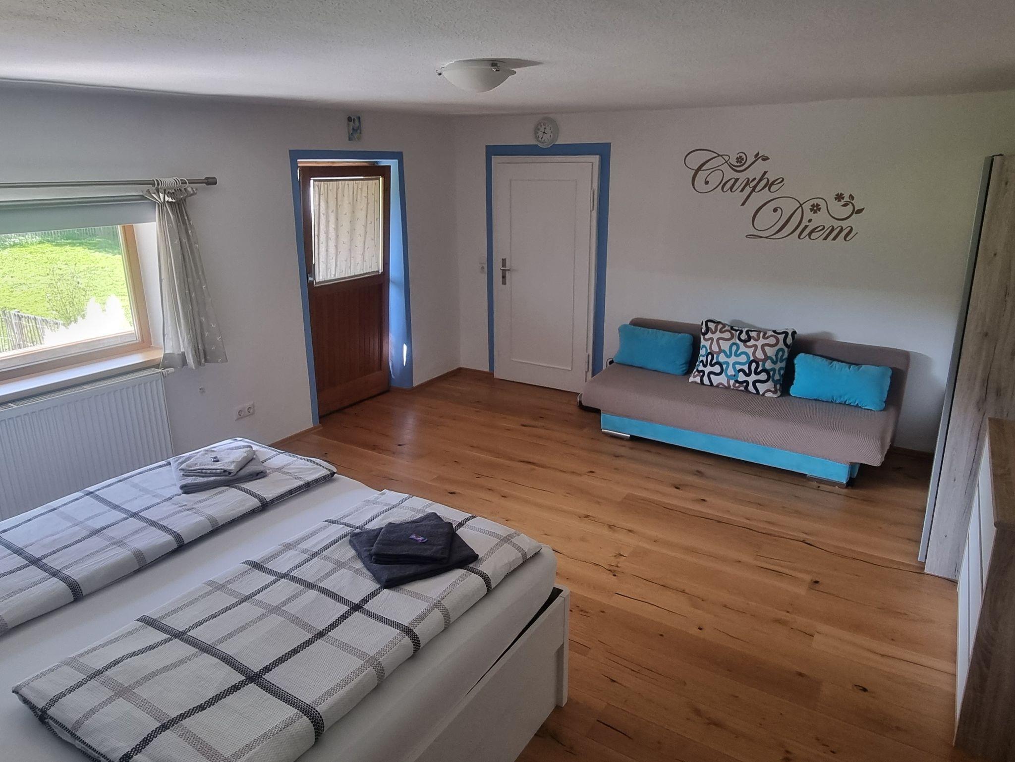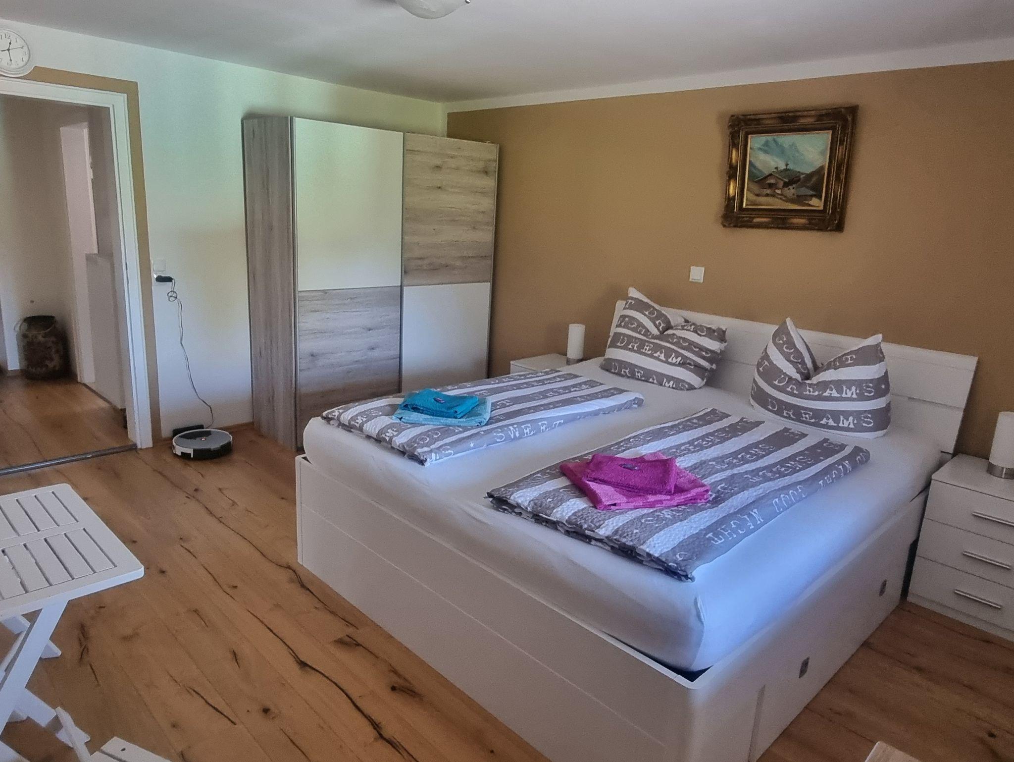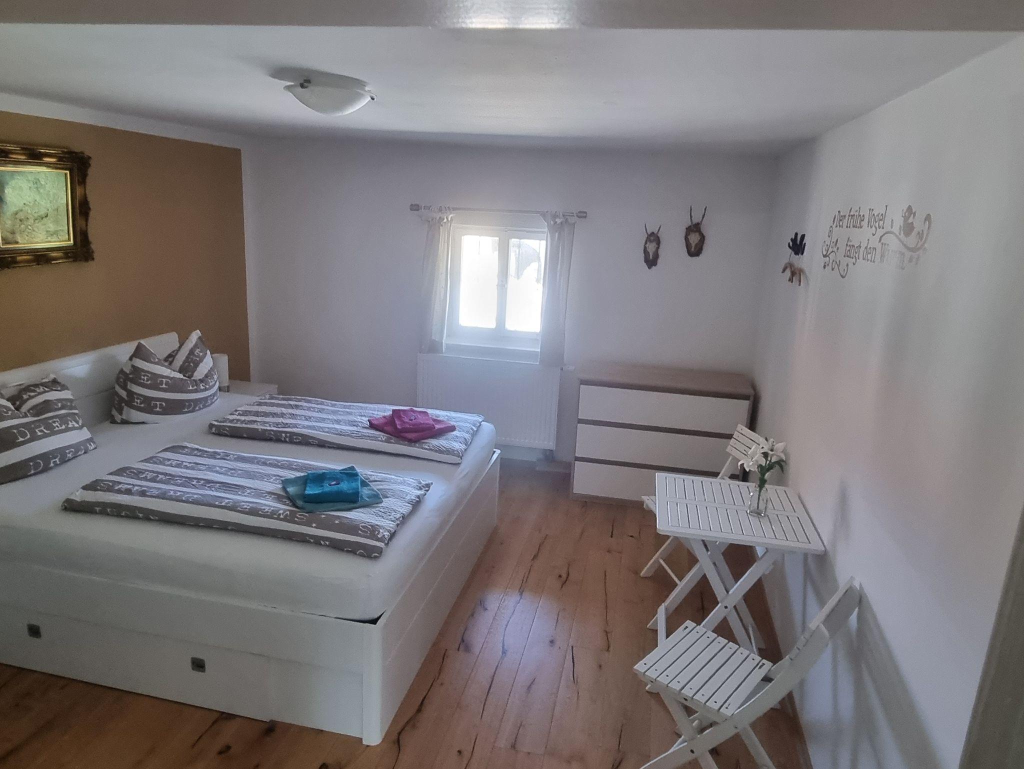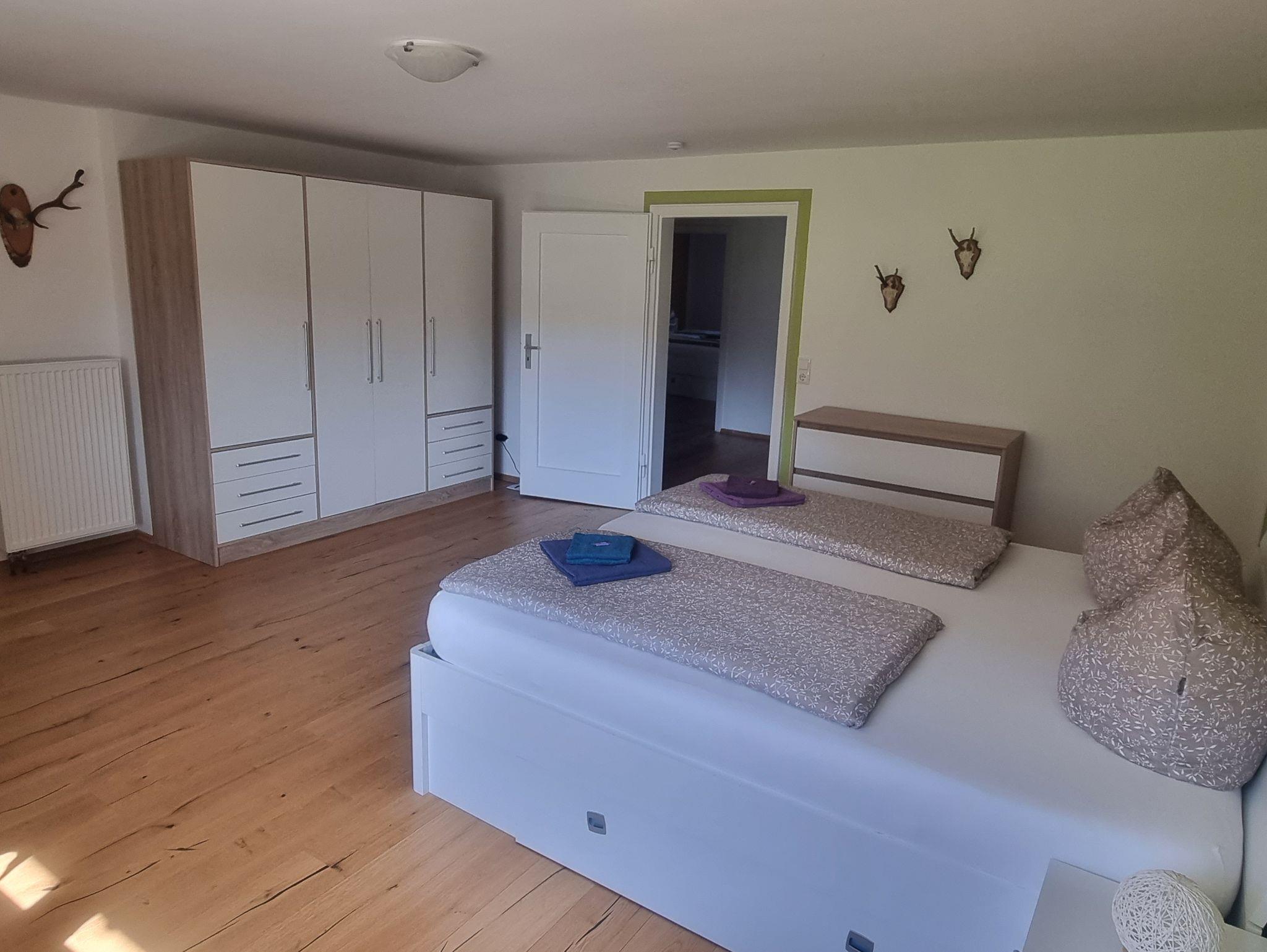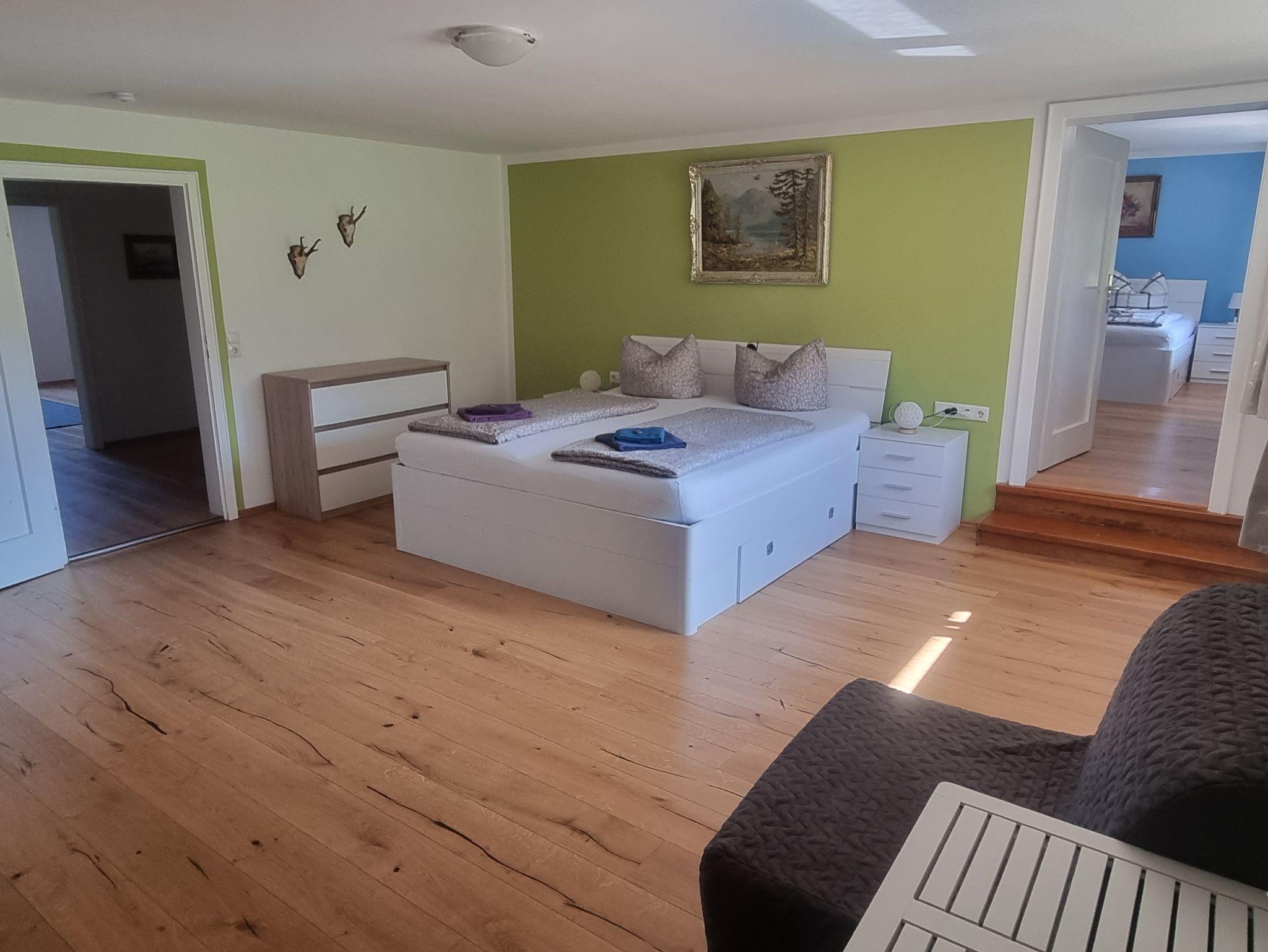 Die FeWo verfügt über 3 separate Schlafzimmer (24 qm/23 qm/16 qm) mit je einem Doppelbett. Das größte Zimmer verfügt über ein Bad en Suite mit Badewanne und eigenem Zugang zur Sauna (gegen Gebühr, Handtücher für die Sauna müssen selbst mitgebracht werden). Den anderen Zimmern steht ein Duschbad zur Verfügung. Im mittelgroßen Zimmer lädt ein Südbalkon mit traumhaften Bergblick zum Erholen und Entspannen ein.